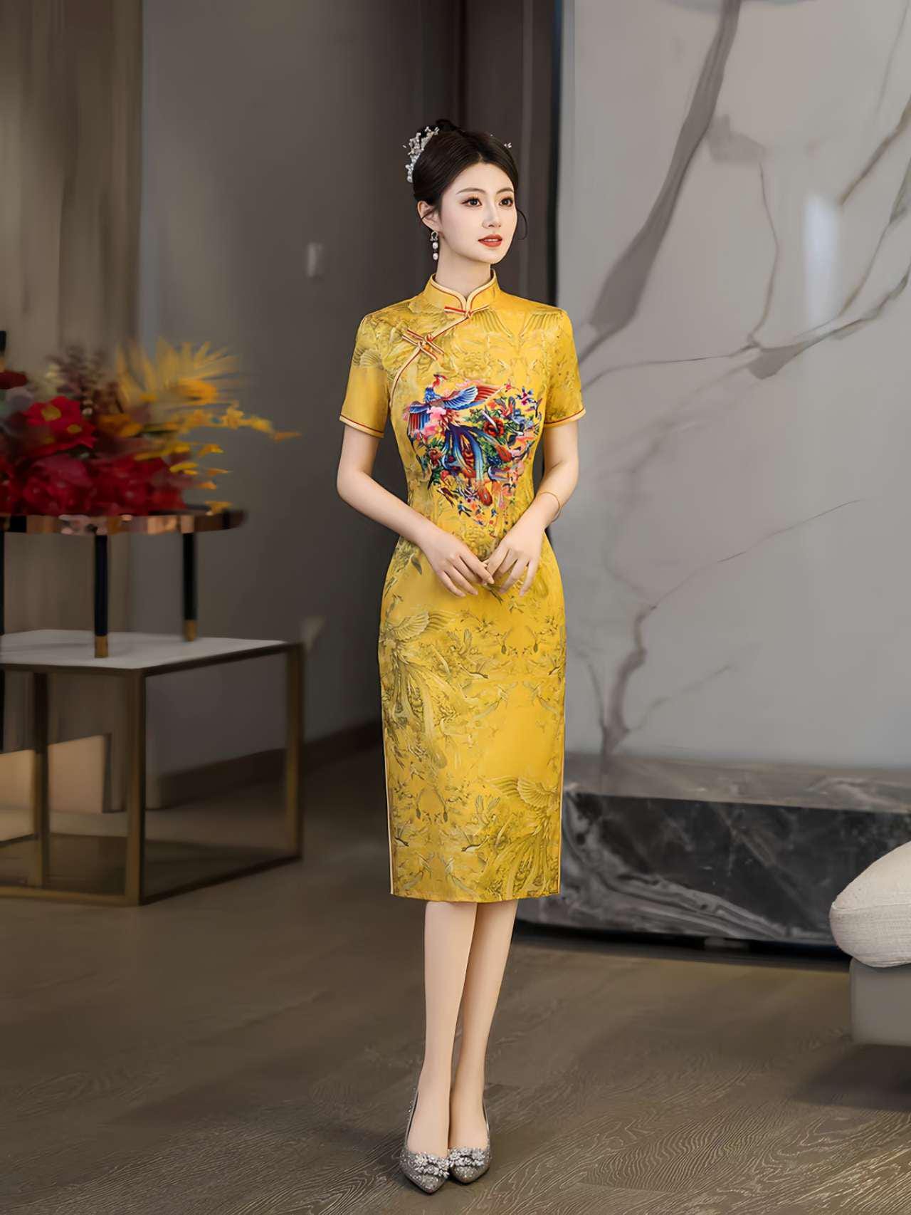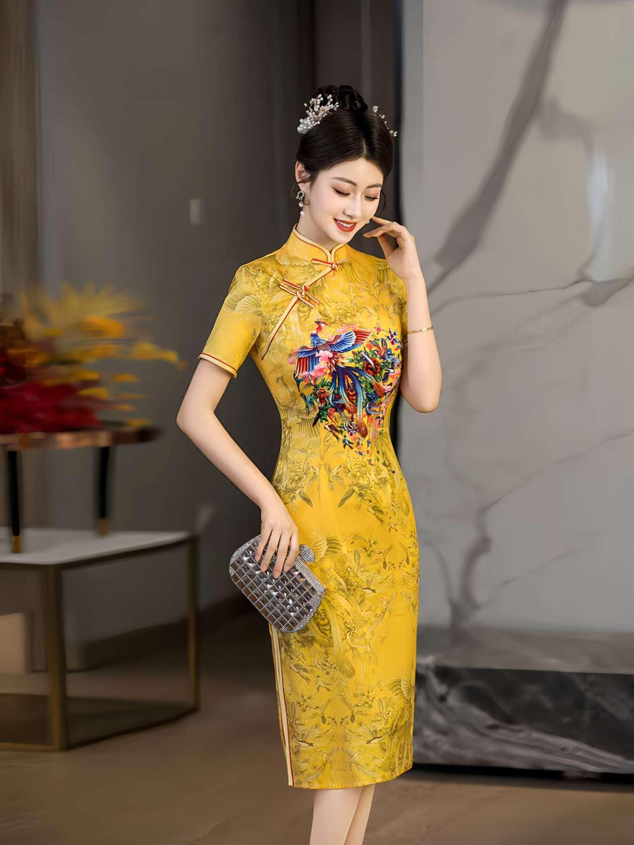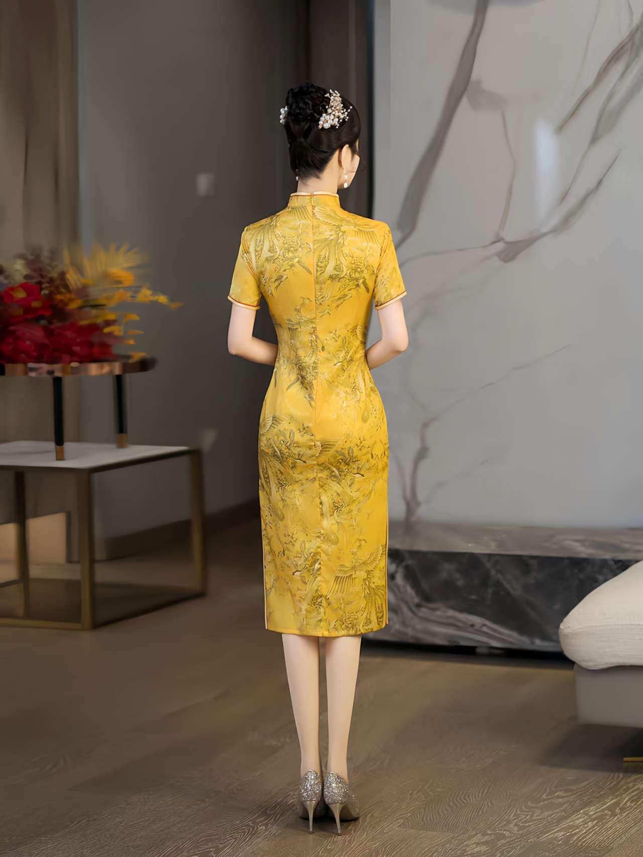 Yellow Phoenix Qipao, Short Cheongsam Dress, Chinese Party Dress, Oriental Cocktail Dress, Retro Wedding Guest Dress