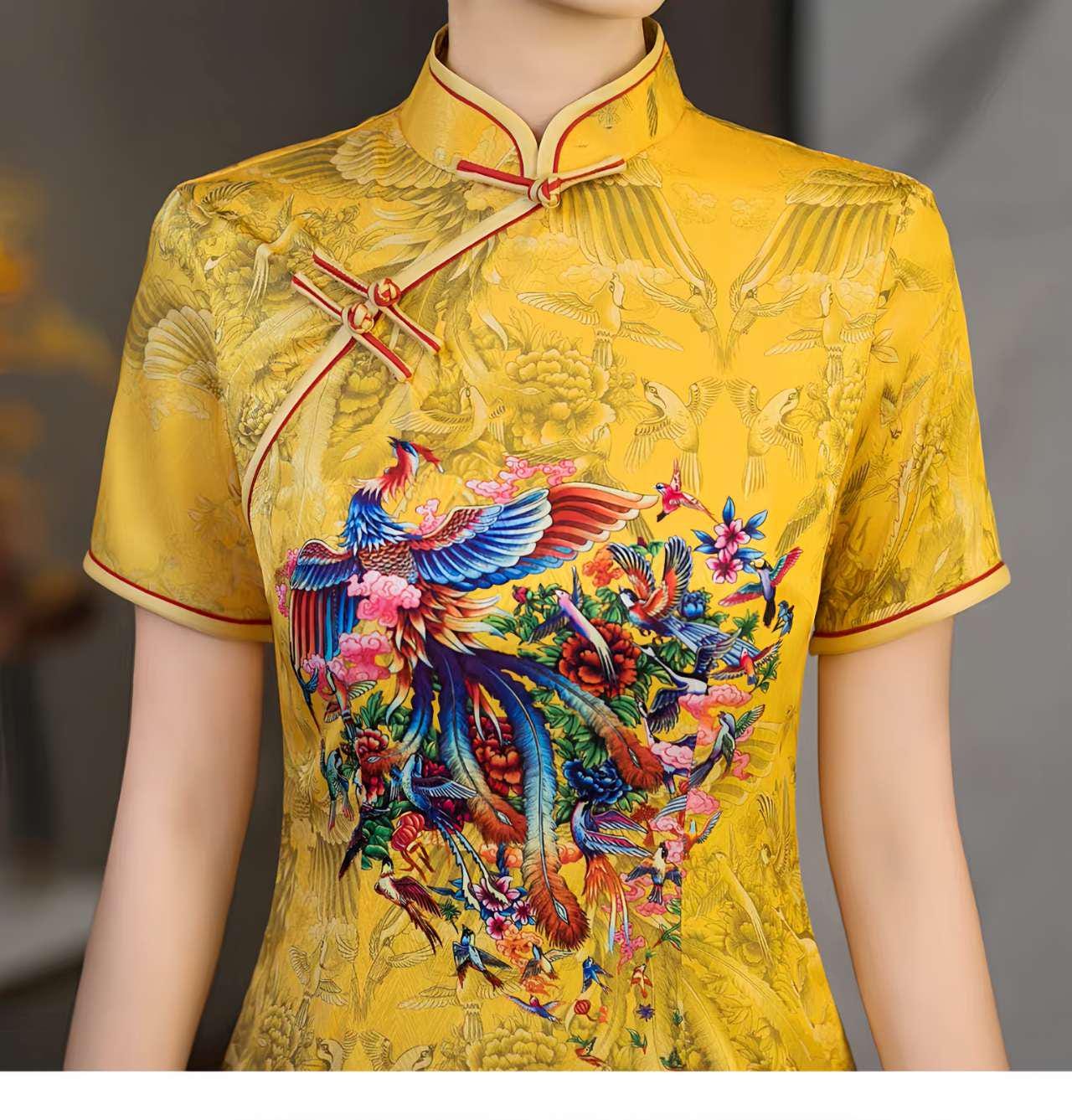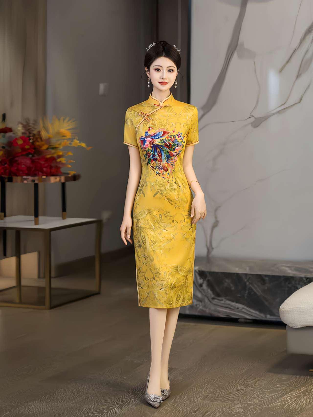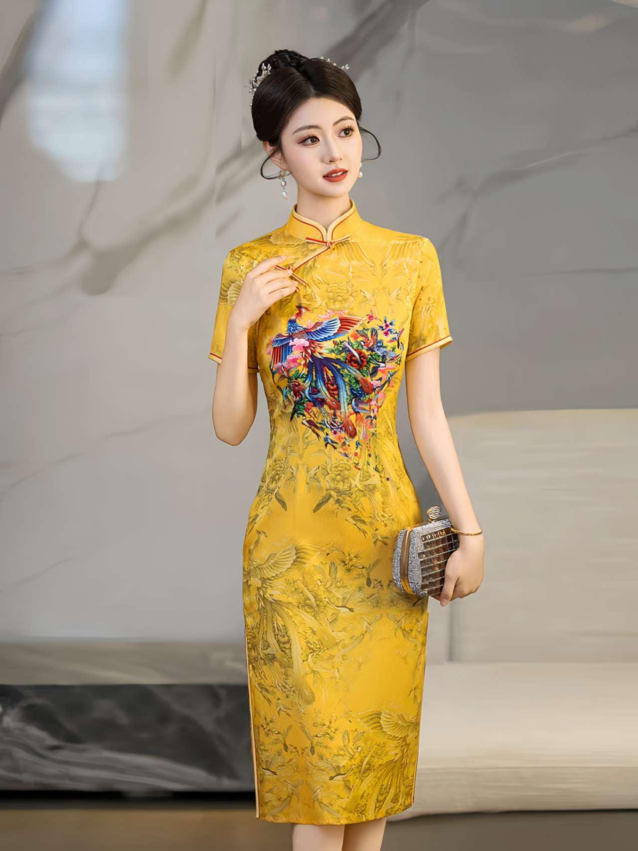 Yellow Phoenix Qipao, Short Cheongsam Dress, Chinese Party Dress, Oriental Cocktail Dress, Retro Wedding Guest Dress