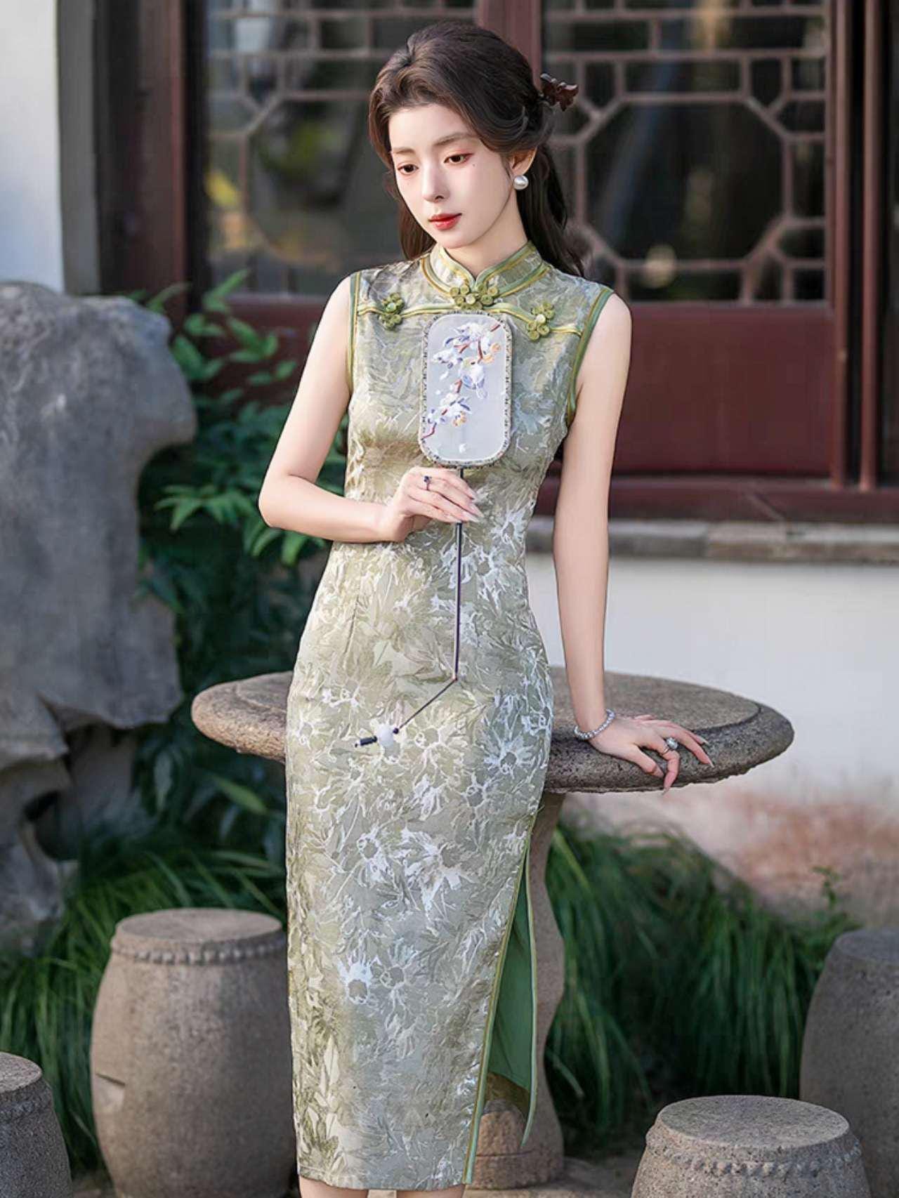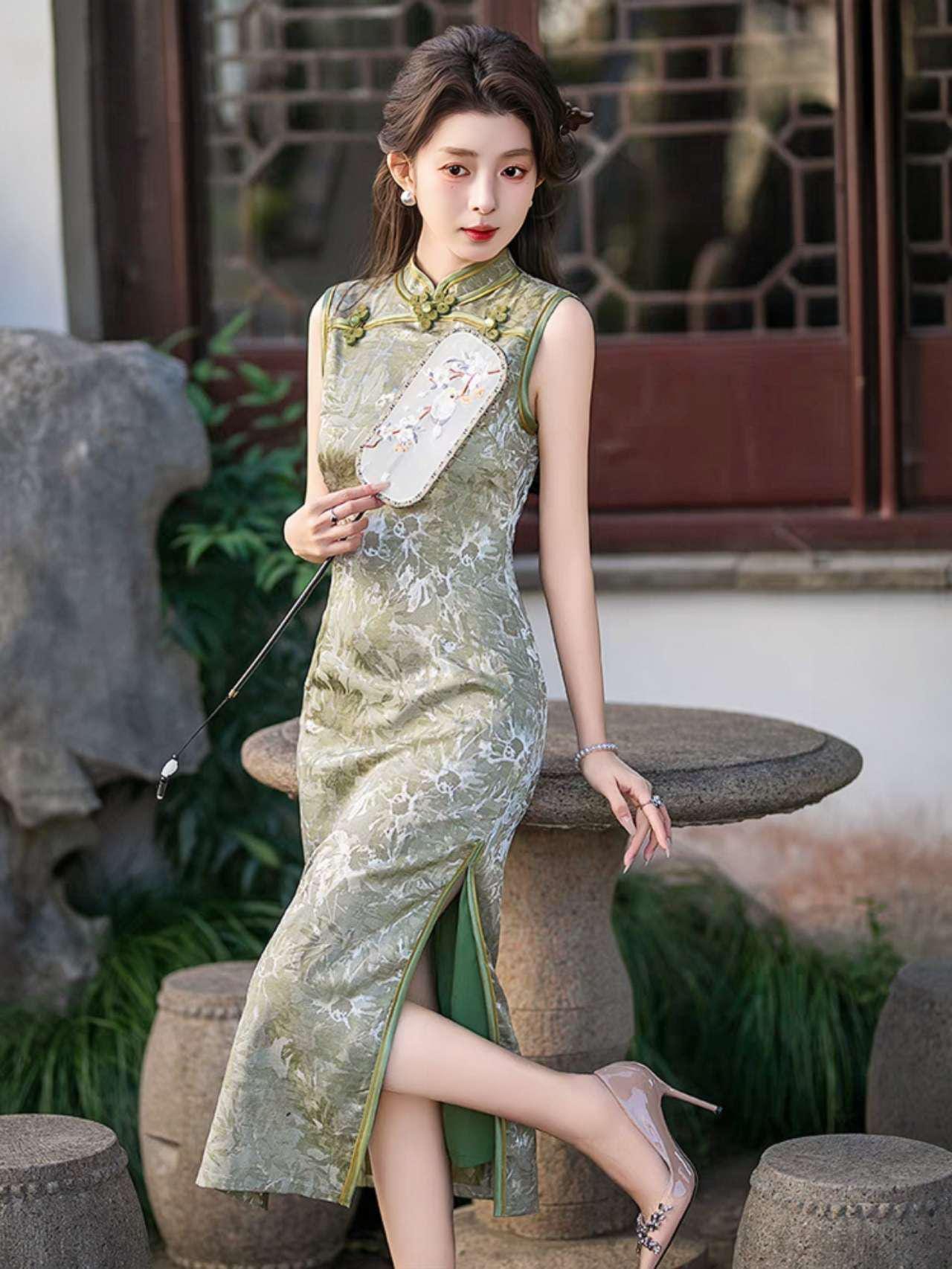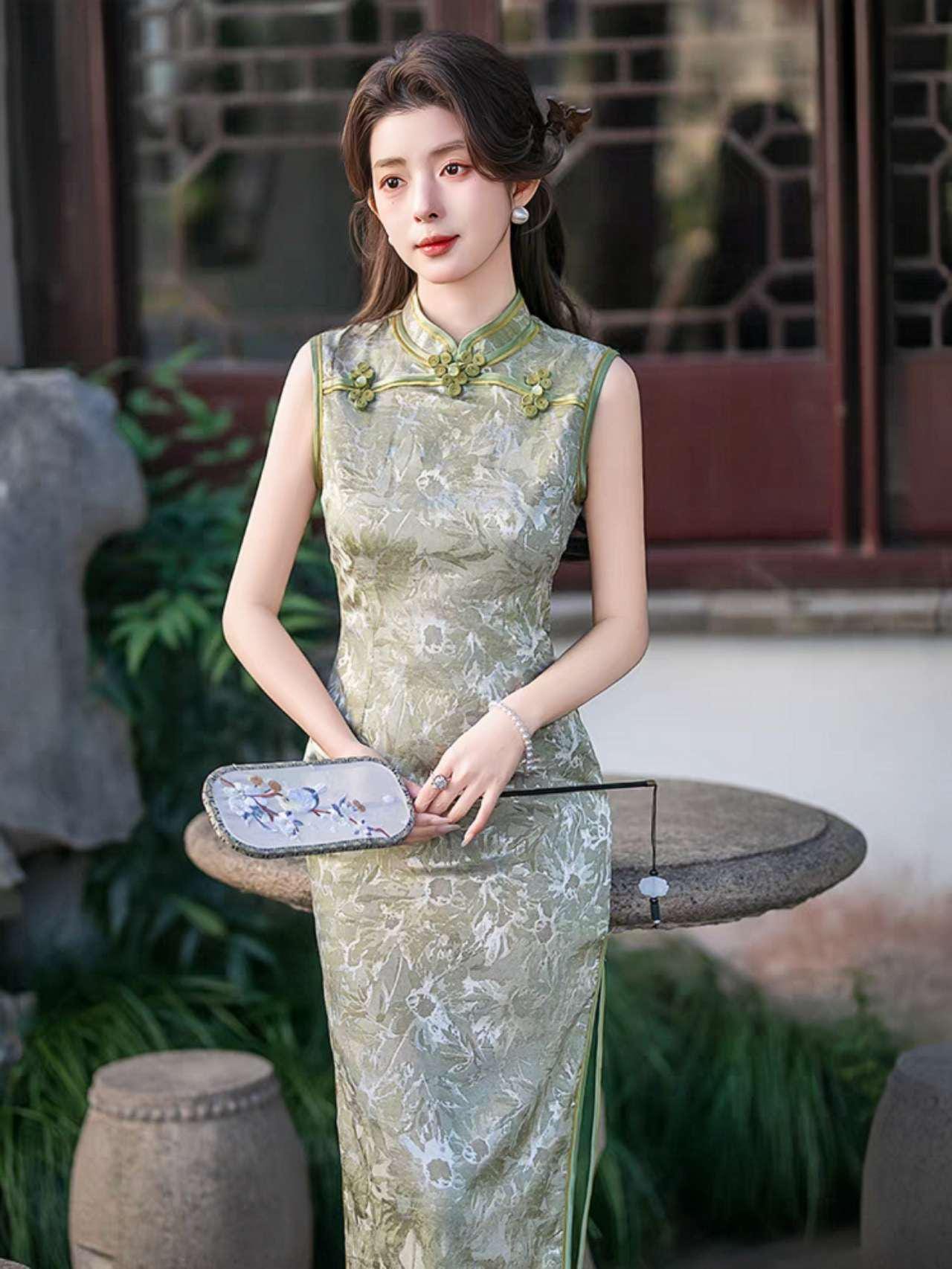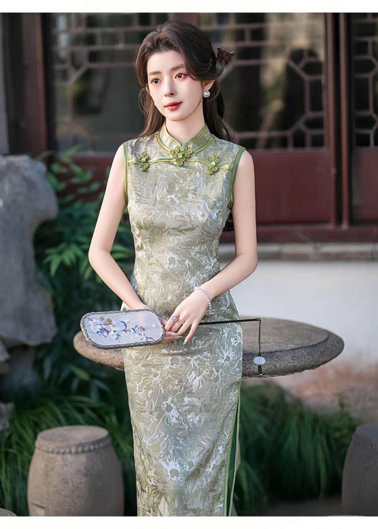 We present this beautiful modern Chinese-style cheongsam, crafted from lightweight crinkle silk fabric that adds texture, softness, and movement to every step. The pastel green floral design conveys freshness and a poetic oriental aesthetic.