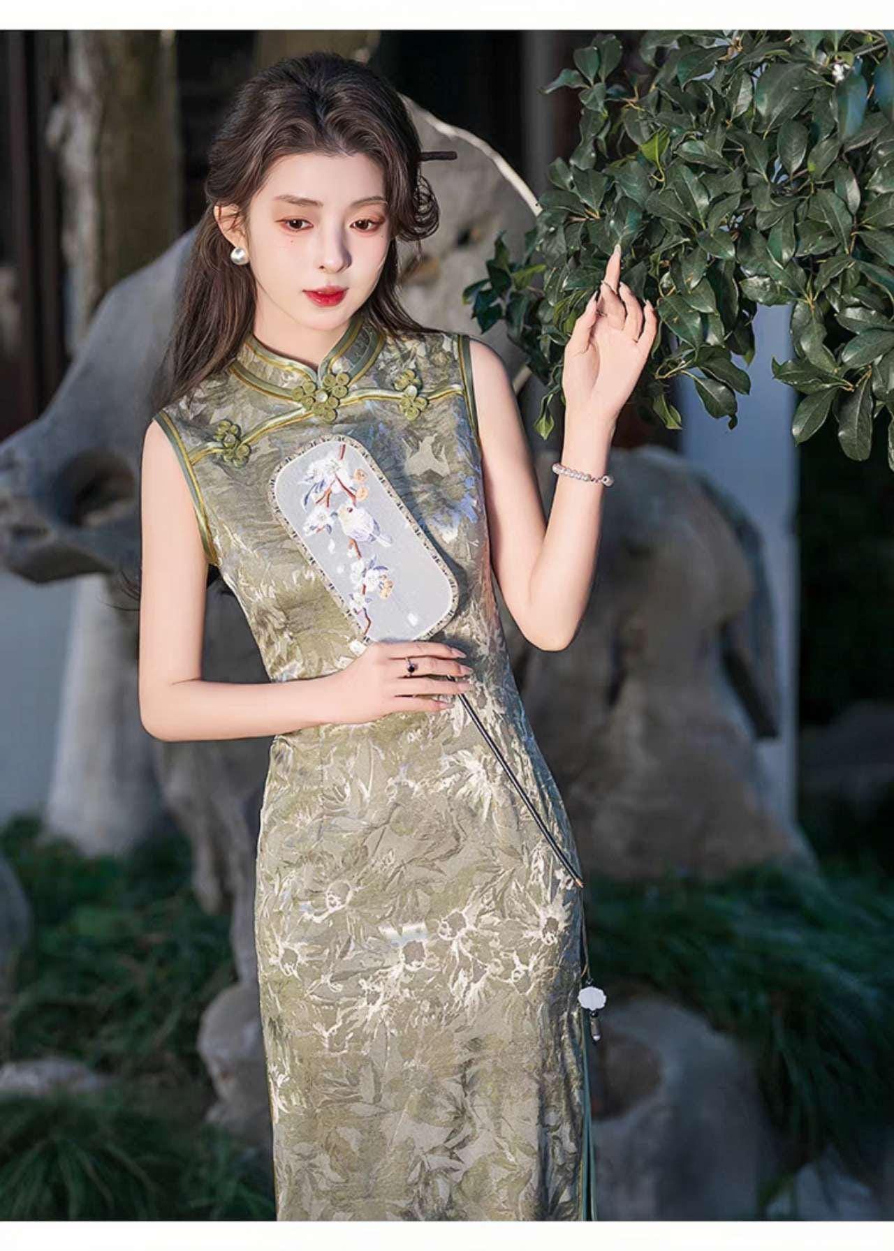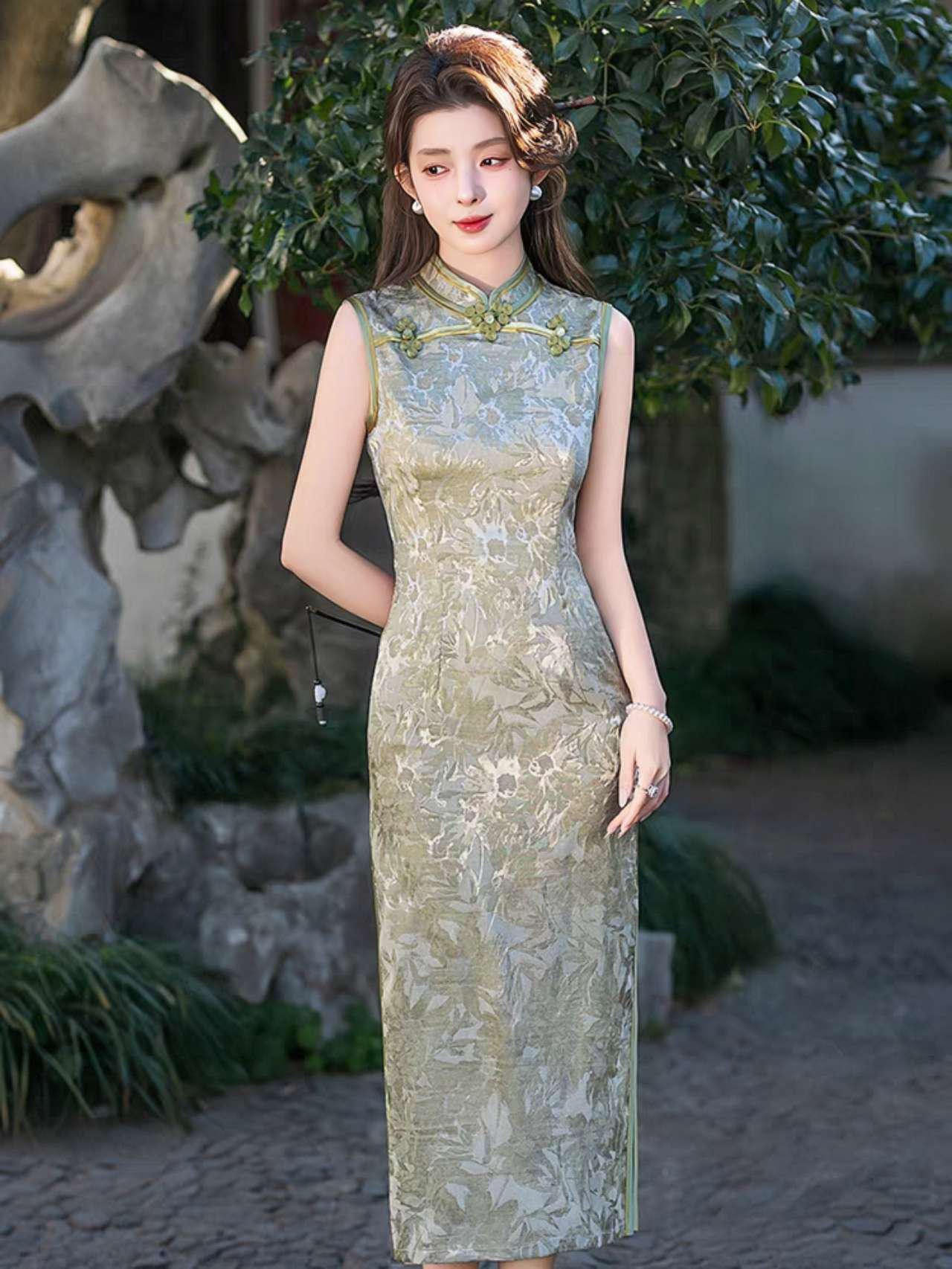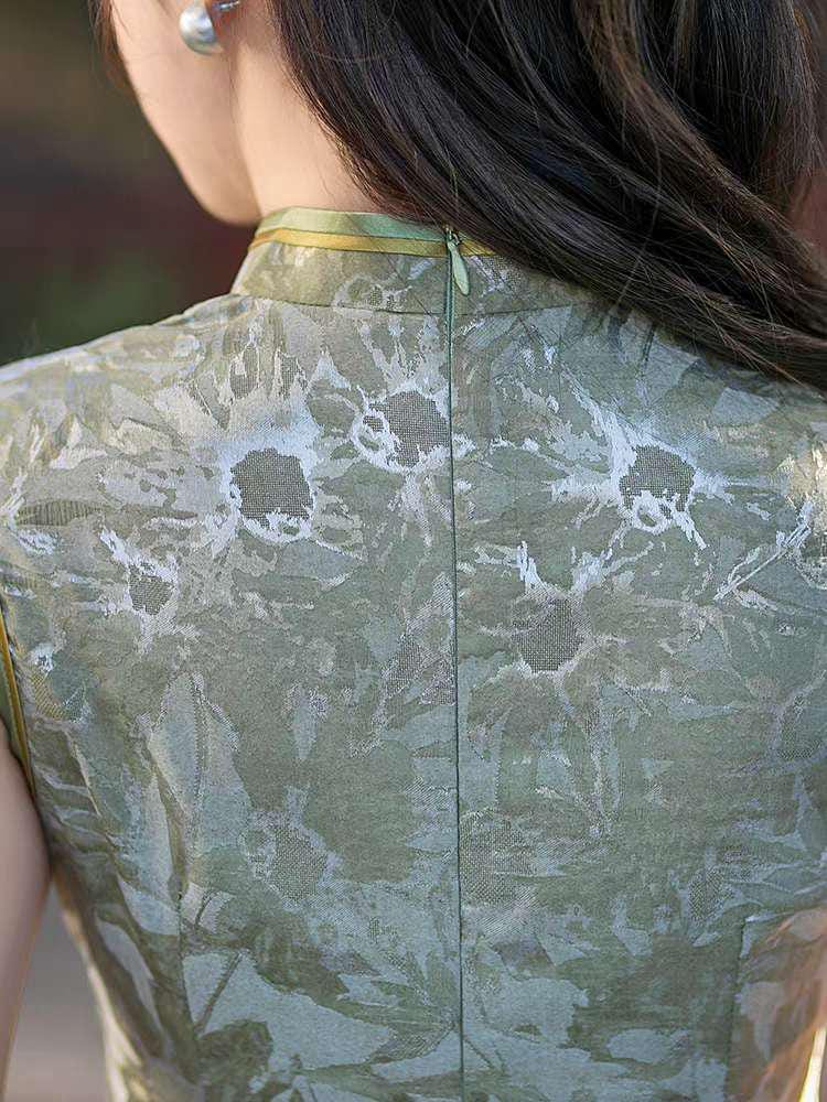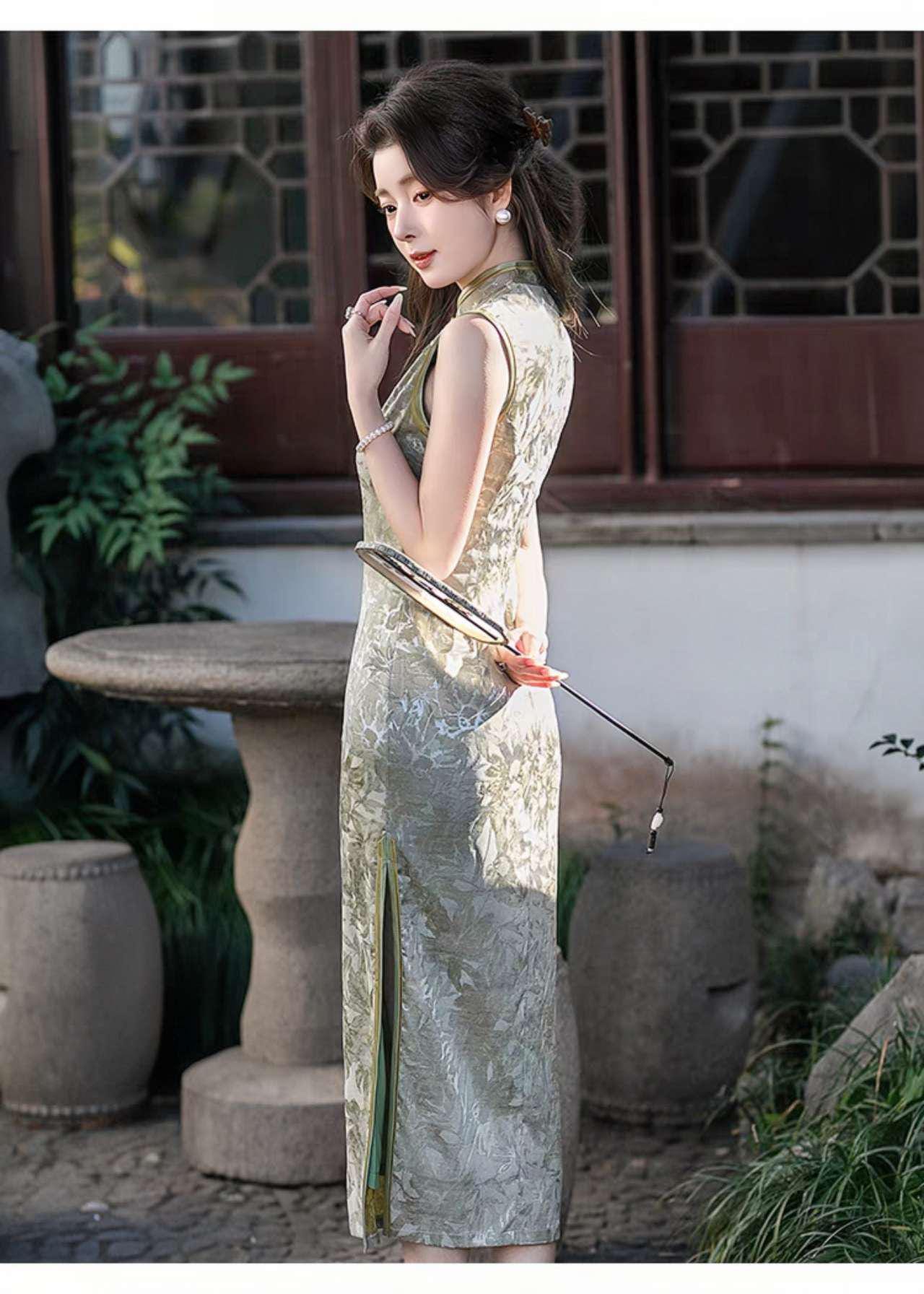We present this beautiful modern Chinese-style cheongsam, crafted from lightweight crinkle silk fabric that adds texture, softness, and movement to every step. The pastel green floral design conveys freshness and a poetic oriental aesthetic.