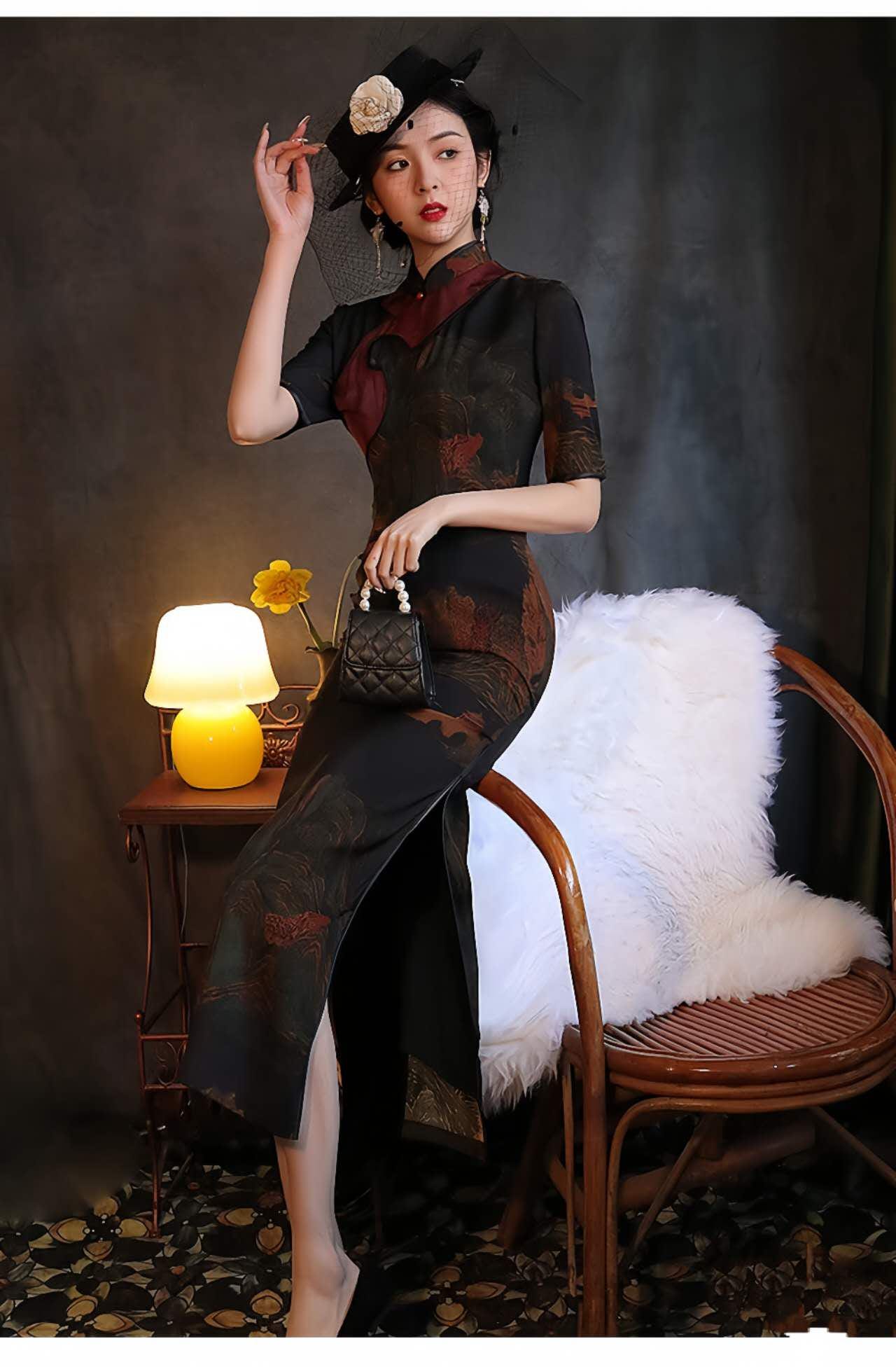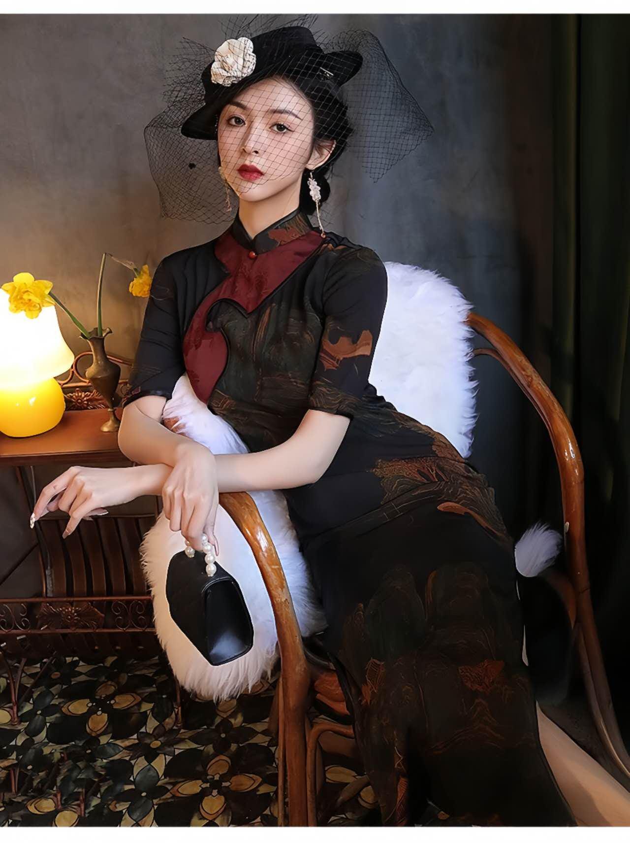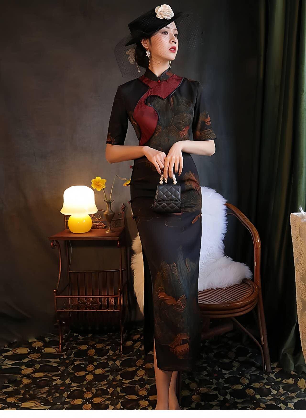 This vintage black qipao dress is a charming fusion of oriental elegance and artistic details. Crafted from lightweight and breathable floral luo fabric, it features a traditional Chinese landscape design reminiscent of a classic painting, along with elegant asymmetrical burgundy trim and Chinese knot buttons.