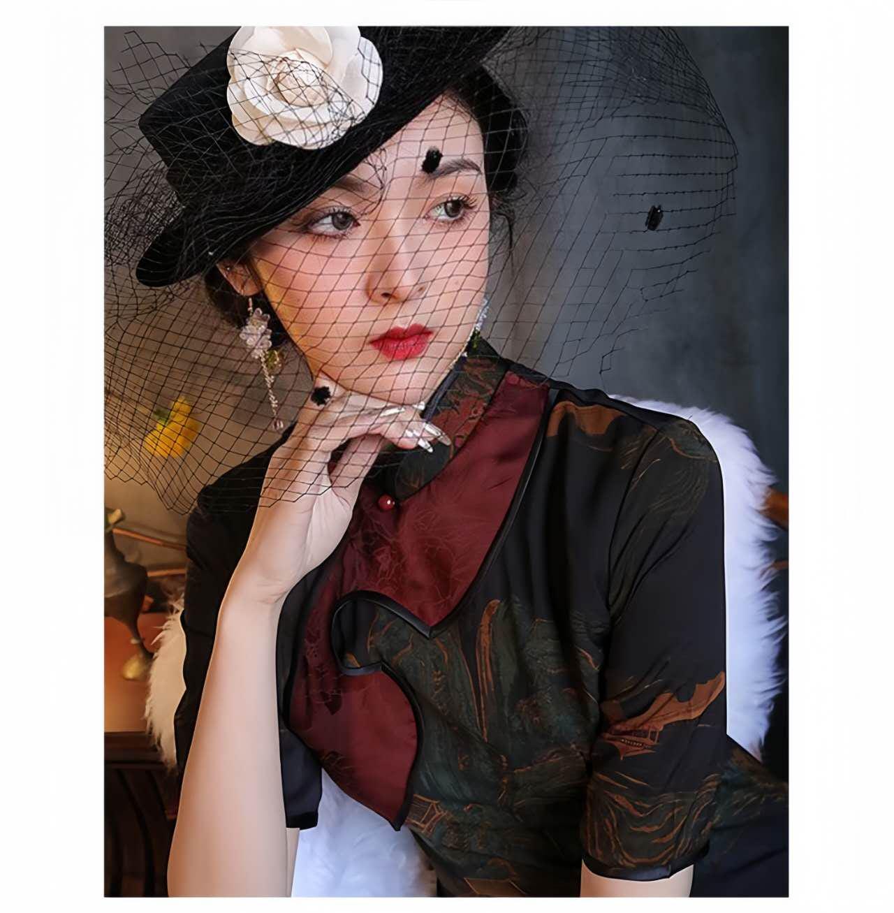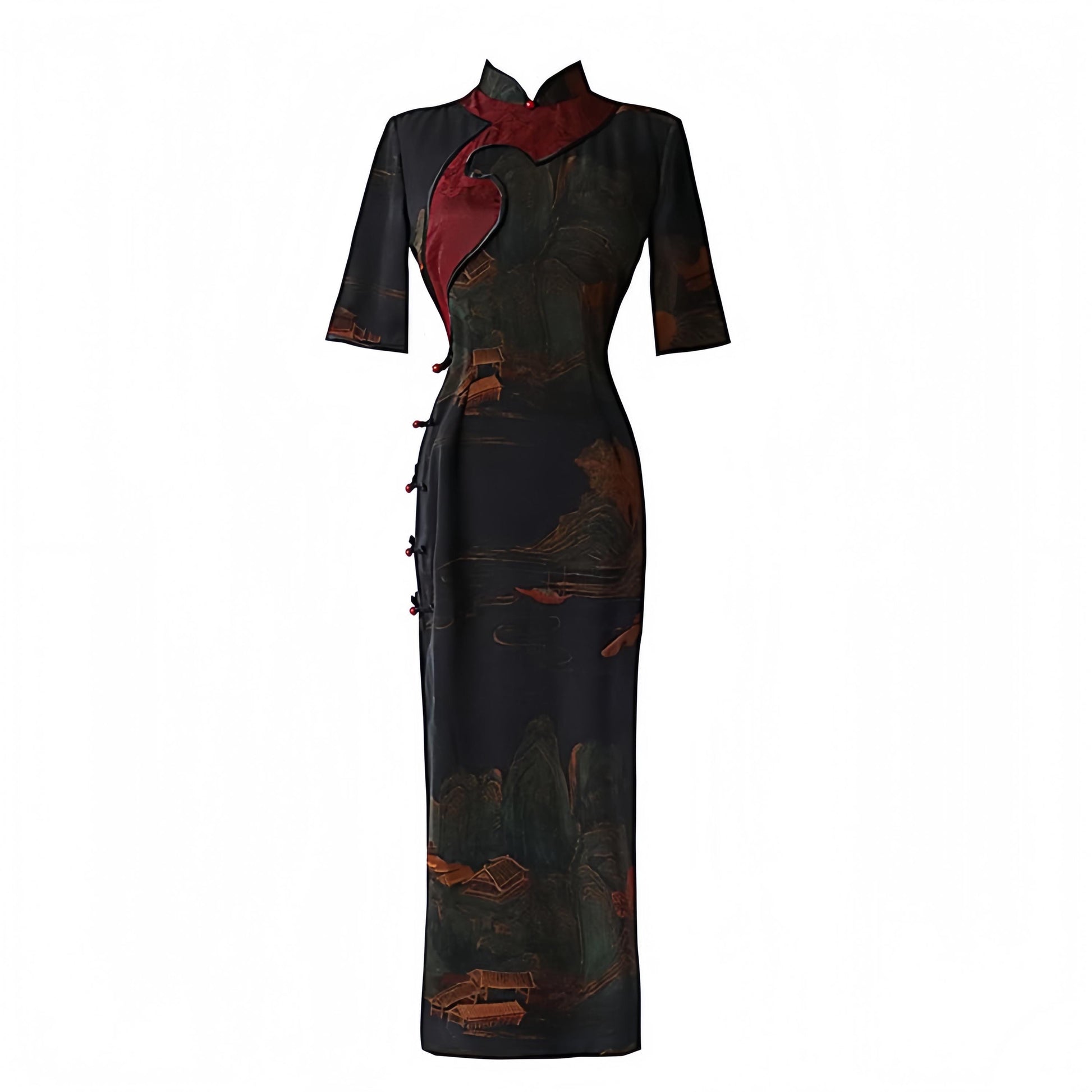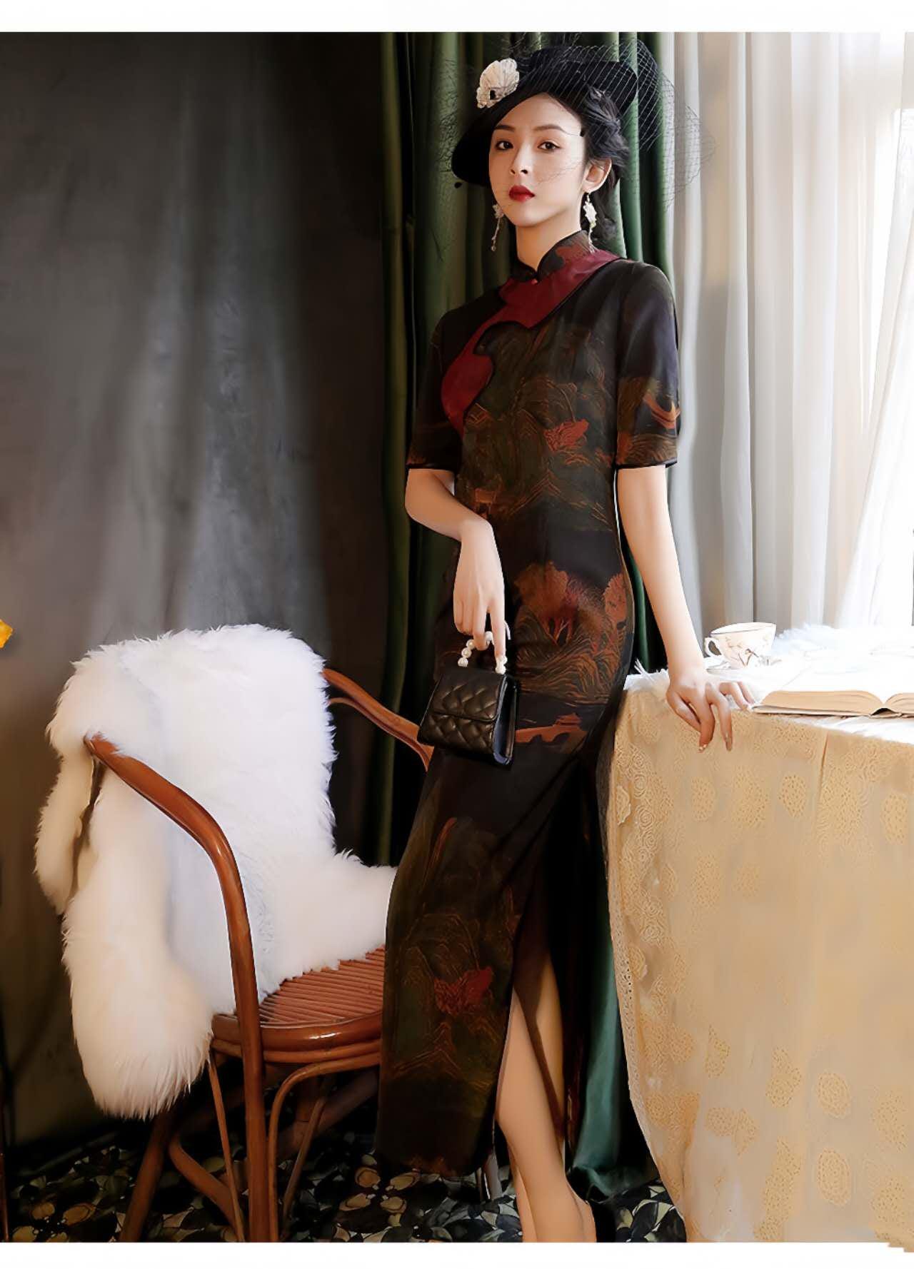 This vintage black qipao dress is a charming fusion of oriental elegance and artistic details. Crafted from lightweight and breathable floral luo fabric, it features a traditional Chinese landscape design reminiscent of a classic painting, along with elegant asymmetrical burgundy trim and Chinese knot buttons.