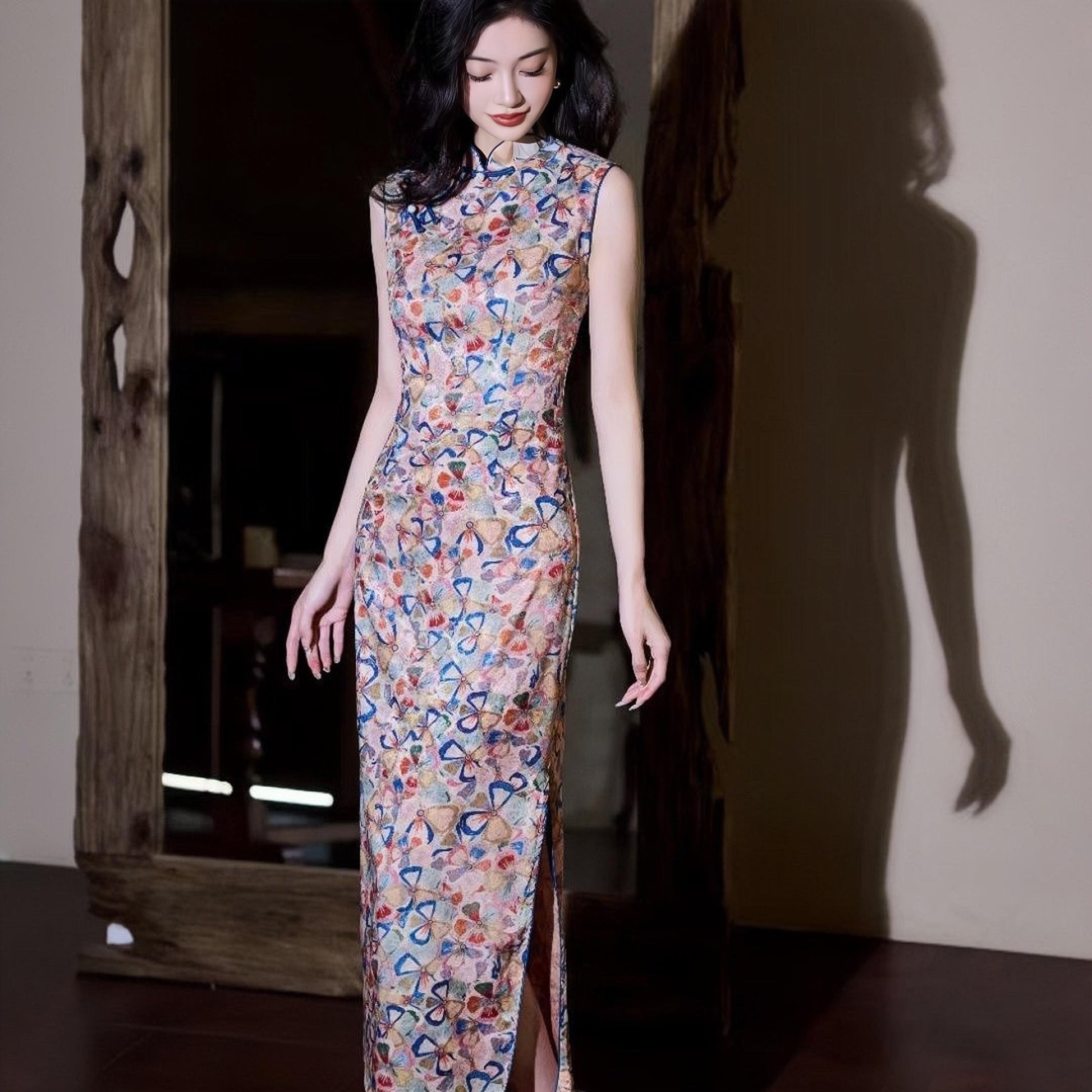Abstract Floral Pattern Qipao, Modern Cheongsam, Vintage Chinese Style Dress, Sparkly Cocktail Dress, Art Print Dress