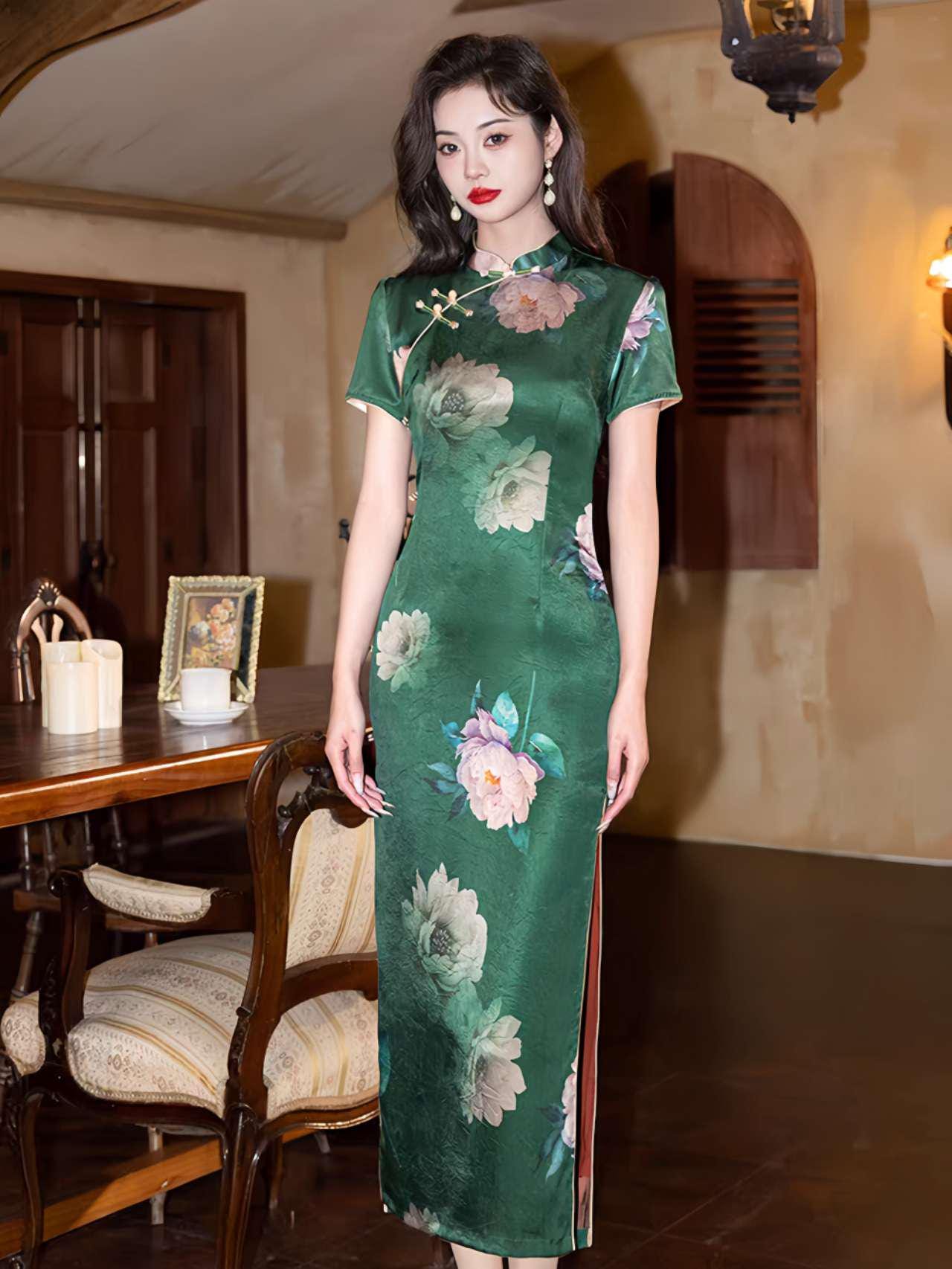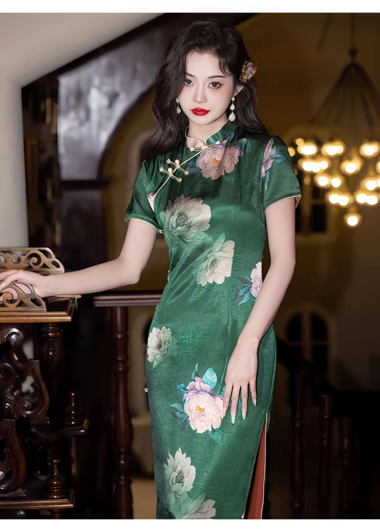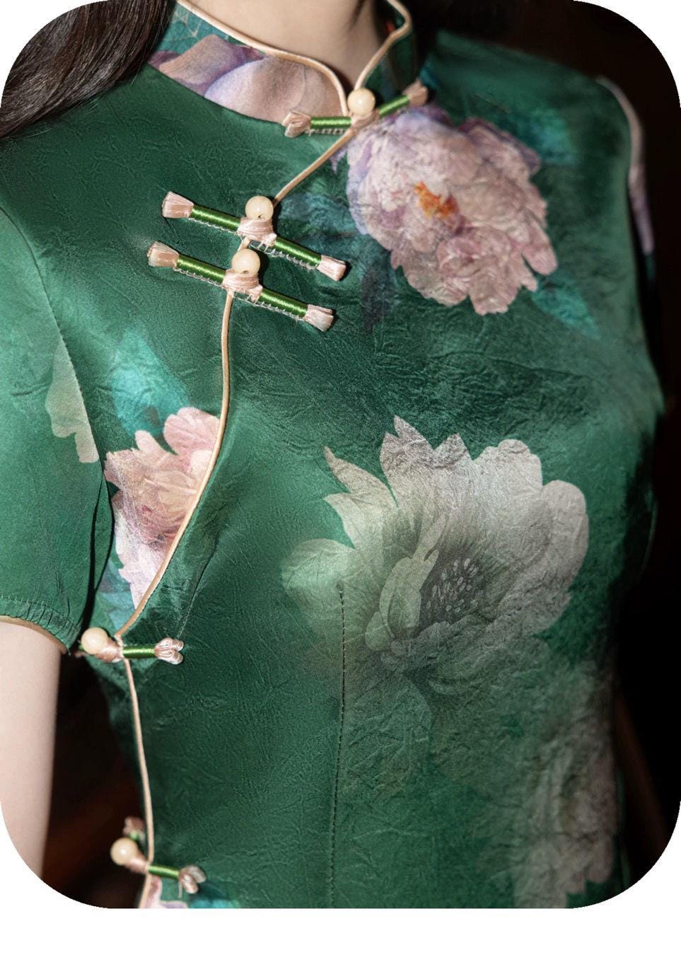Reveal your elegance with this dark green vintage qipao, crafted from lustrous wal-style satin for a luxurious and sophisticated finish. This traditional Chinese dress features handmade knotted buttons, a high Mandarin collar, and large peony-style flowers, a symbol of femininity and nobility in Eastern culture.