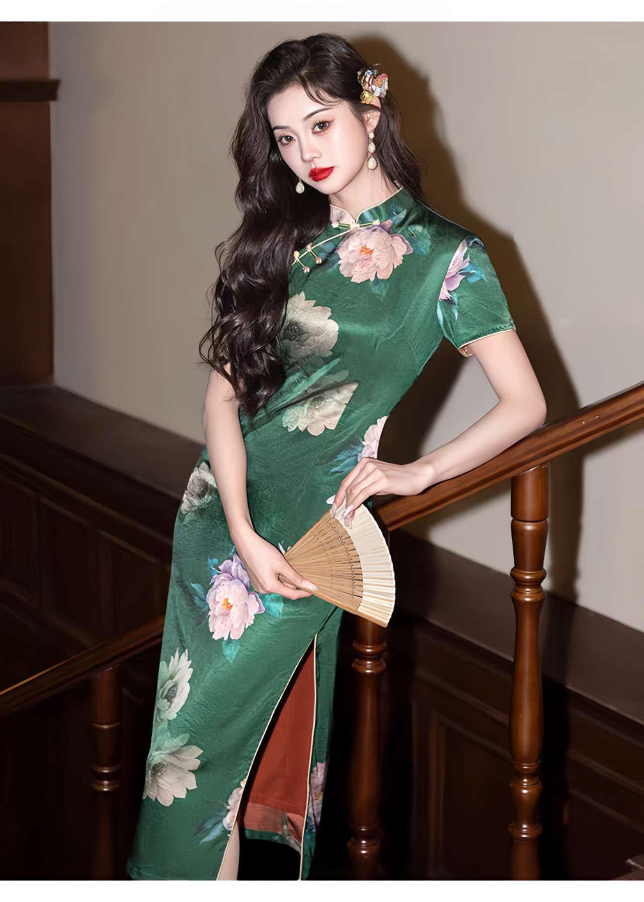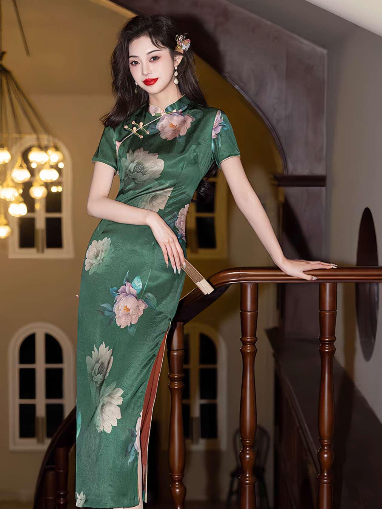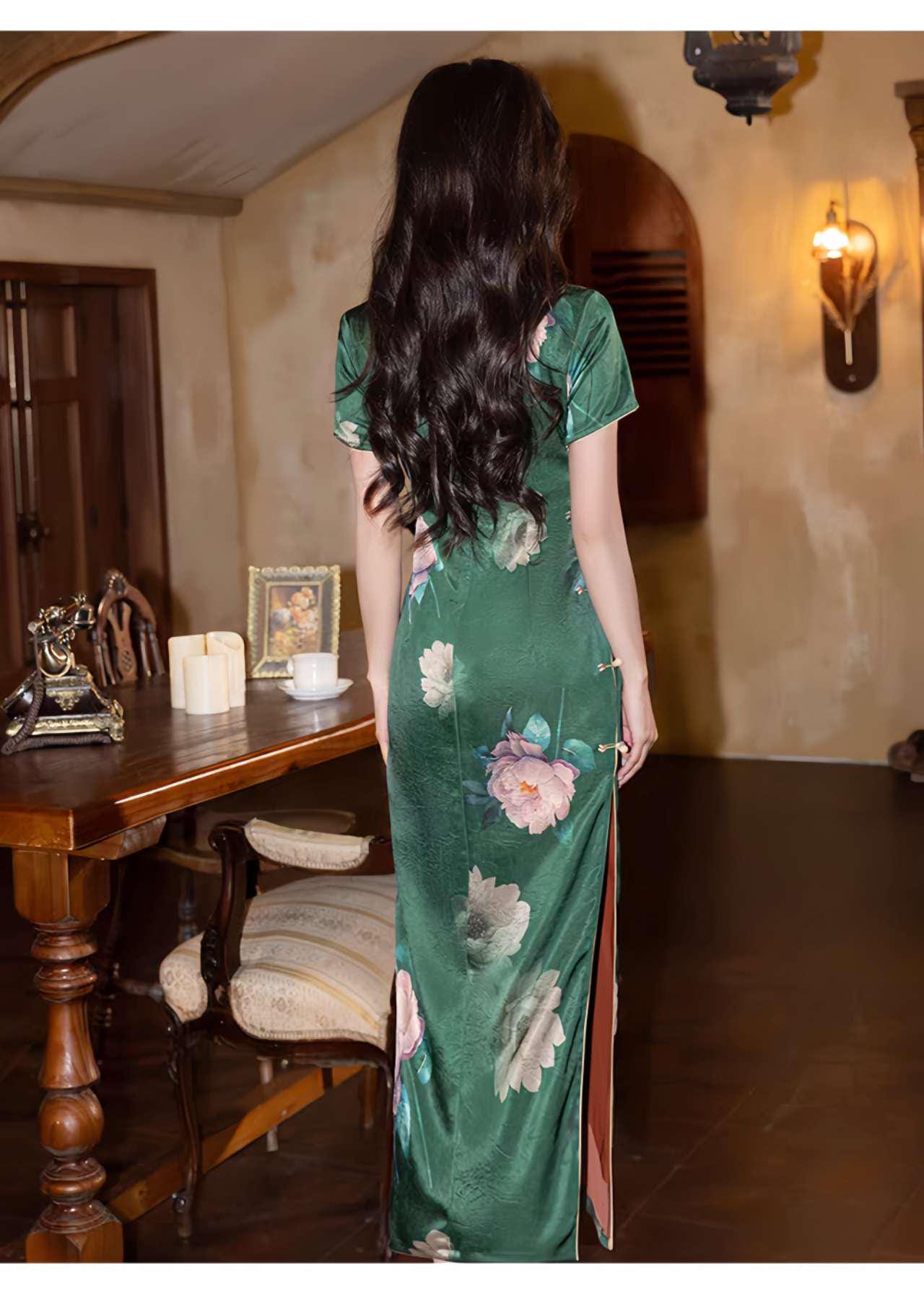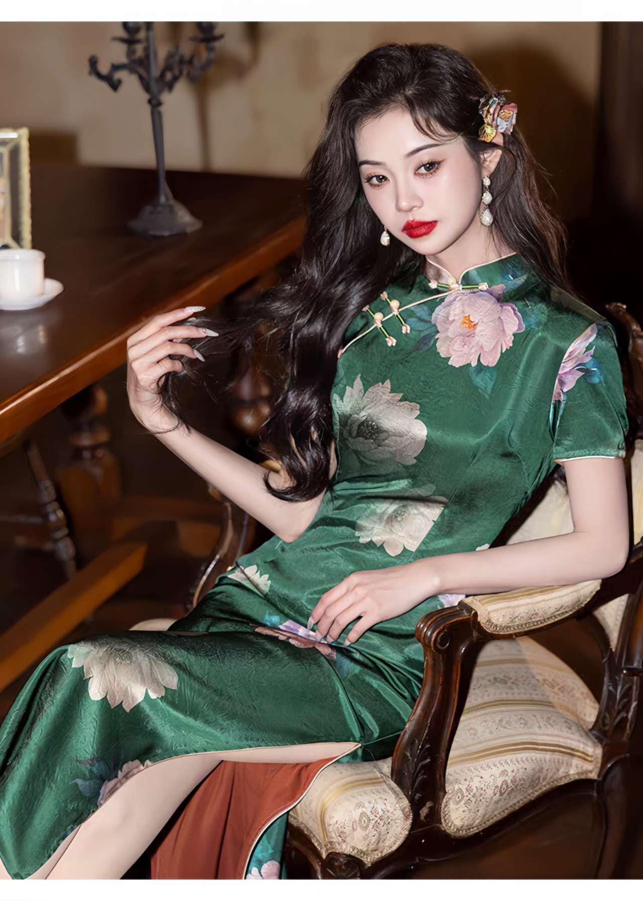 Reveal your elegance with this dark green vintage qipao, crafted from lustrous wal-style satin for a luxurious and sophisticated finish. This traditional Chinese dress features handmade knotted buttons, a high Mandarin collar, and large peony-style flowers, a symbol of femininity and nobility in Eastern culture.