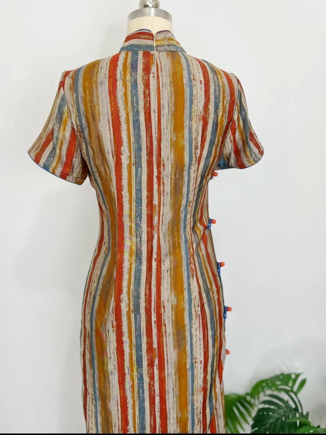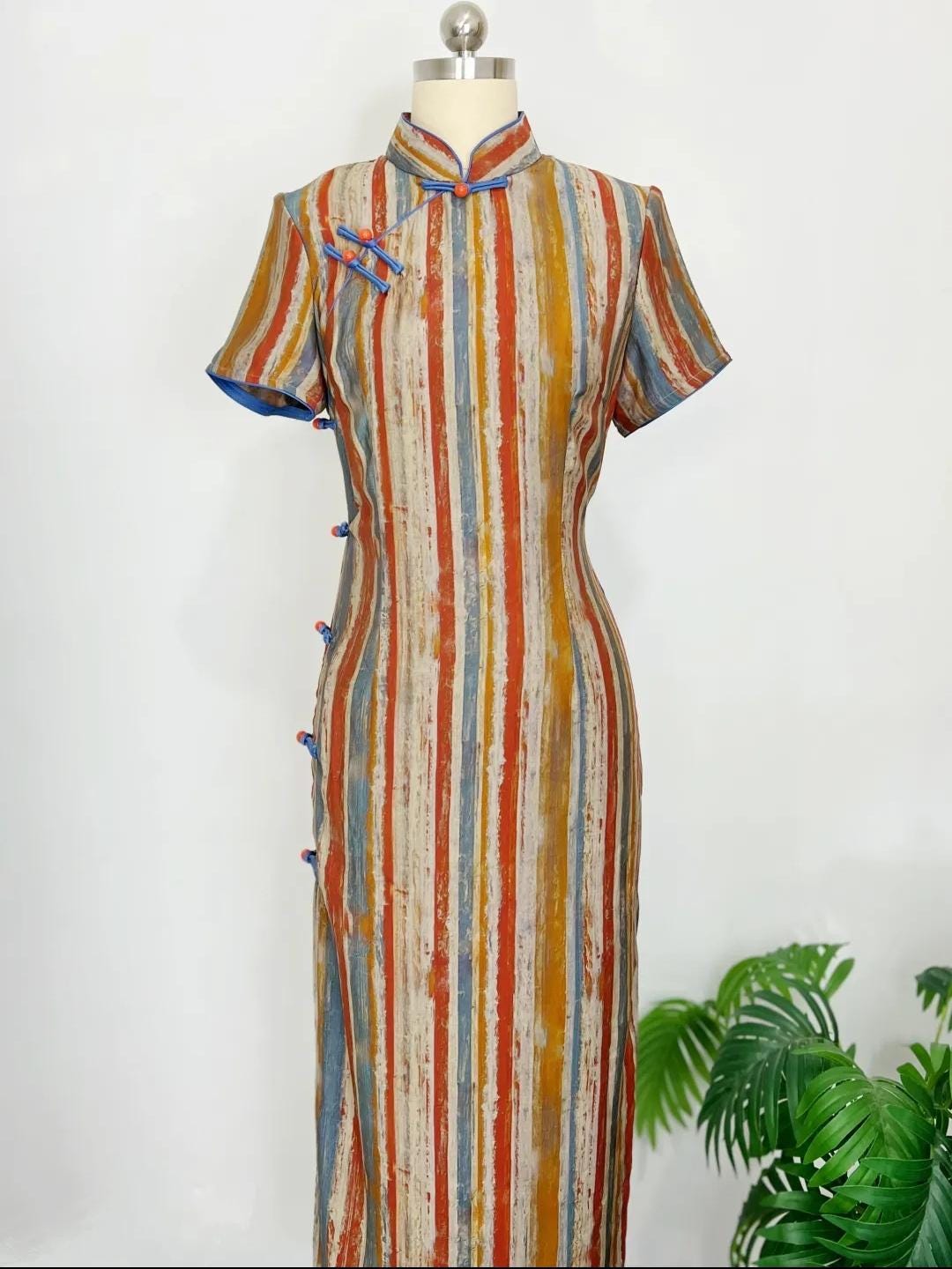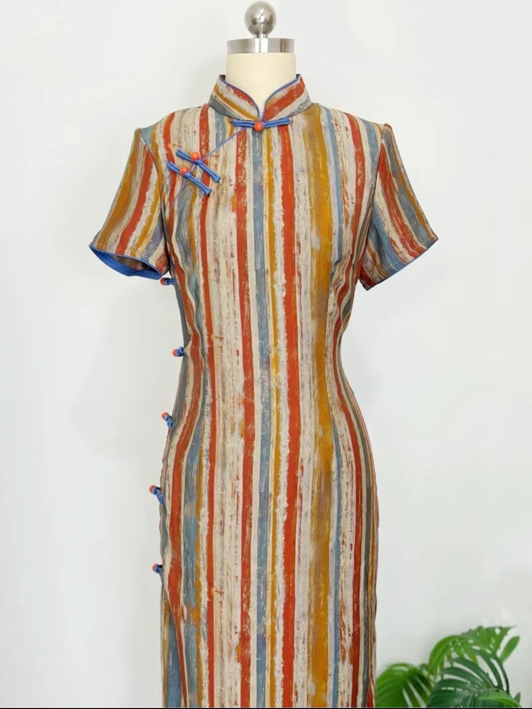 Summer Qipao – Yun Silk Striped Cheongsam Dress | Oil Painting Art Style | Chinese Elegance for Women