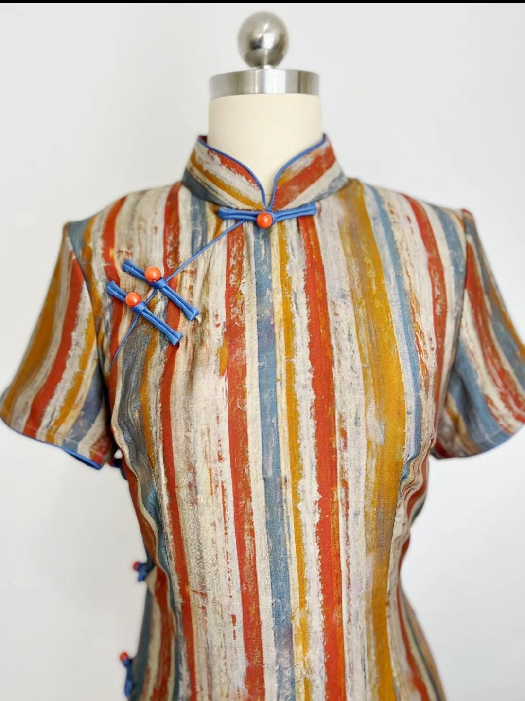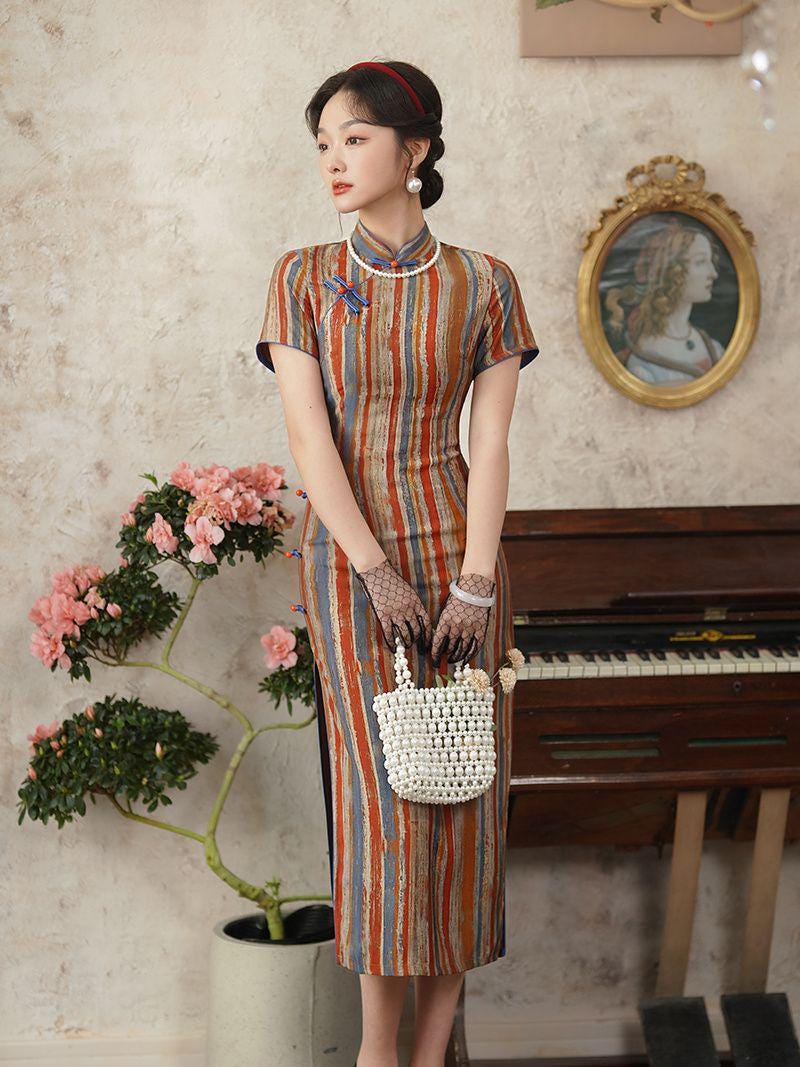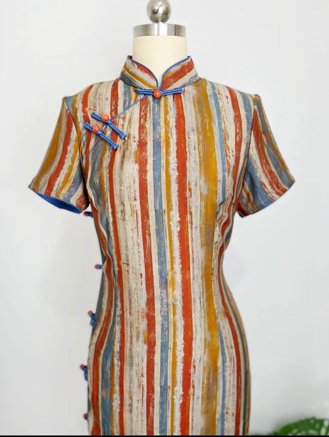 Summer Qipao – Yun Silk Striped Cheongsam Dress | Oil Painting Art Style | Chinese Elegance for Women