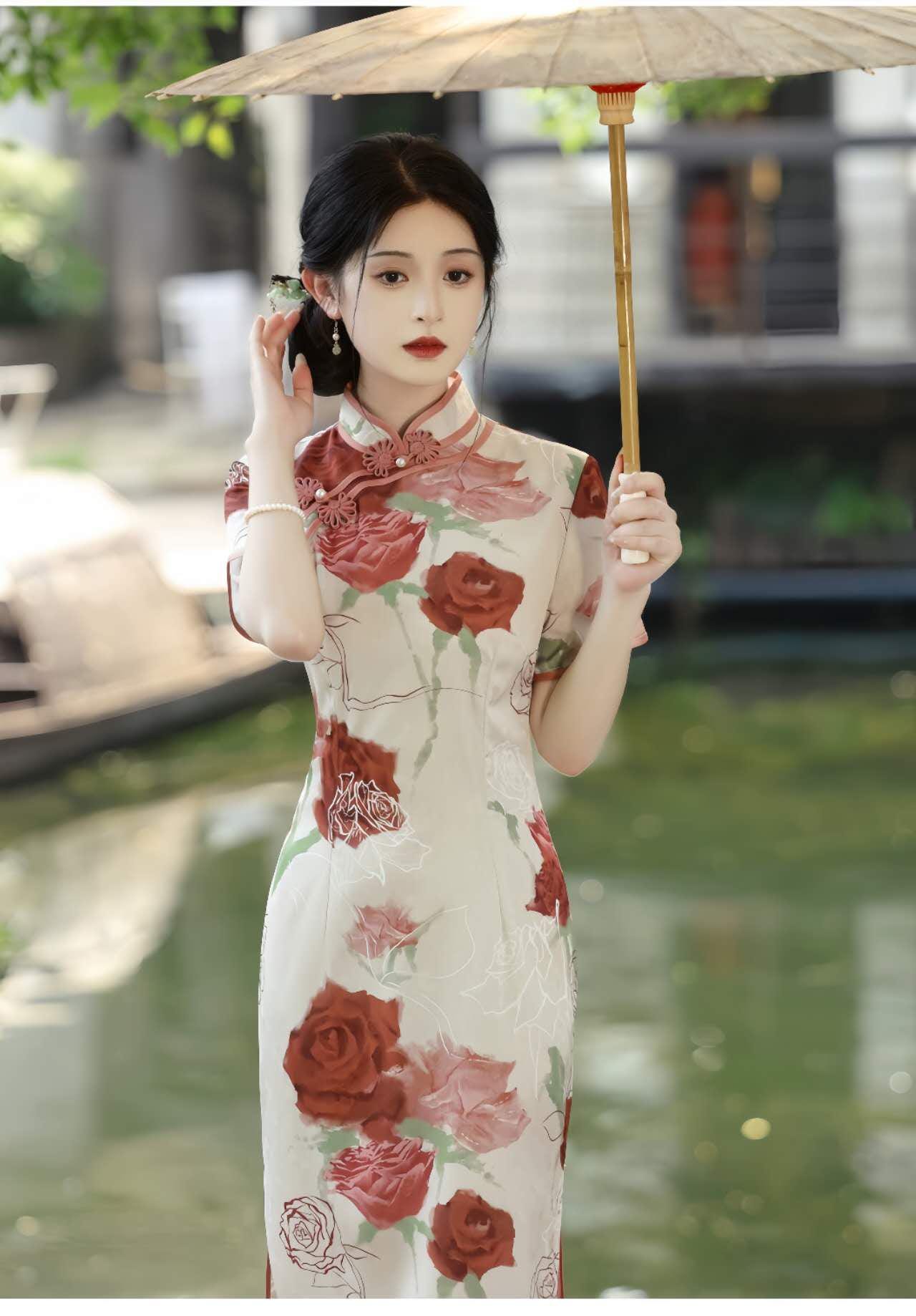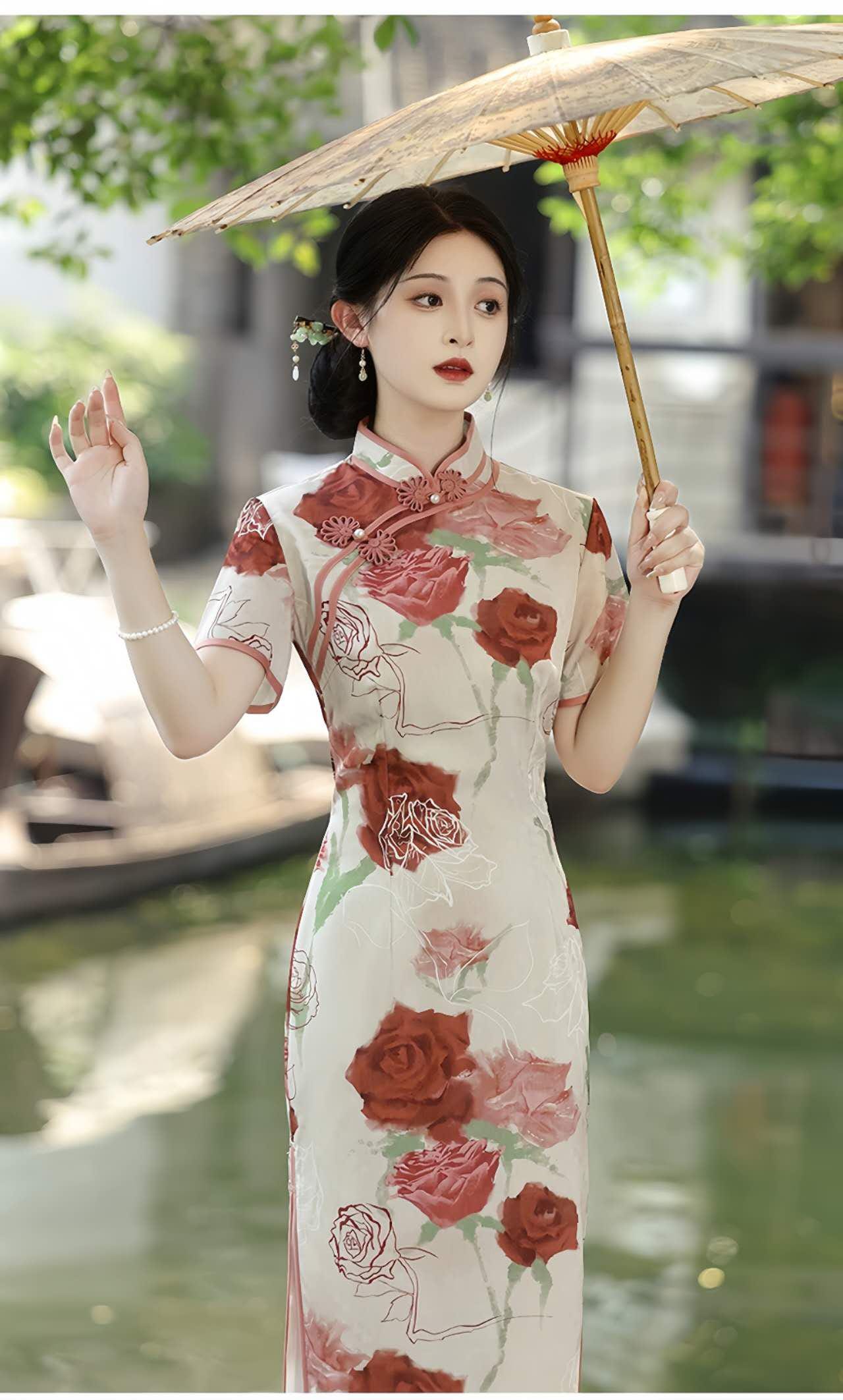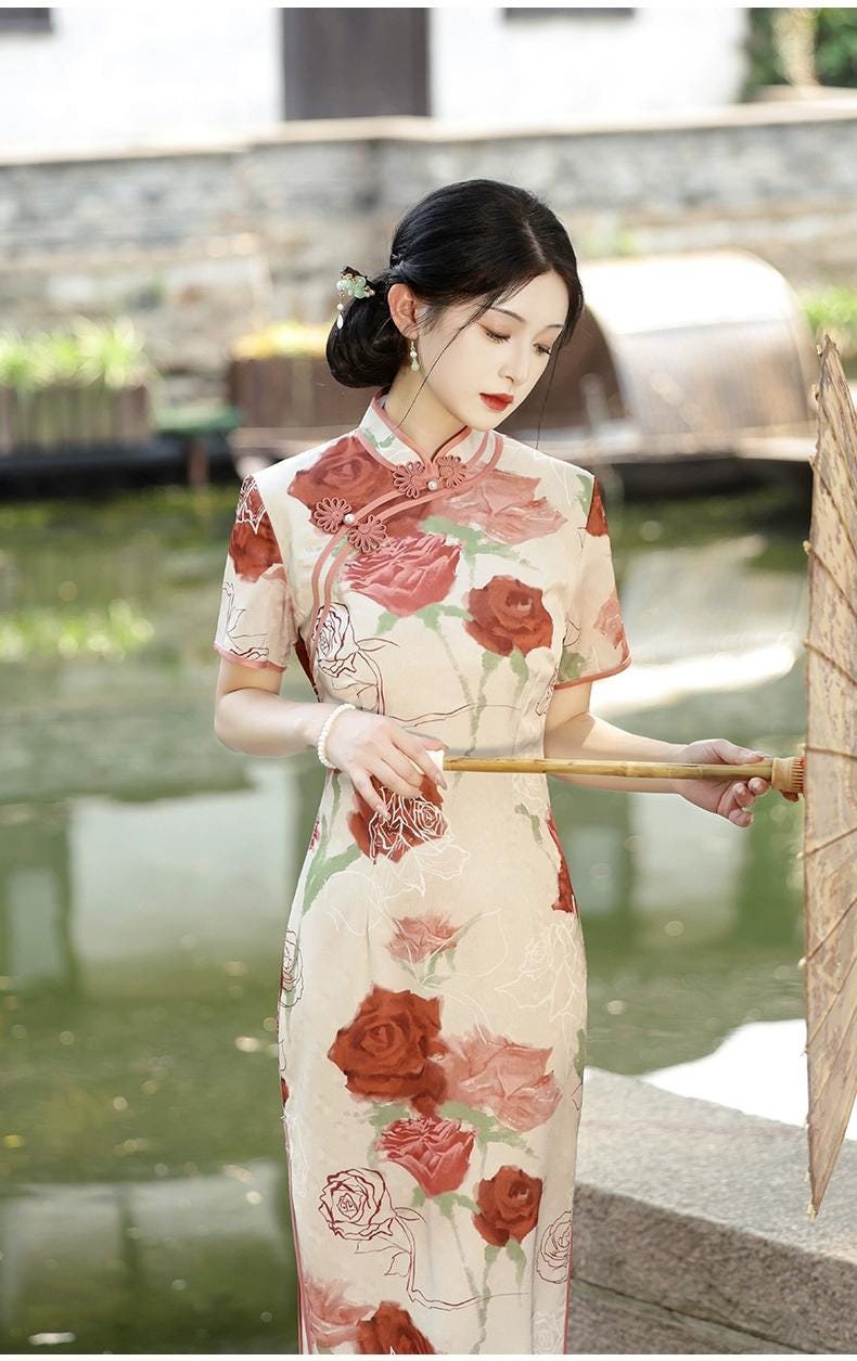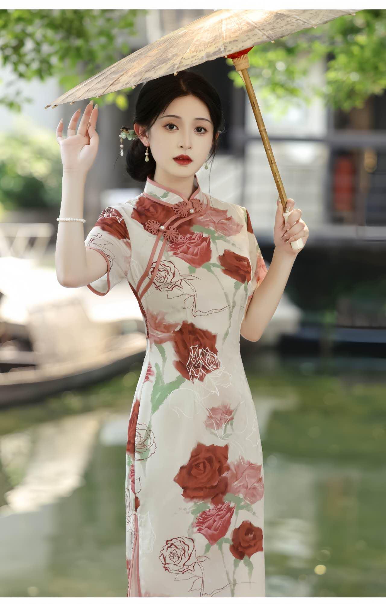 Enjoy the perfect fusion of French romance and oriental elegance with this exquisite floral rose qipao. Crafted from luxurious jacquard satin, its creamy base is decorated with watercolor-style red and pink roses, creating a poetic and delicate feel.