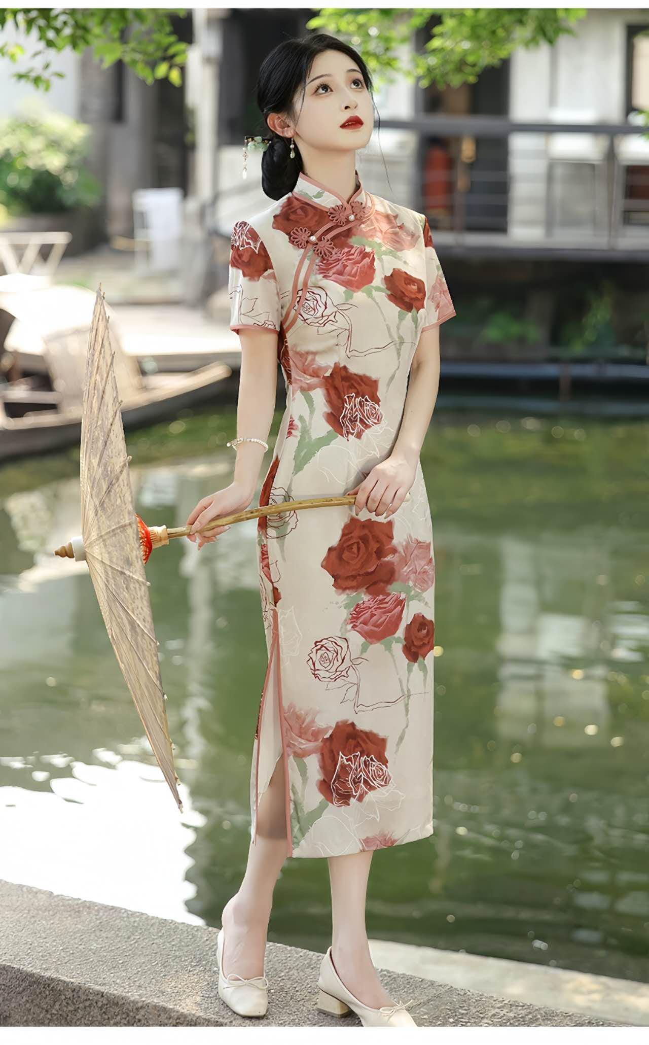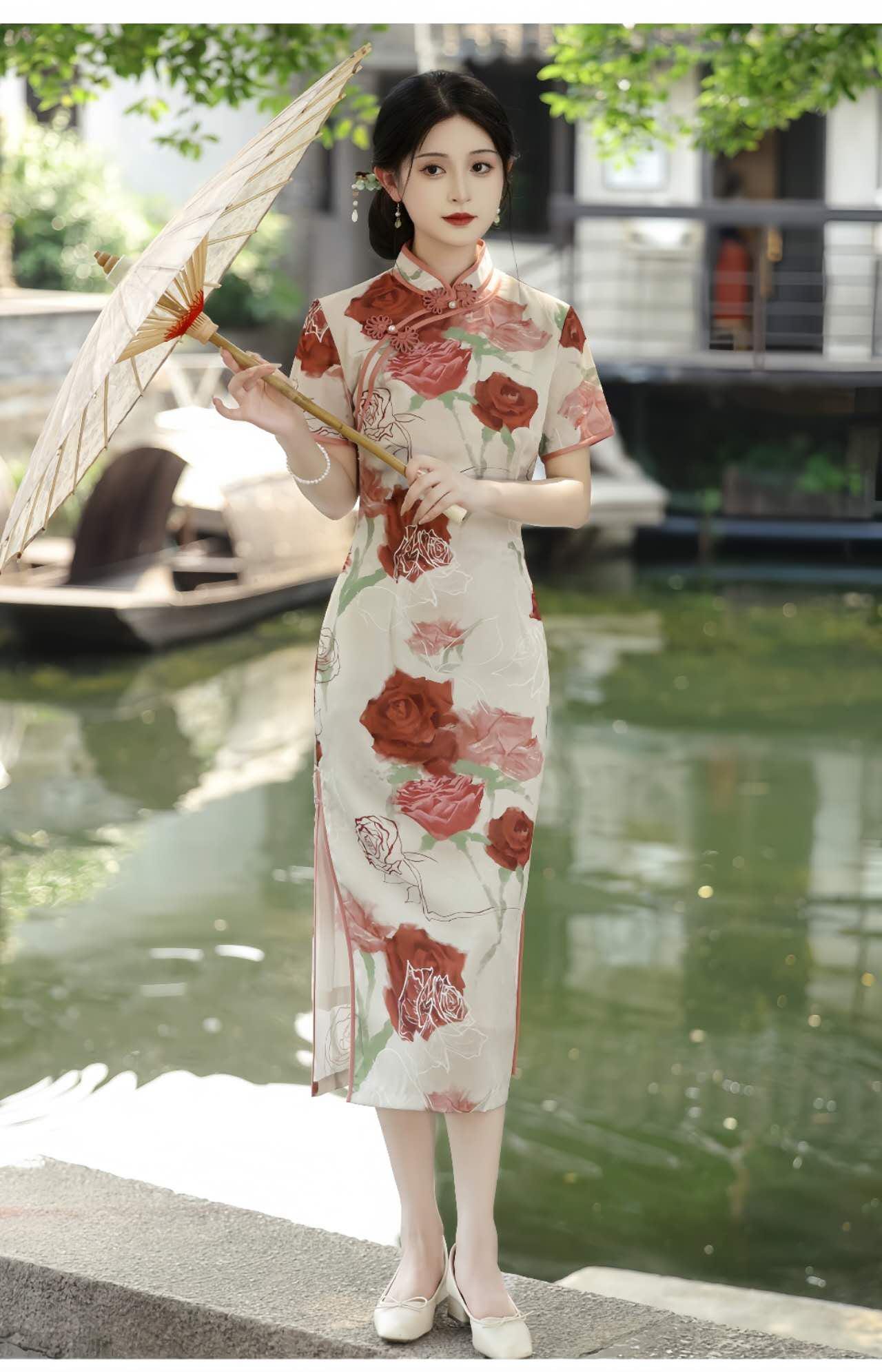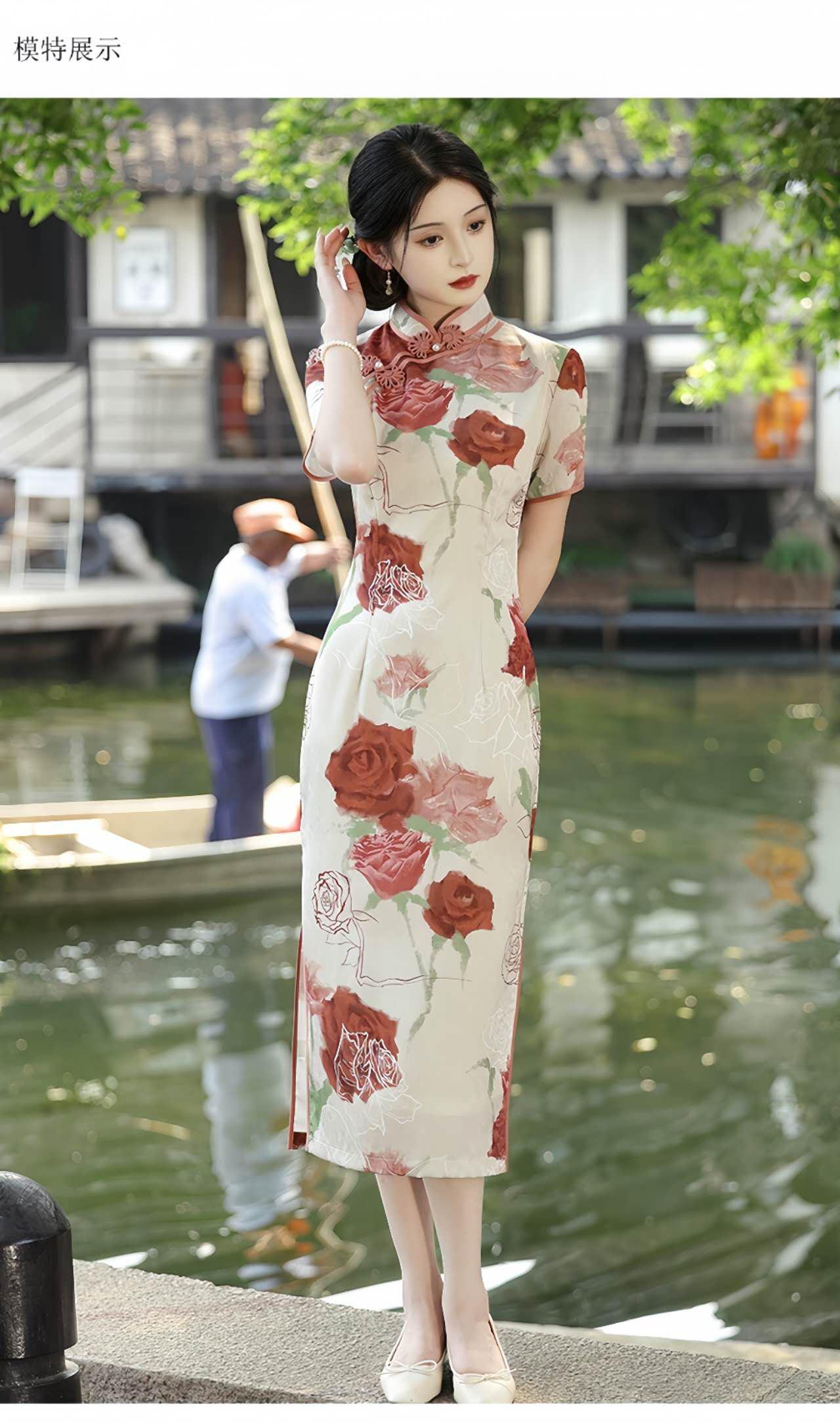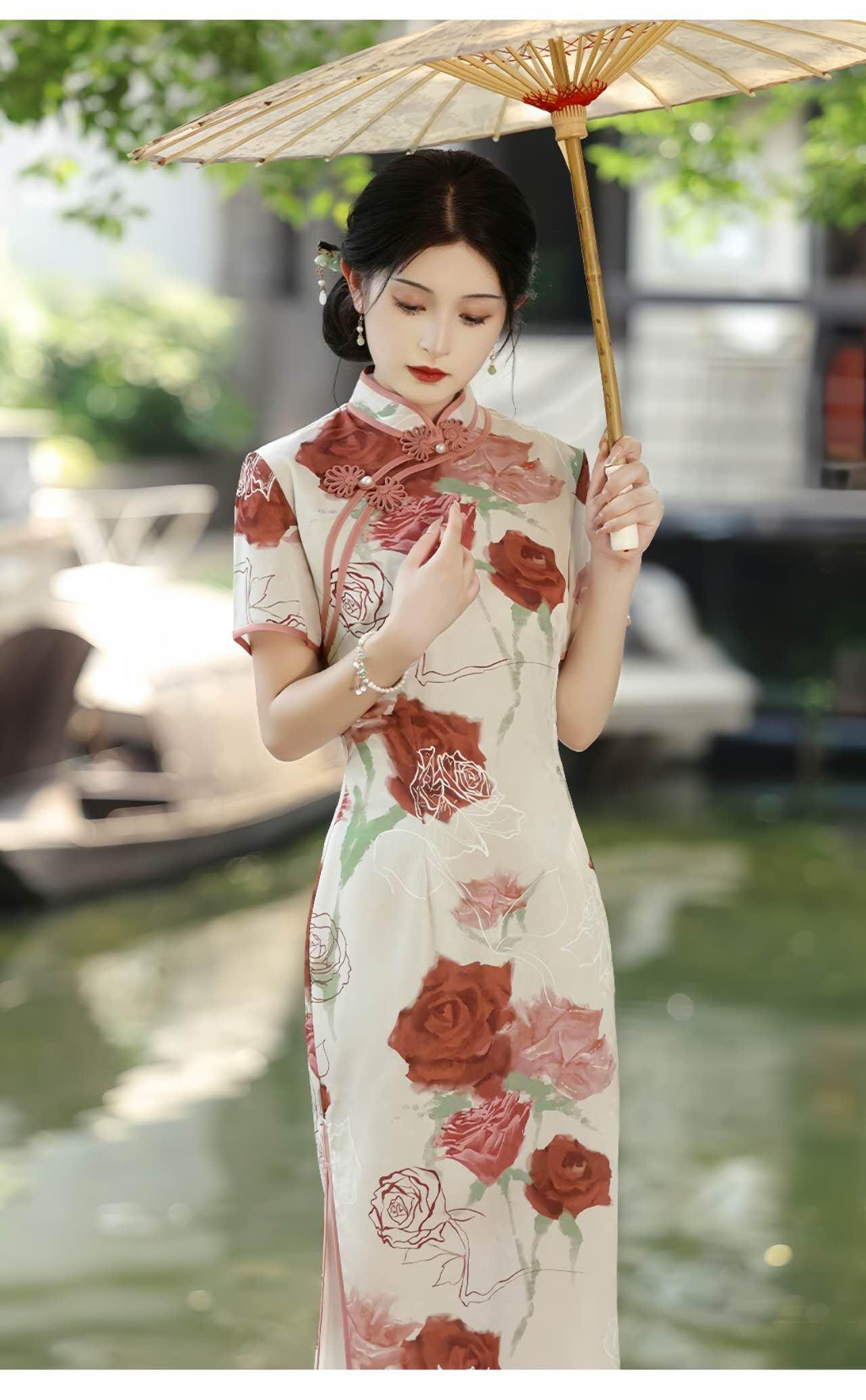 Enjoy the perfect fusion of French romance and oriental elegance with this exquisite floral rose qipao. Crafted from luxurious jacquard satin, its creamy base is decorated with watercolor-style red and pink roses, creating a poetic and delicate feel.