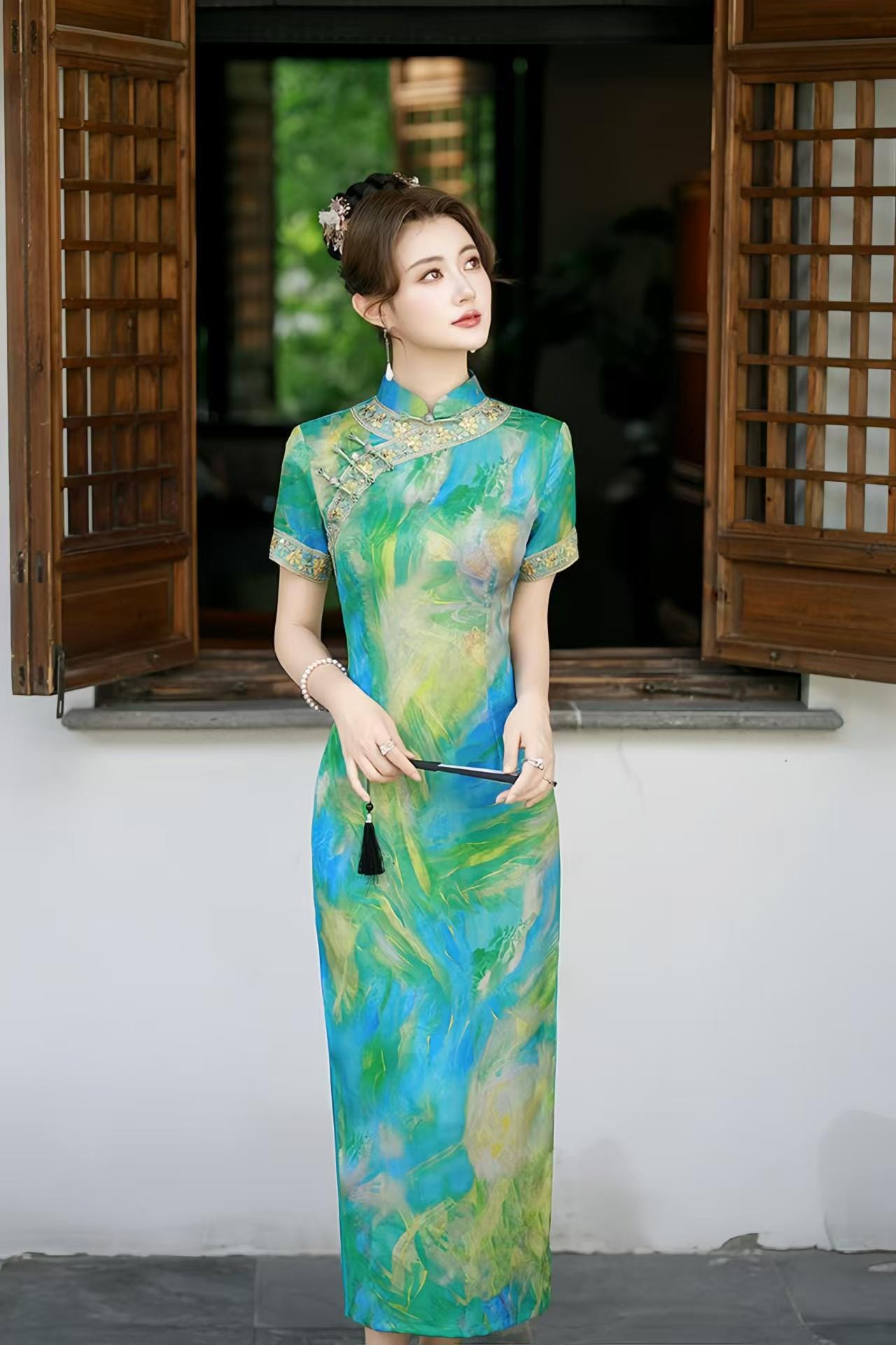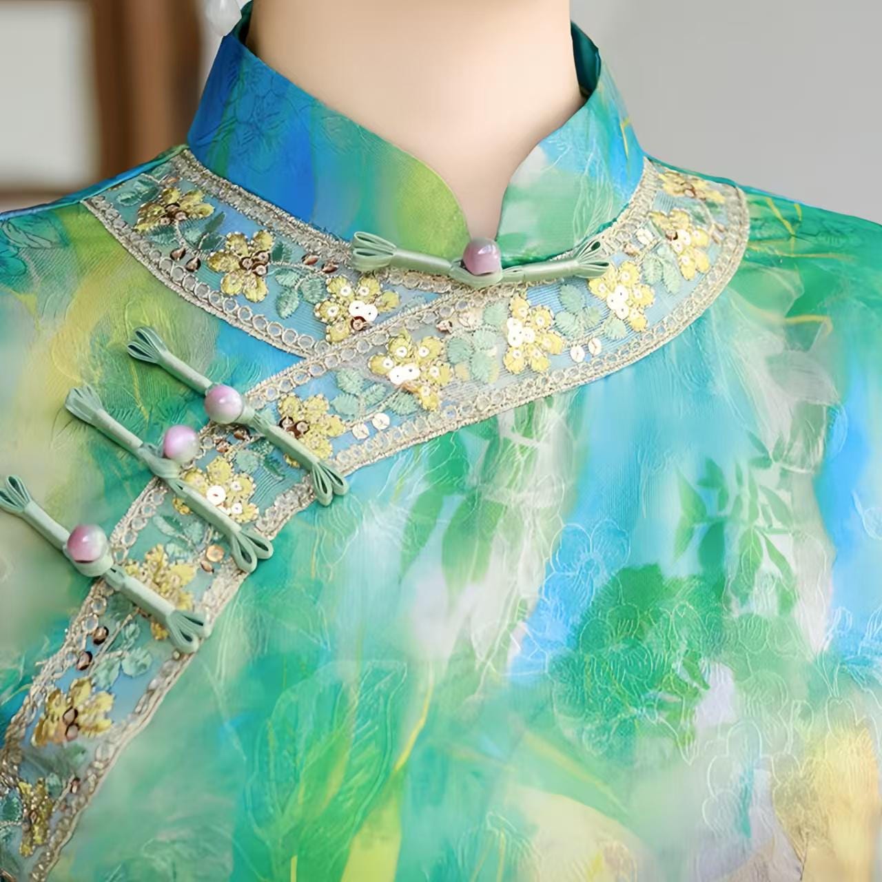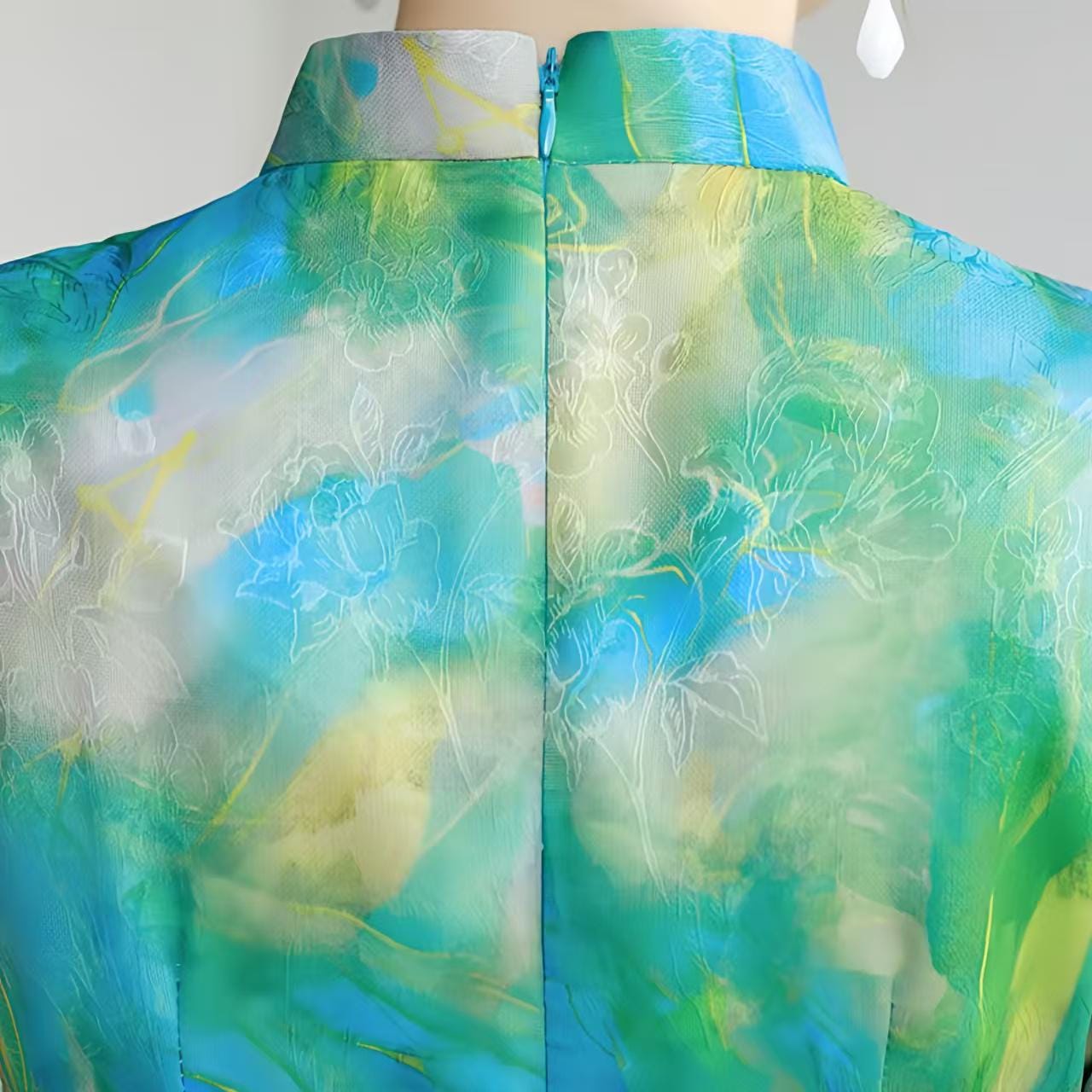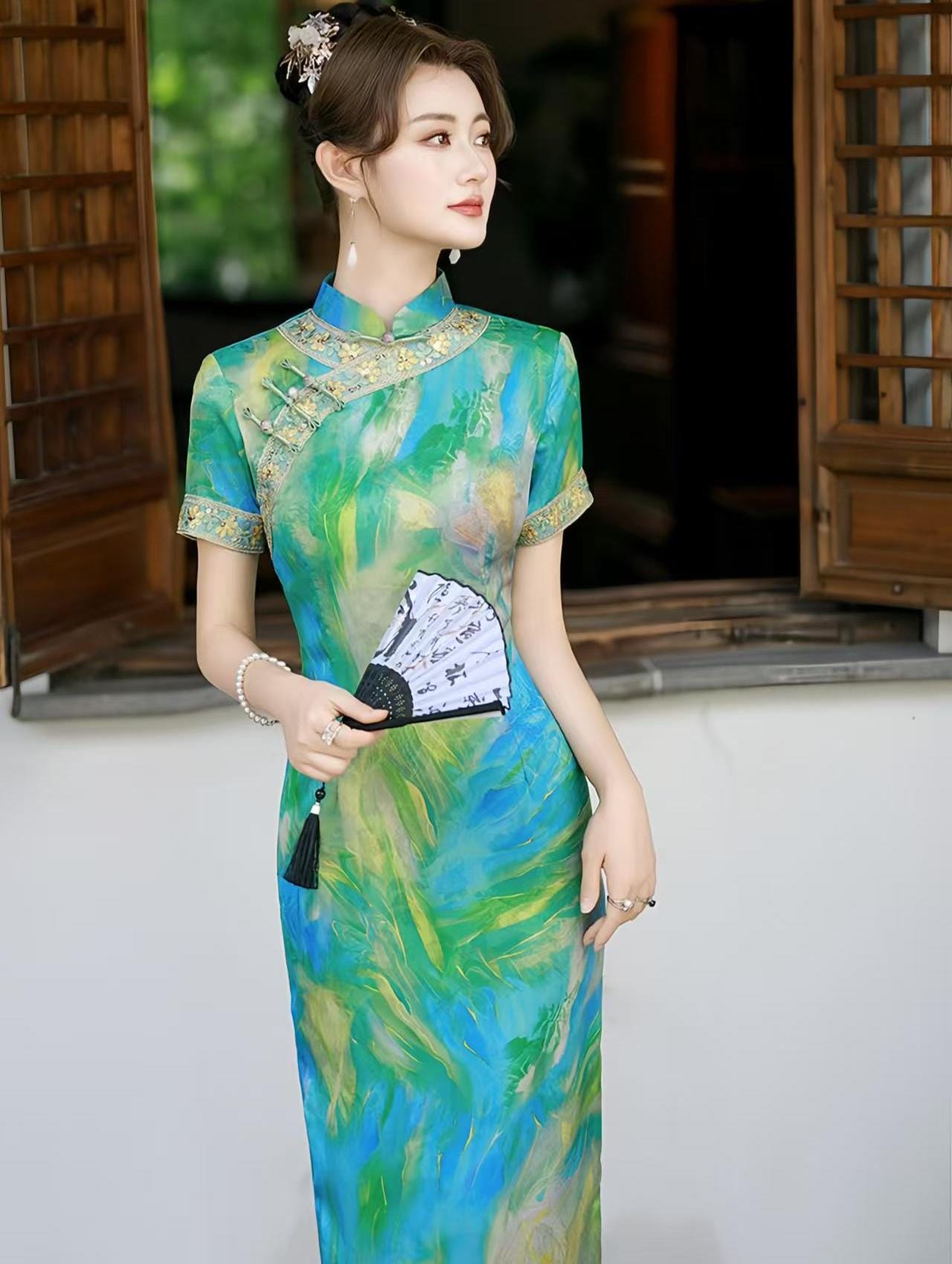 This handmade jacquard qipao combines the elegance of traditional Chinese design with a vibrant artistic flair. Crafted from artificial silk and rayon jacquard, it features a unique watercolor-inspired print in shades of blue, green, and gold, evoking the fluidity and beauty of nature.