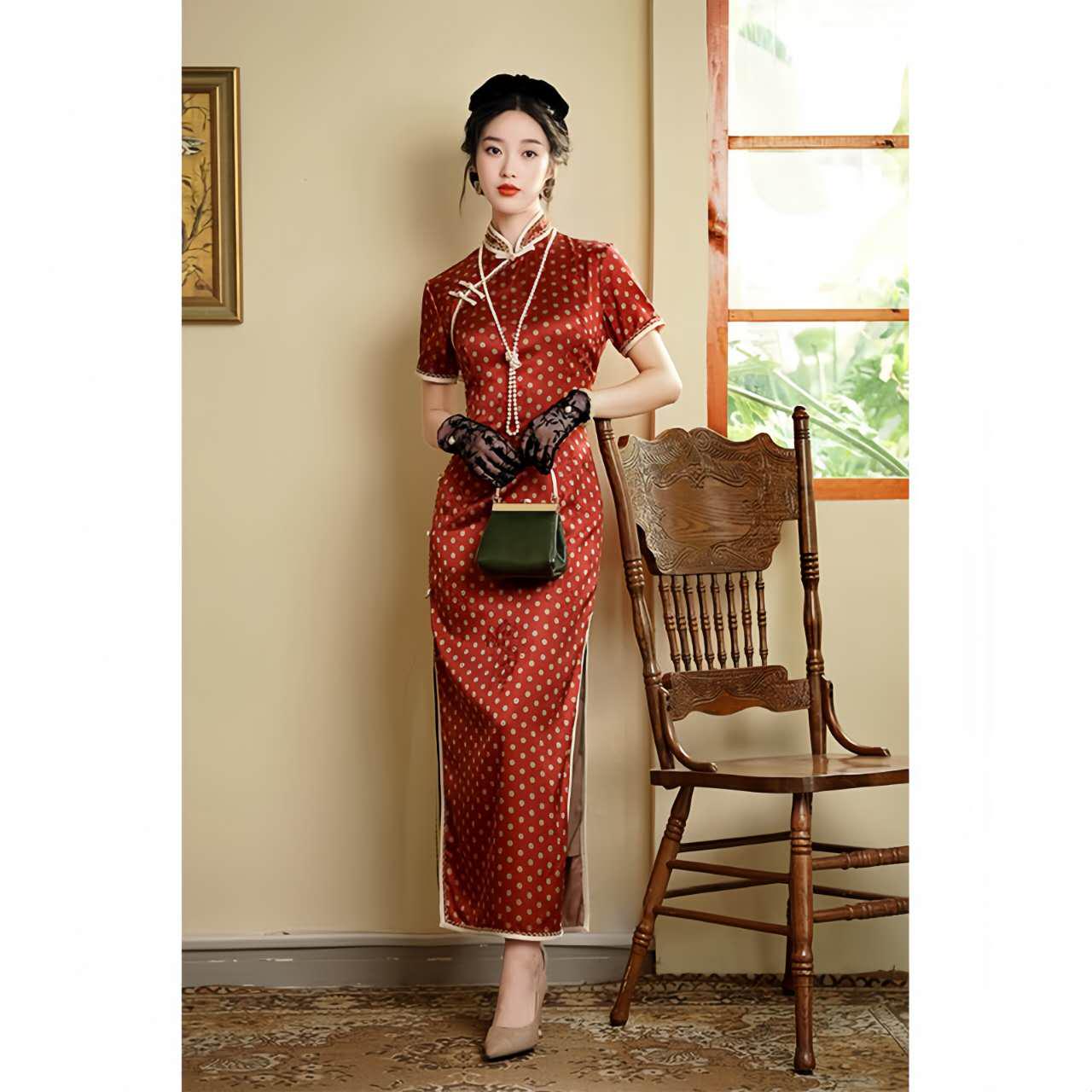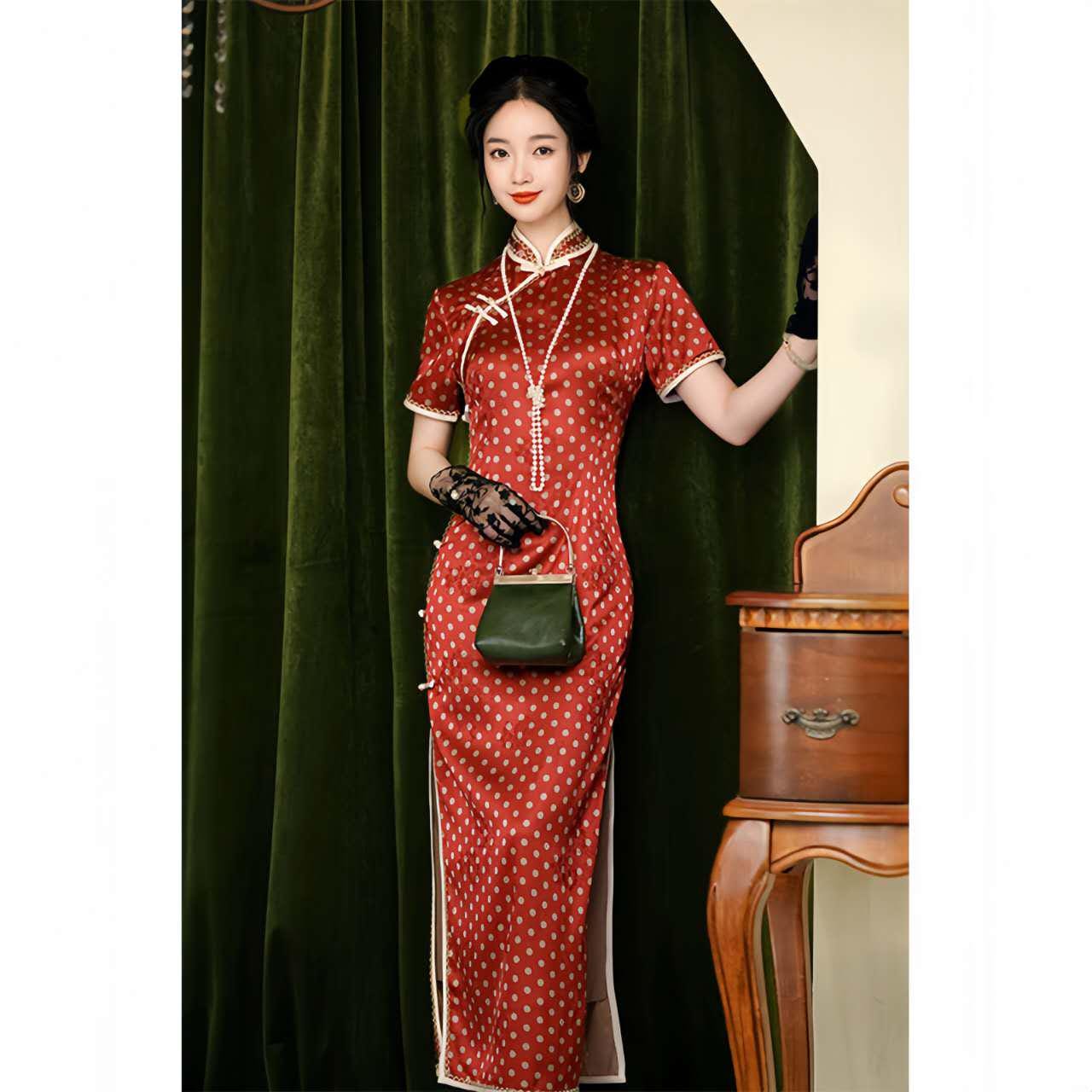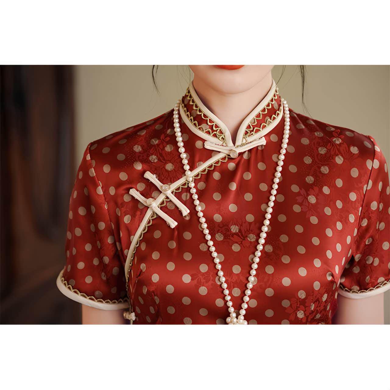 An elegant fusion of East and West, this red polka-dot qipao is inspired by the fashion of the 1930s-era Republic of China, with a refined French feel. Crafted from floral brocade satin, its delicate texture and subtle sheen create a nostalgic yet modern silhouette.