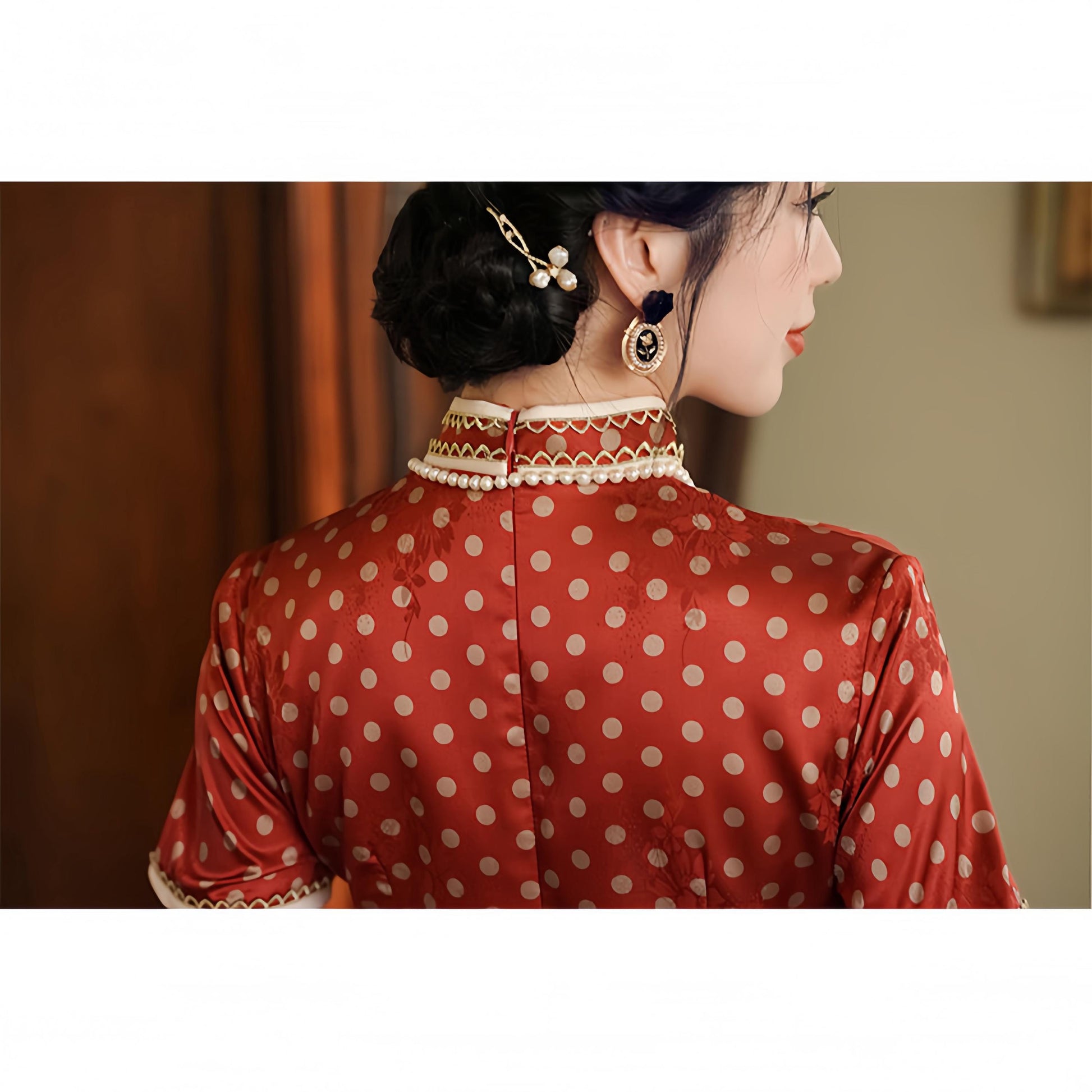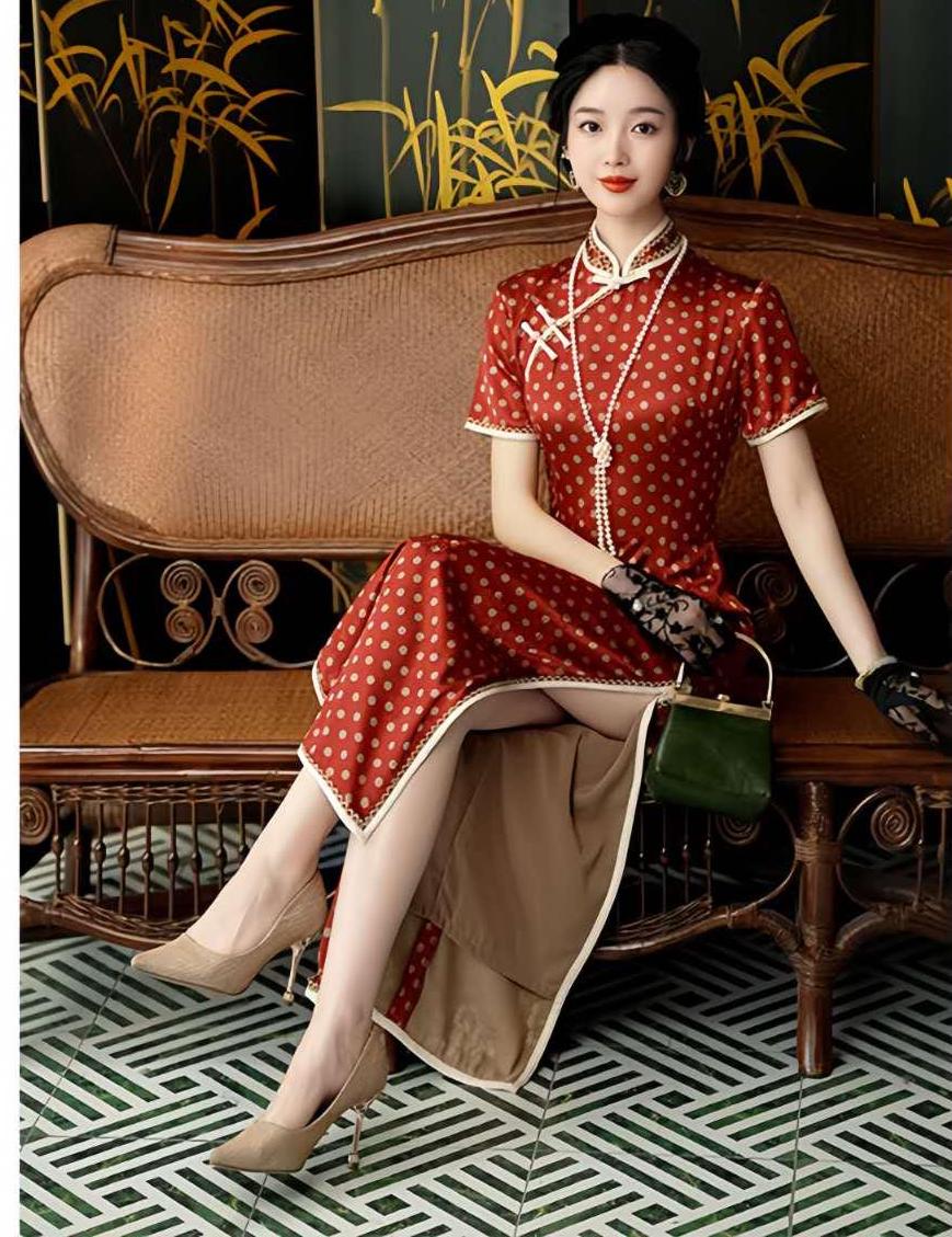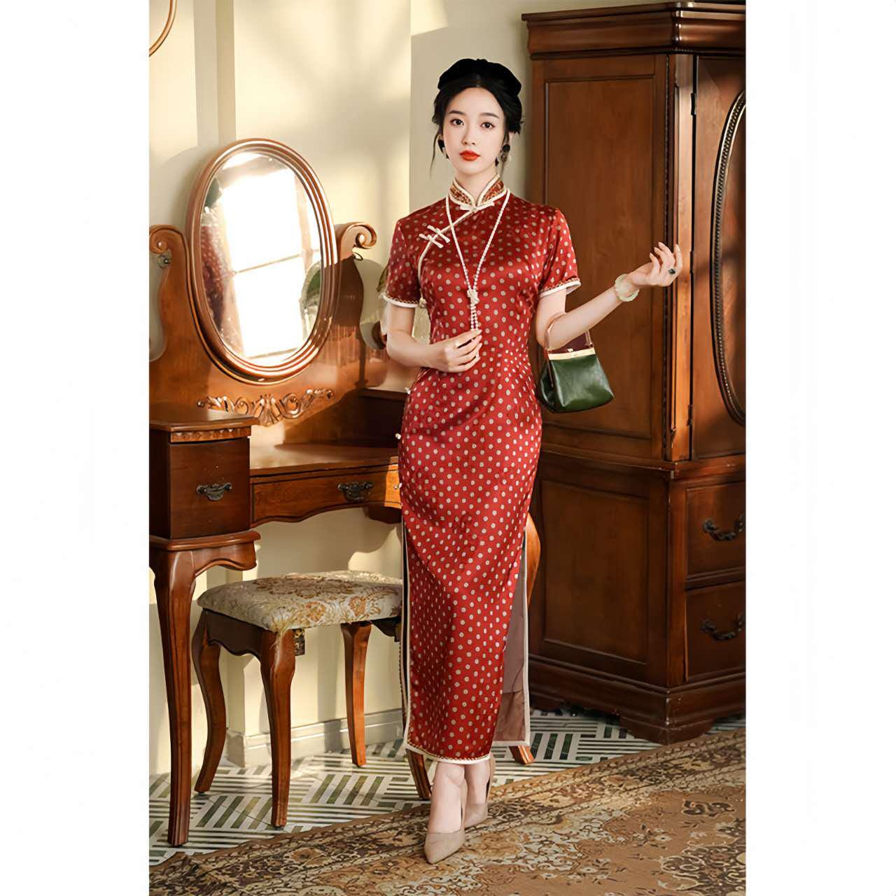 An elegant fusion of East and West, this red polka-dot qipao is inspired by the fashion of the 1930s-era Republic of China, with a refined French feel. Crafted from floral brocade satin, its delicate texture and subtle sheen create a nostalgic yet modern silhouette.