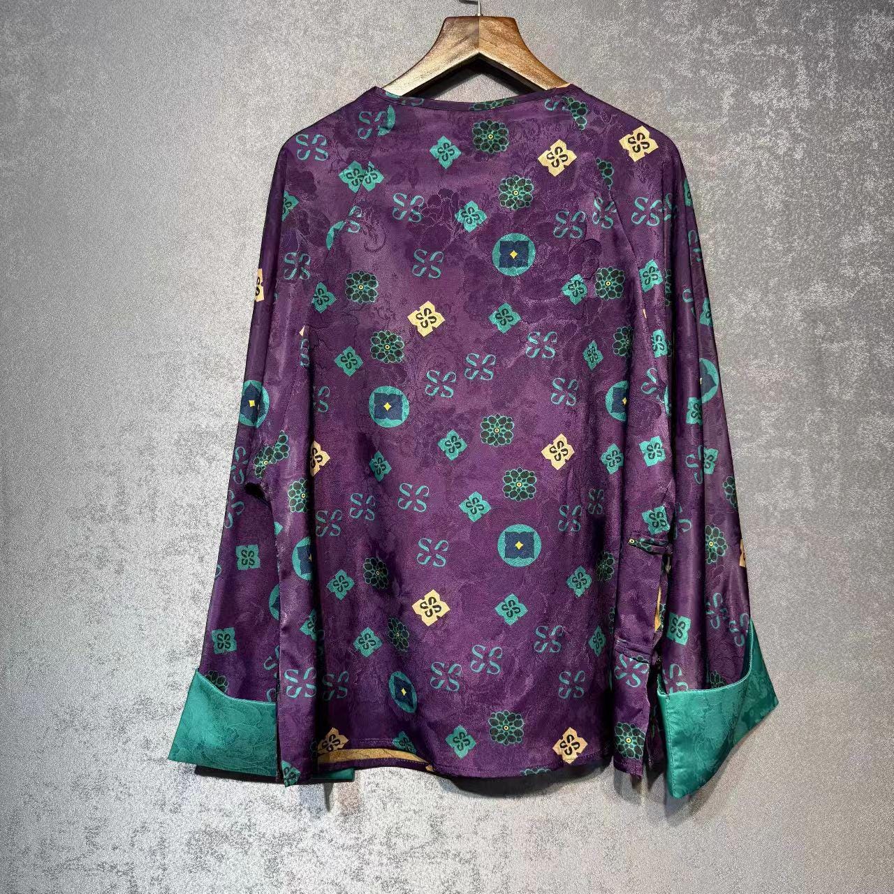 Add heritage and elegance to your wardrobe with this purple Tang blouse, crafted from artificial silk brocade (rayon silk jacquard). Inspired by traditional Chinese clothing, it features a Mandarin collar with Chinese button closure, full sleeves with contrasting green cuffs, and a vibrant geometric floral print.