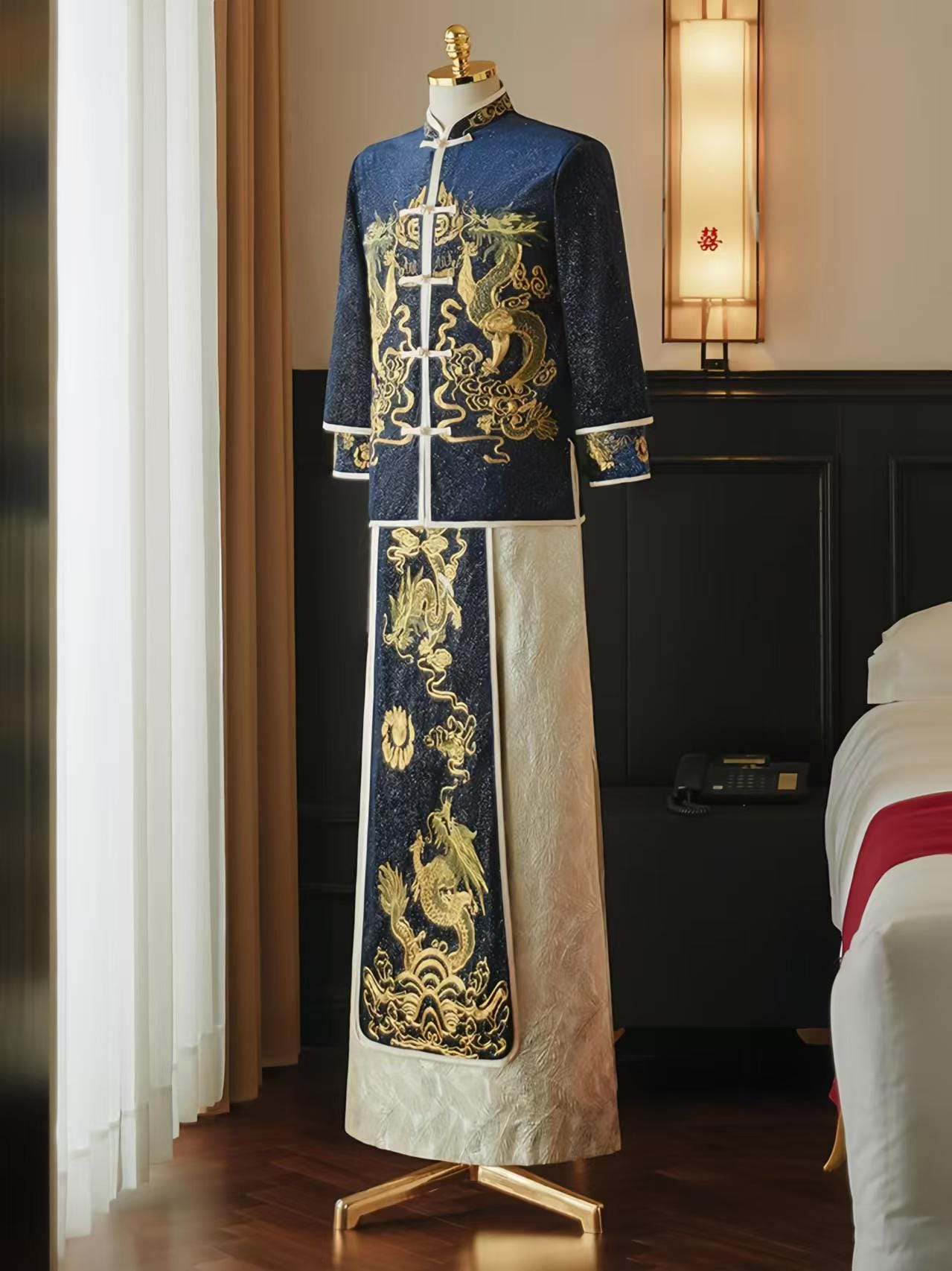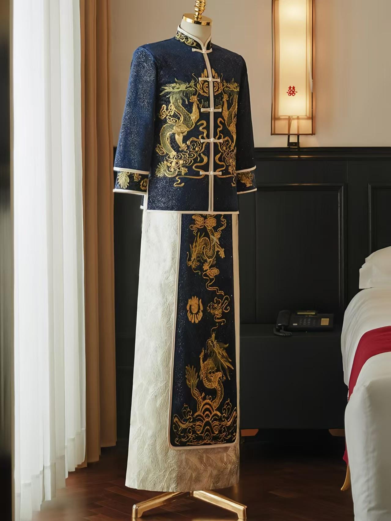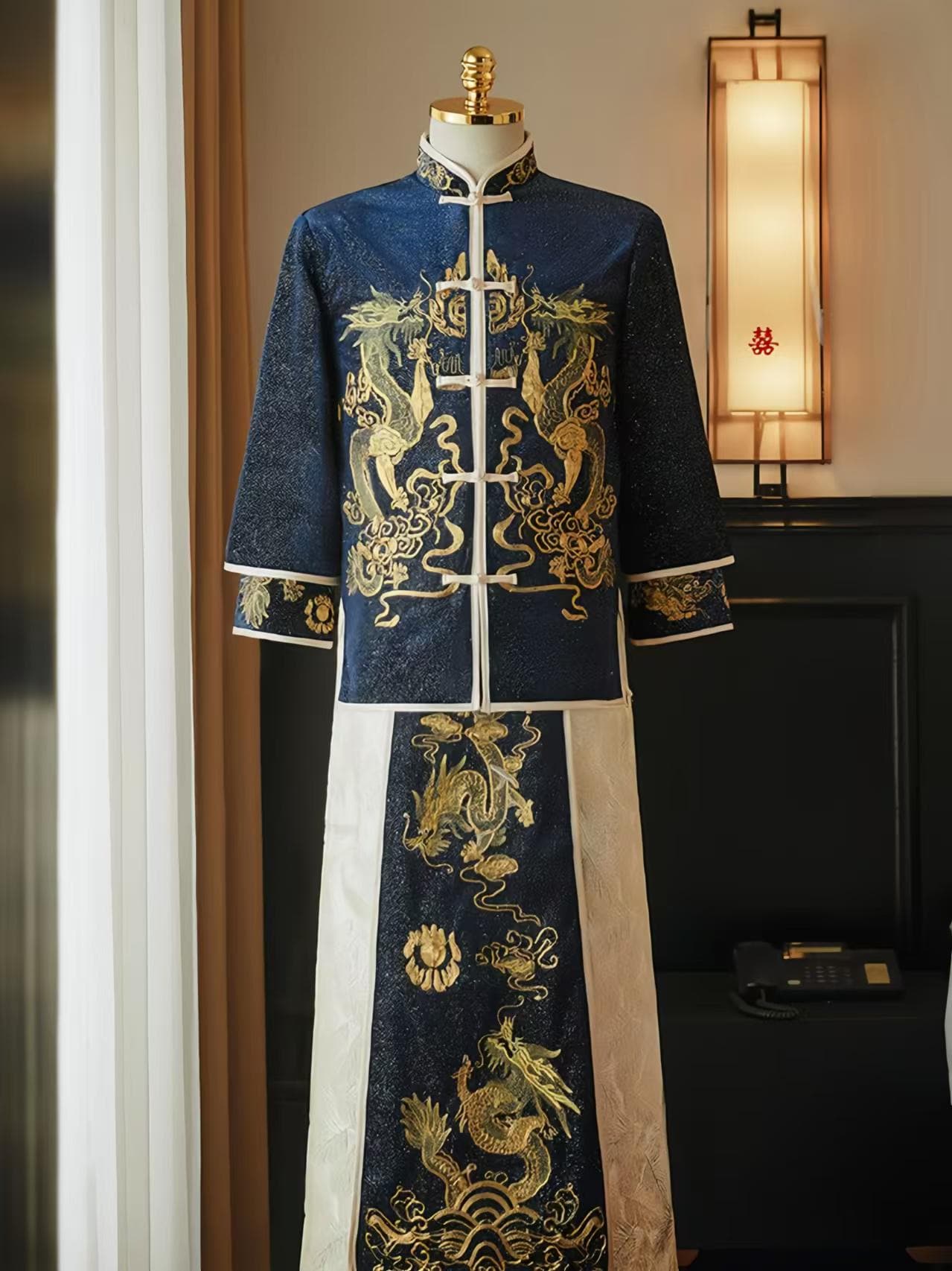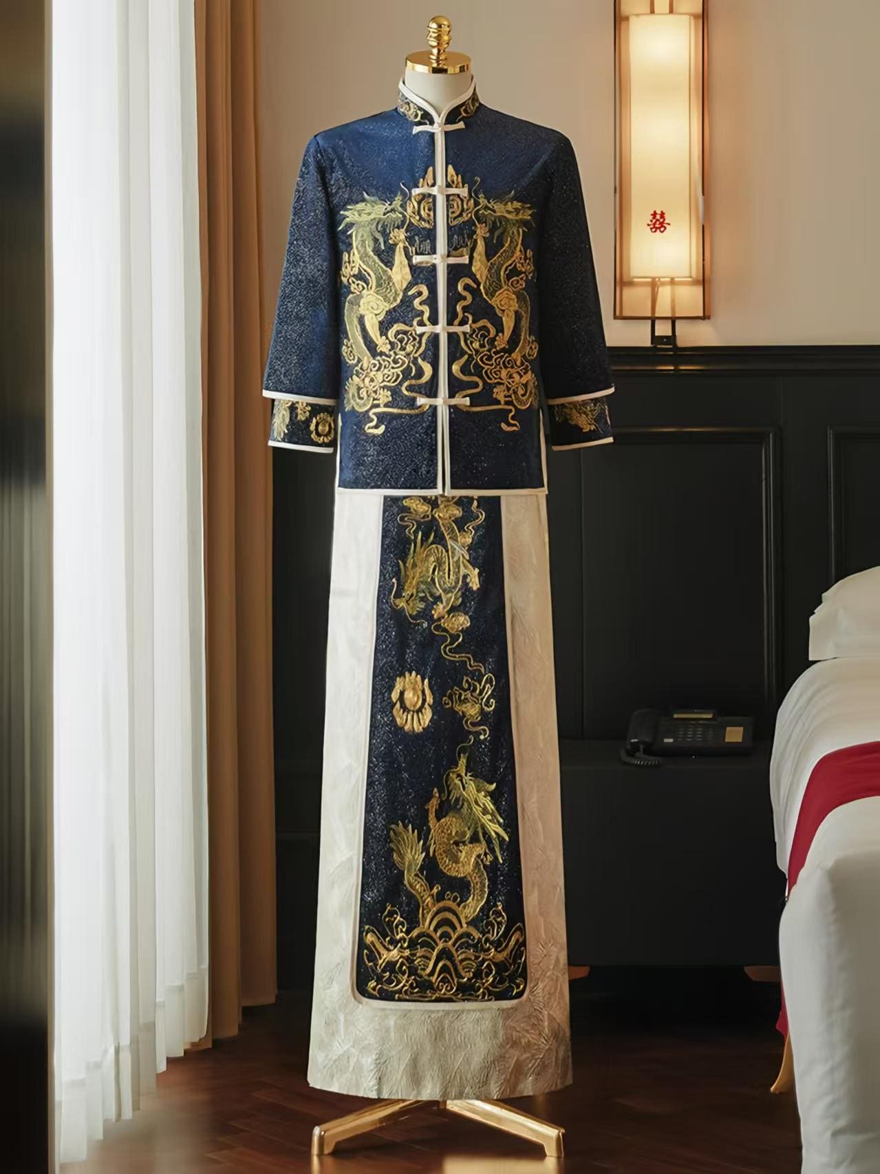 Celebrate your special day with timeless elegance wearing this traditional Chinese groom suit. Crafted from luxurious brocade, this two-piece set includes a dark blue jacket and a long robe embroidered with golden dragons and phoenixes, symbols of prosperity, harmony, and eternal love. The Mandarin collar and full sleeves highlight the oriental craftsmanship, while exquisite embroidery adds a majestic touch. Perfect for grooms at Chinese weddings, cultural ceremonies, or themed celebrations, this attire reflects heritage, sophistication, and cultural pride.