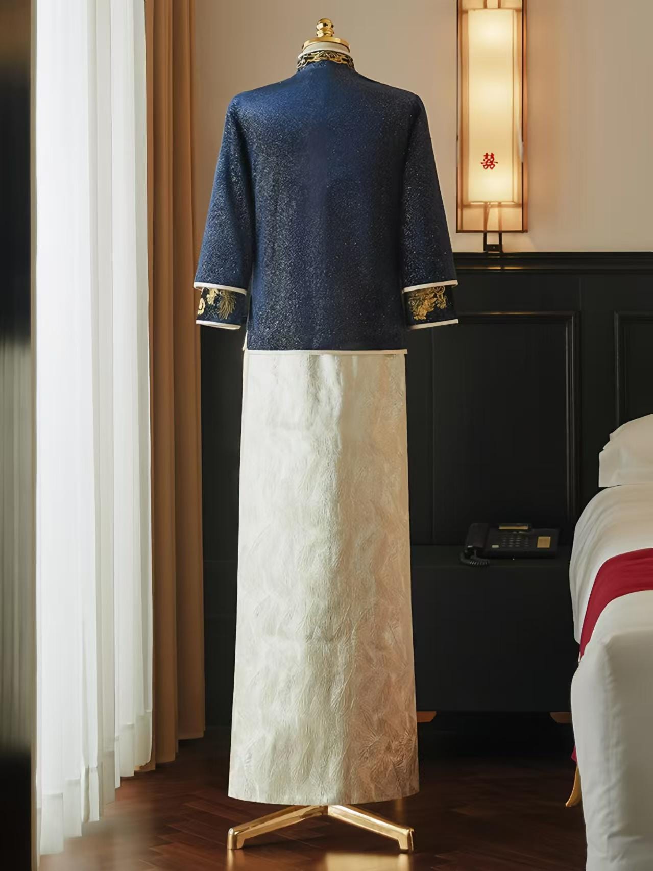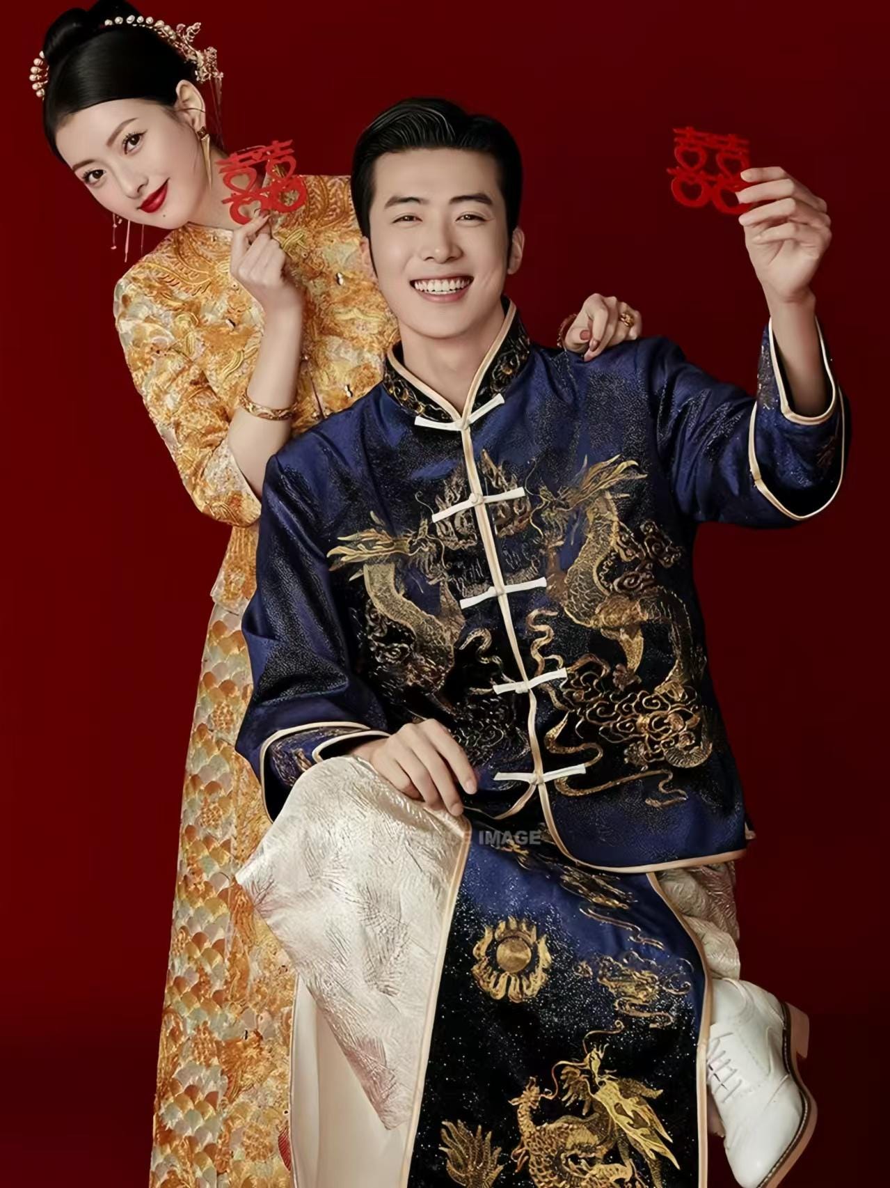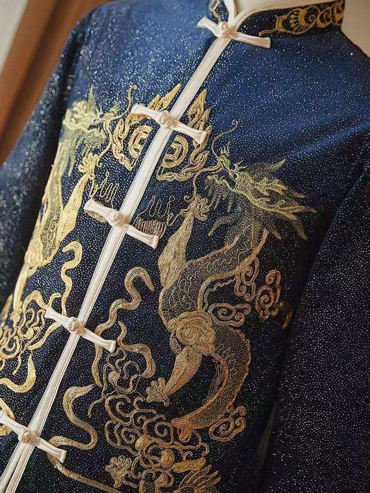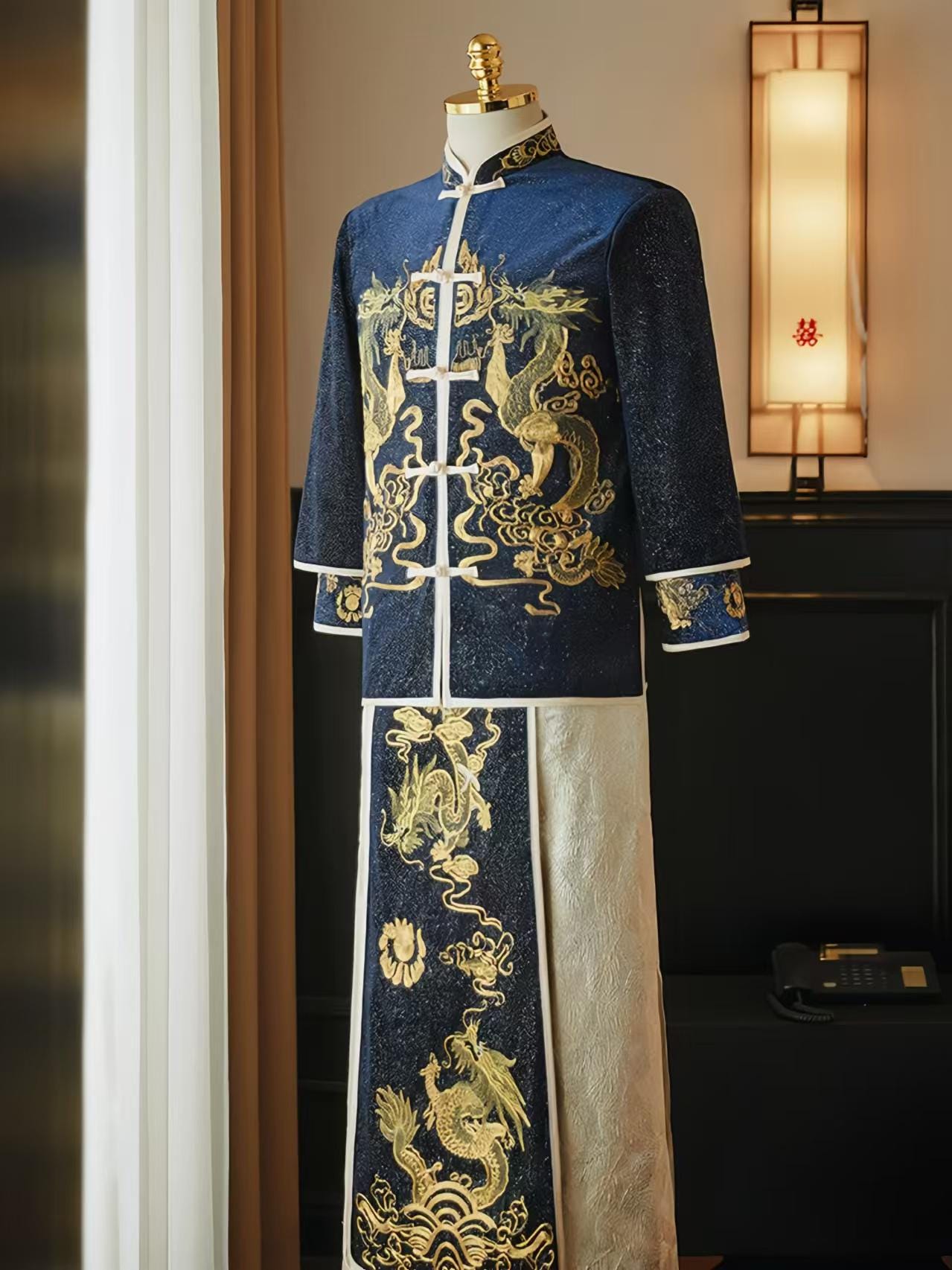 Celebrate your special day with timeless elegance wearing this traditional Chinese groom suit. Crafted from luxurious brocade, this two-piece set includes a dark blue jacket and a long robe embroidered with golden dragons and phoenixes, symbols of prosperity, harmony, and eternal love. The Mandarin collar and full sleeves highlight the oriental craftsmanship, while exquisite embroidery adds a majestic touch. Perfect for grooms at Chinese weddings, cultural ceremonies, or themed celebrations, this attire reflects heritage, sophistication, and cultural pride.