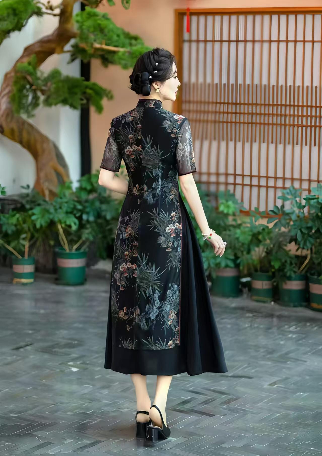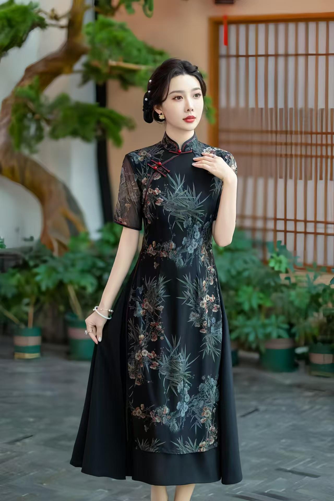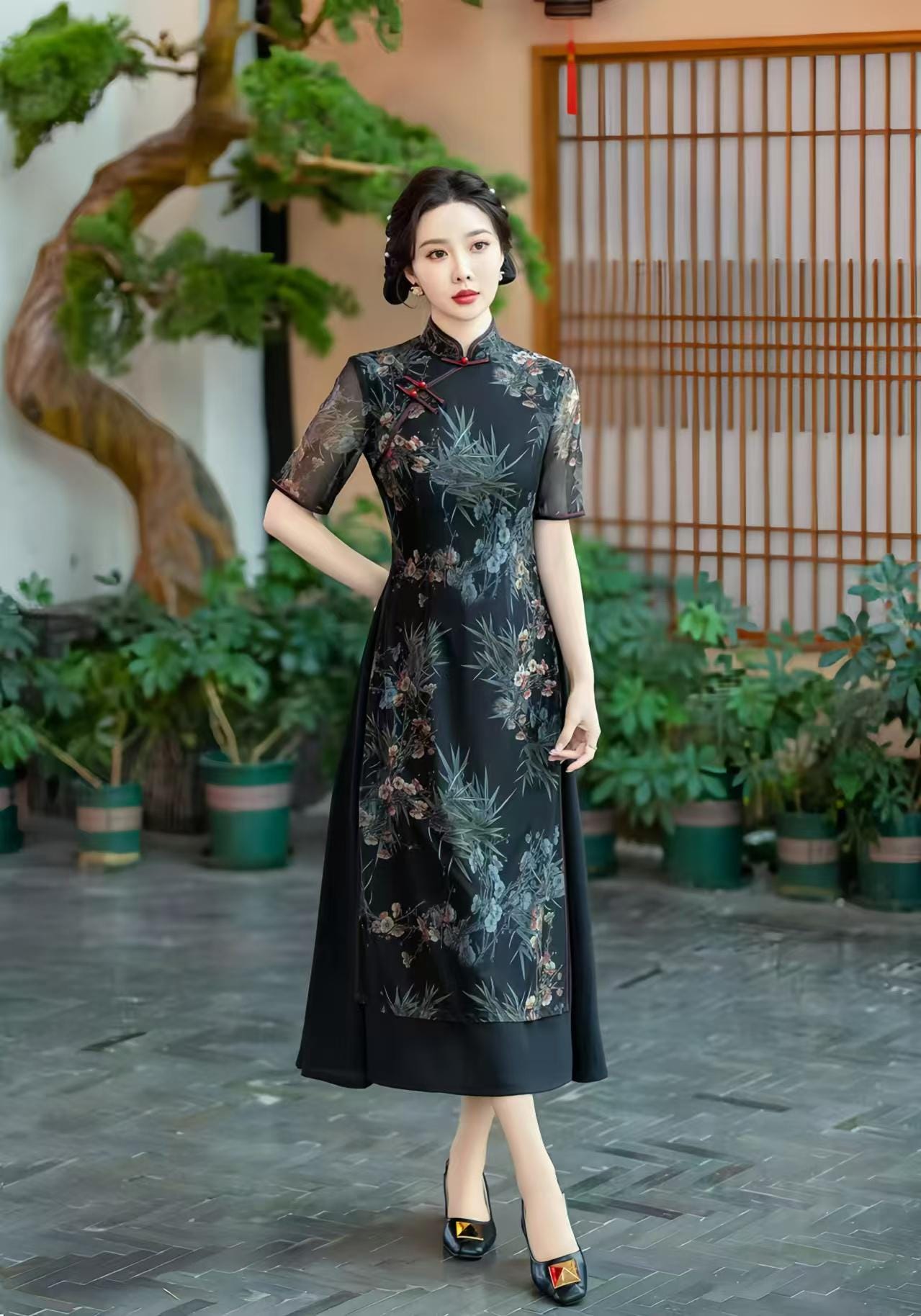 Discover timeless elegance with this modern qipao inspired by the Vietnamese Ao Dai. Crafted from delicate cut-out floral fabric with a sheer overlay, it features an elegant Mandarin collar, mid-length sleeves, and a flowing, layered skirt for a sophisticated touch. The black base is adorned with oriental bamboo and floral motifs, a symbol of harmony and refinement. With its elegant cut and cultural charm, this dress is ideal for weddings, banquets, cultural festivals, and formal events.