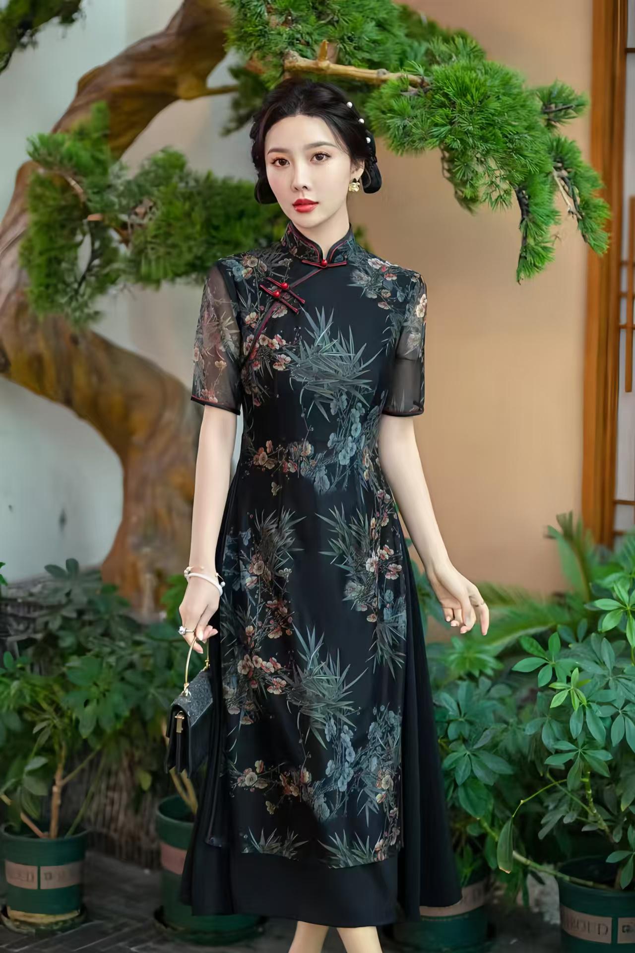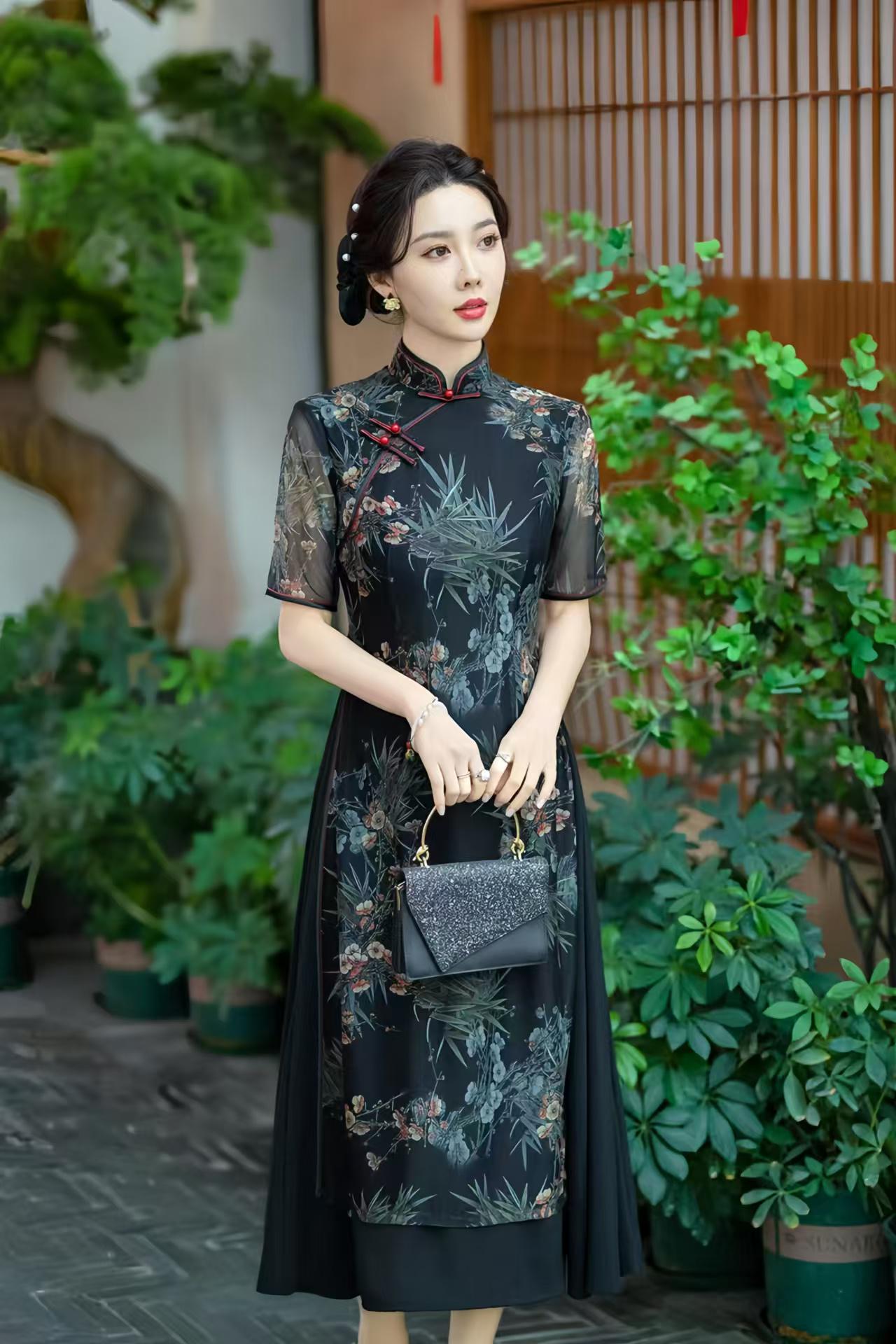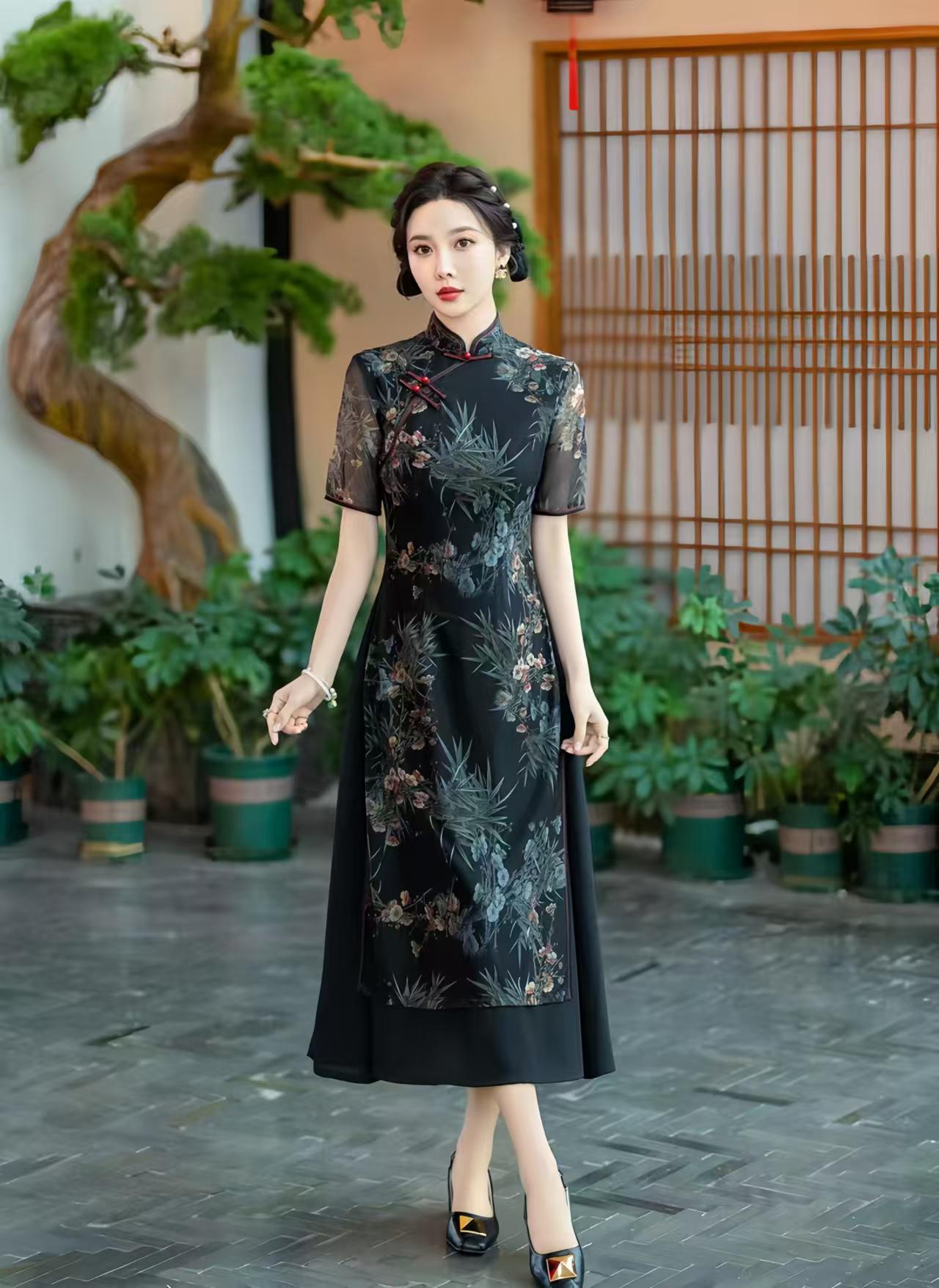 Discover timeless elegance with this modern qipao inspired by the Vietnamese Ao Dai. Crafted from delicate cut-out floral fabric with a sheer overlay, it features an elegant Mandarin collar, mid-length sleeves, and a flowing, layered skirt for a sophisticated touch. The black base is adorned with oriental bamboo and floral motifs, a symbol of harmony and refinement. With its elegant cut and cultural charm, this dress is ideal for weddings, banquets, cultural festivals, and formal events.