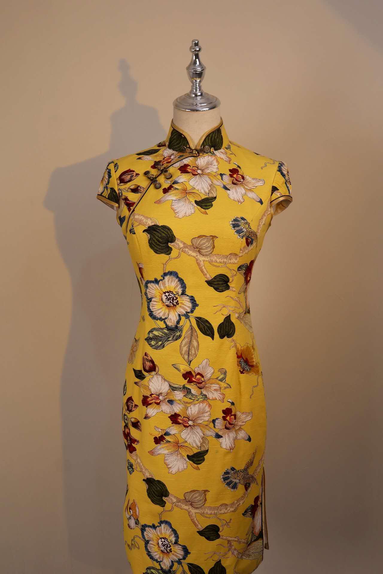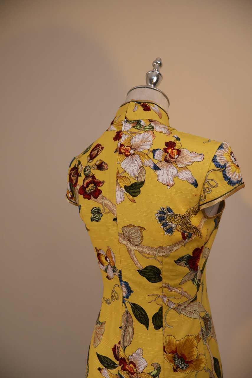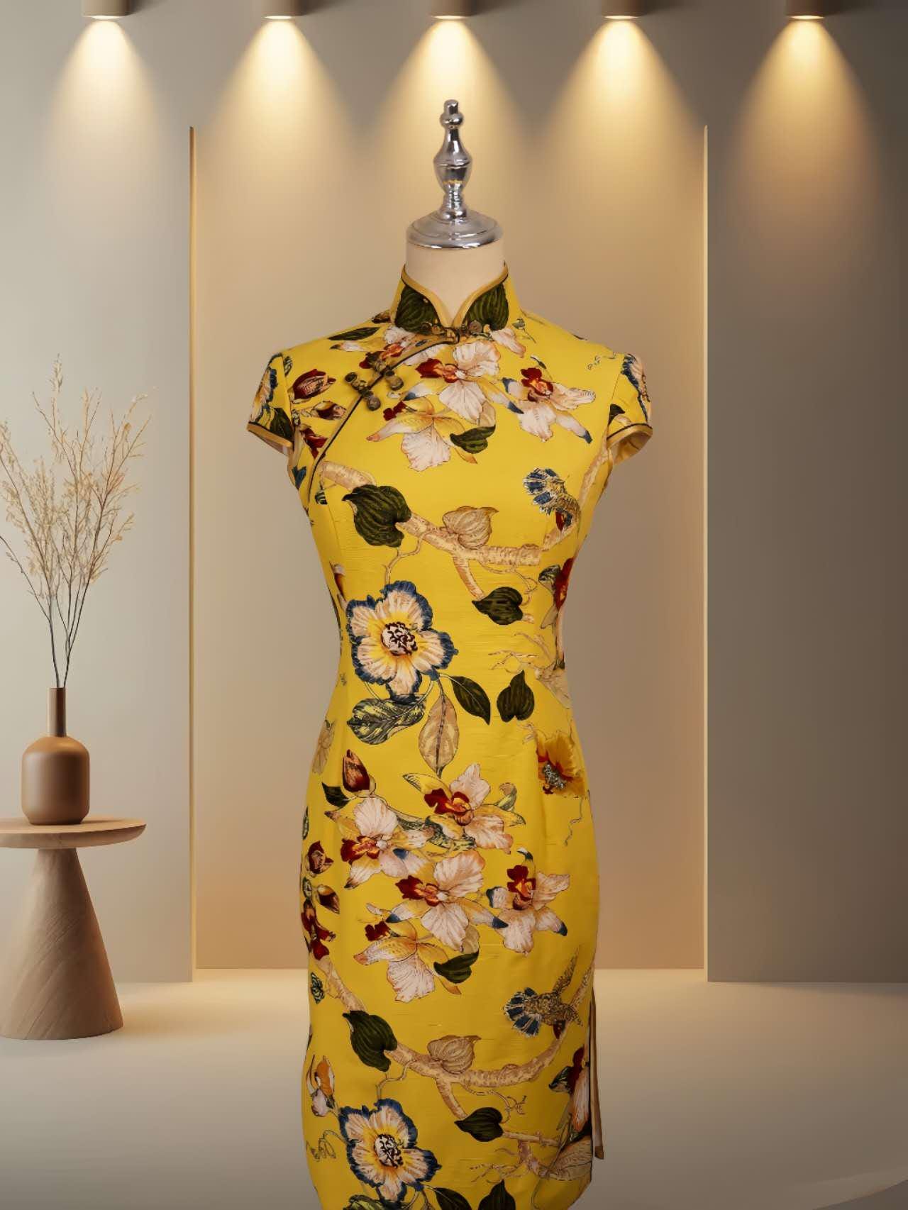 Fill your day with color with this yellow floral cotton qipao, a charming fusion of Chinese tradition and modern comfort. Made from high-quality, breathable cotton, it features an elegant floral and bird print, a classic Mandarin collar, and traditional Chinese closures.