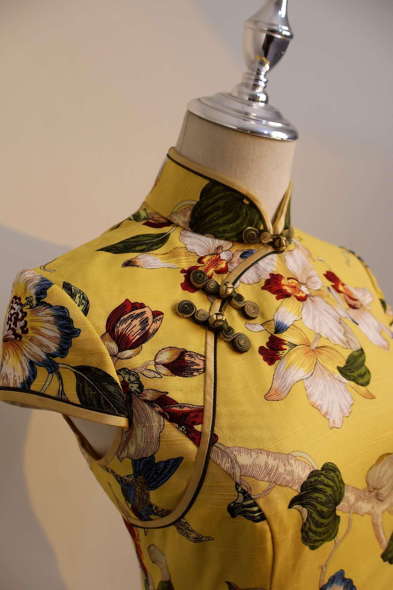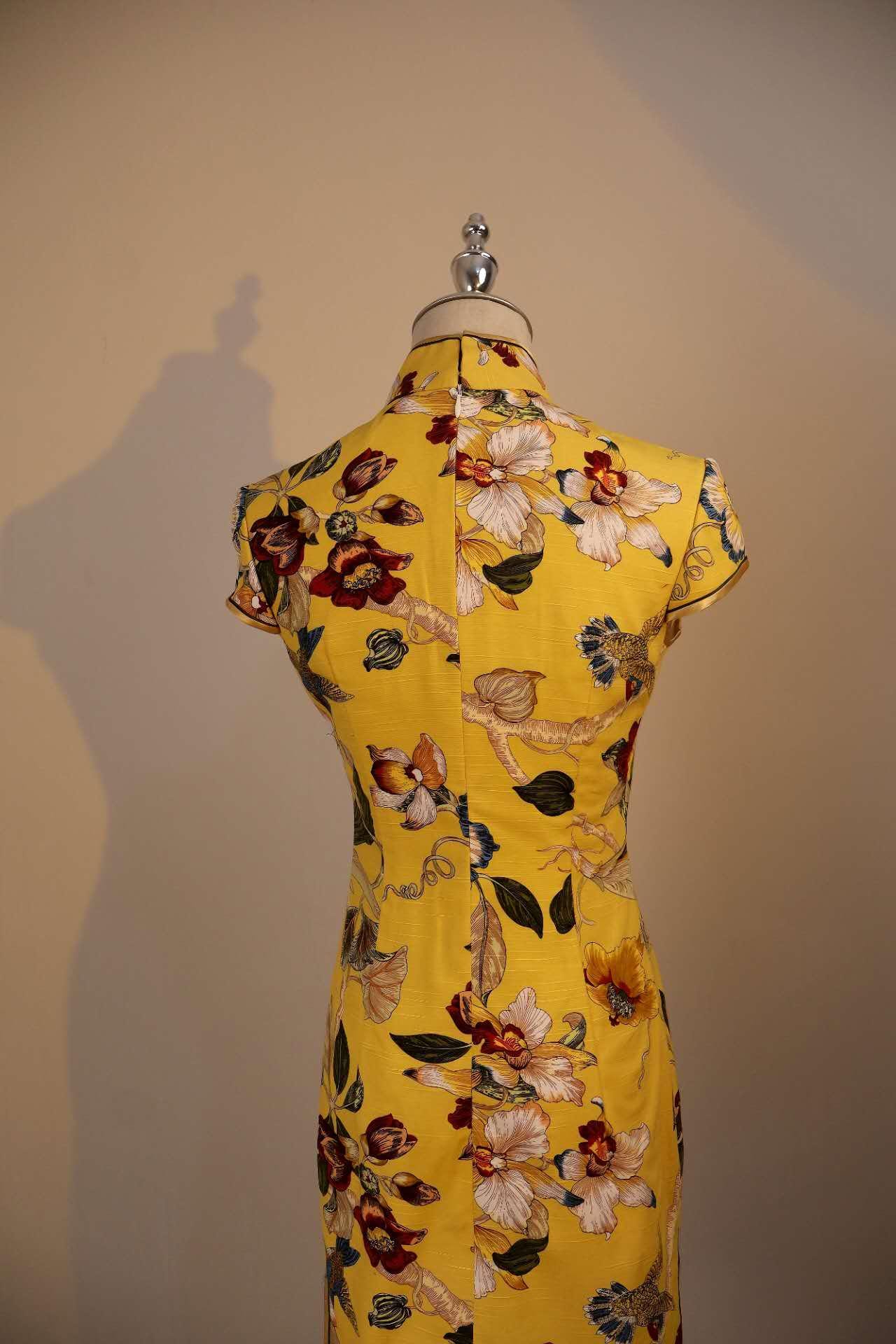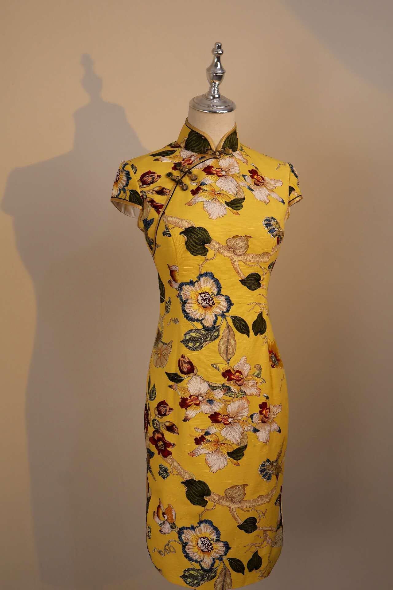 Fill your day with color with this yellow floral cotton qipao, a charming fusion of Chinese tradition and modern comfort. Made from high-quality, breathable cotton, it features an elegant floral and bird print, a classic Mandarin collar, and traditional Chinese closures.