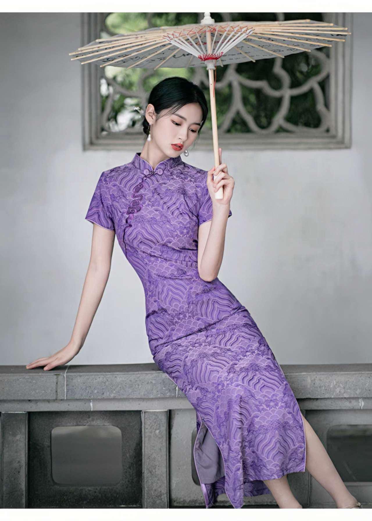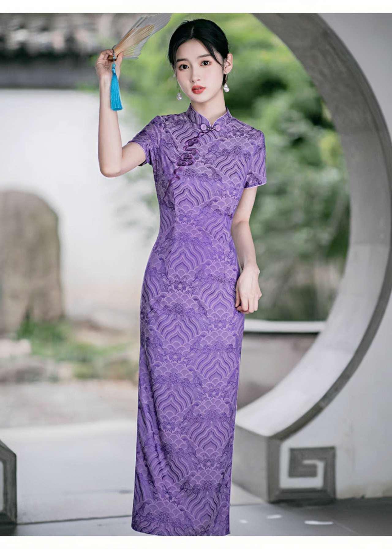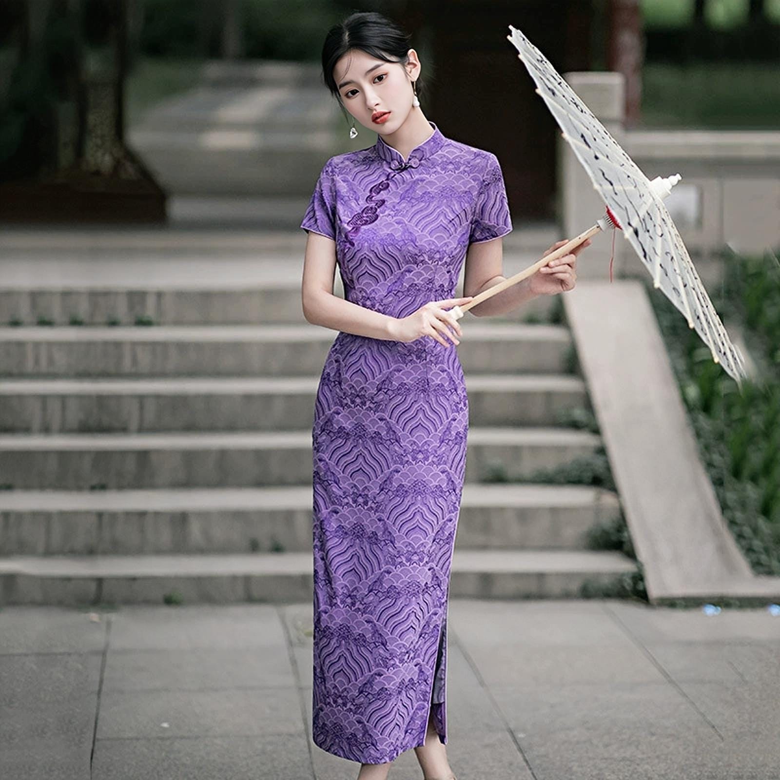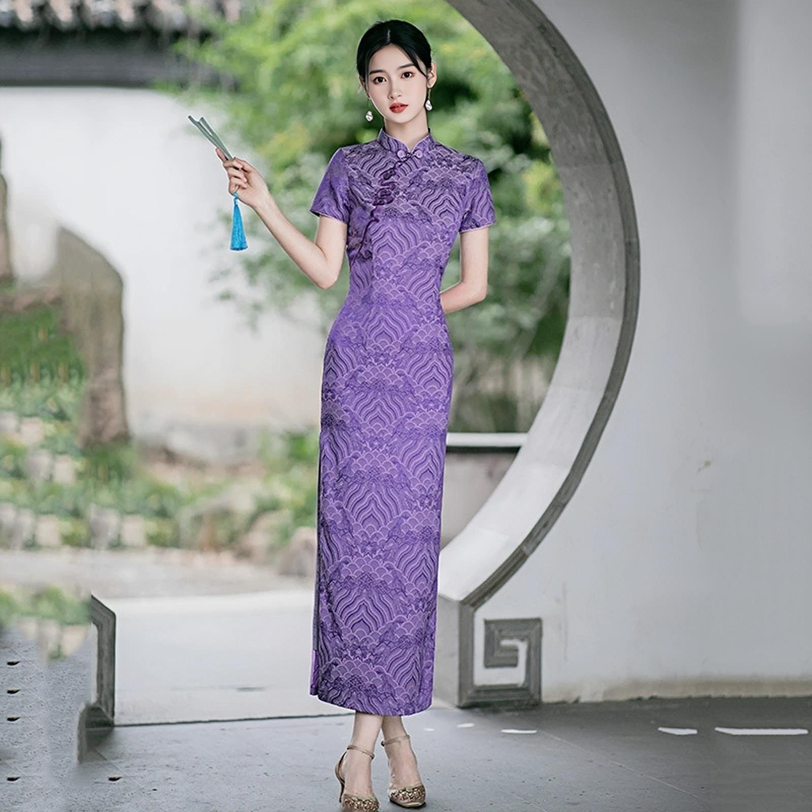 Enter a world of timeless elegance with this vintage purple qipao dress, crafted from luxurious Hualuo fabric with delicate, wavy brocade floral motifs. The traditional design features a classic Mao collar, decorative Chinese buttons, and a mid-calf length (approximately 127 cm) that combines style with modesty.