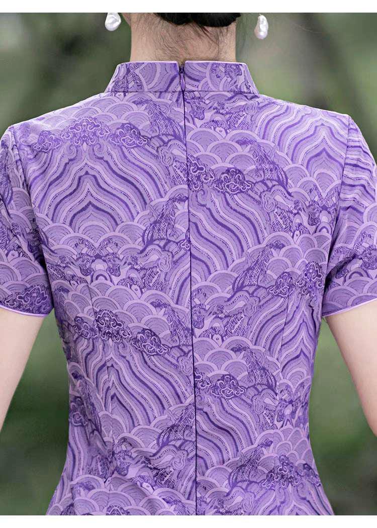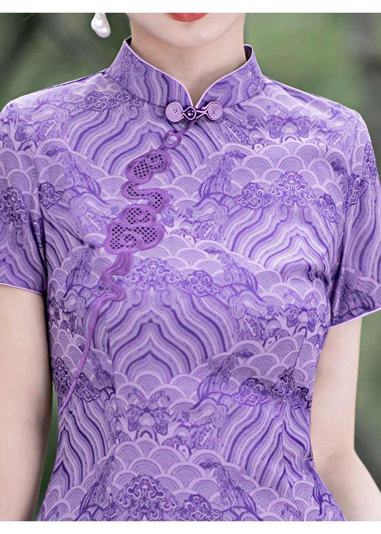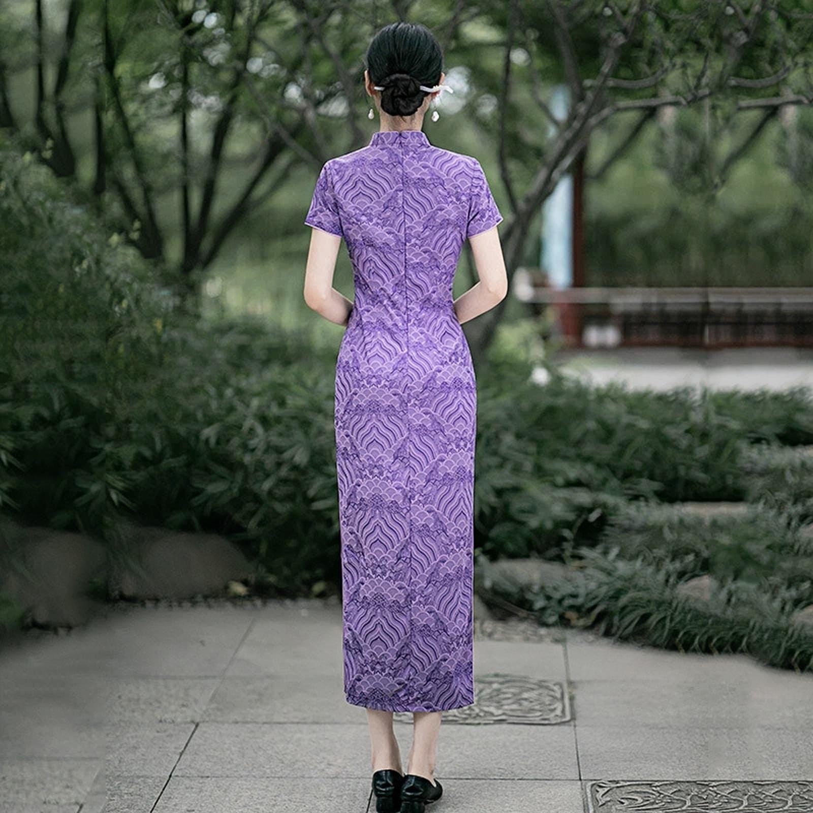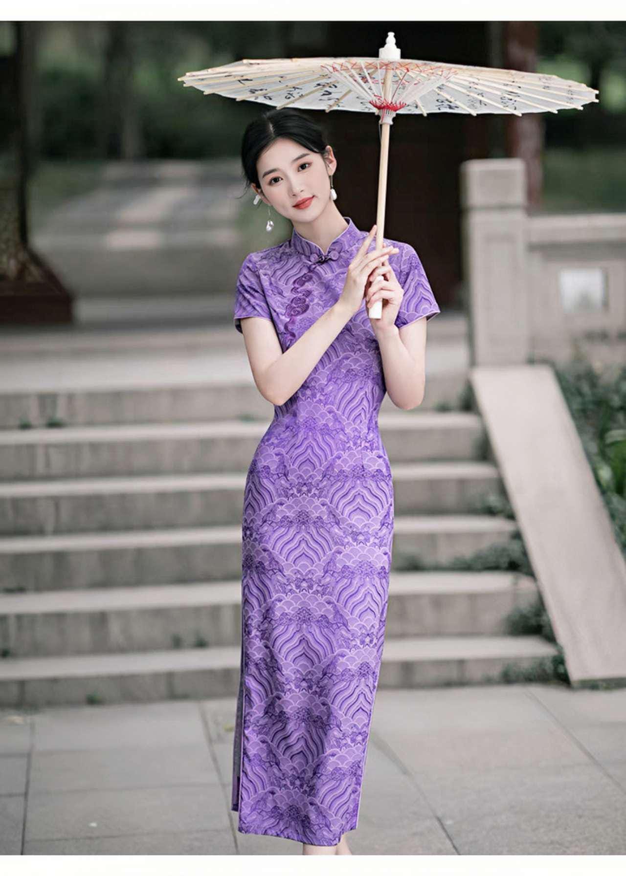 Enter a world of timeless elegance with this vintage purple qipao dress, crafted from luxurious Hualuo fabric with delicate, wavy brocade floral motifs. The traditional design features a classic Mao collar, decorative Chinese buttons, and a mid-calf length (approximately 127 cm) that combines style with modesty.
