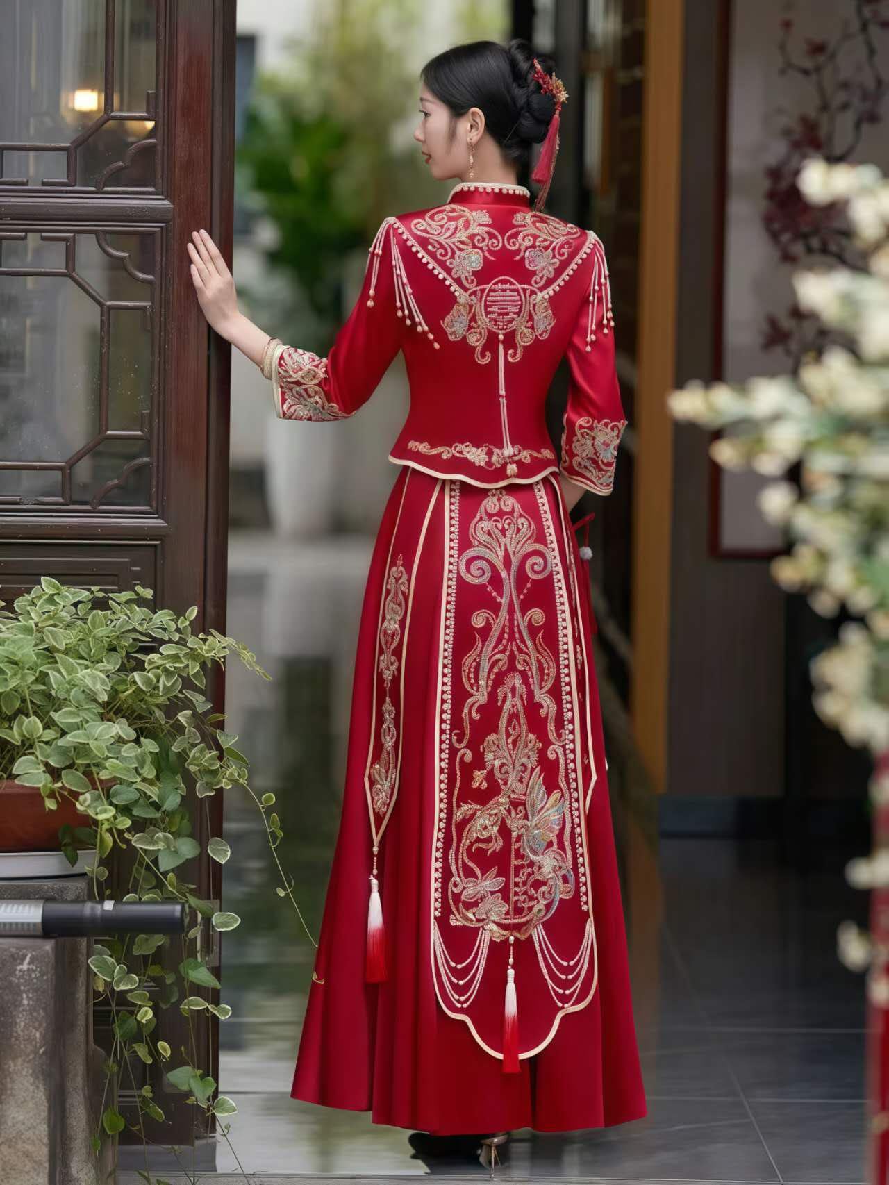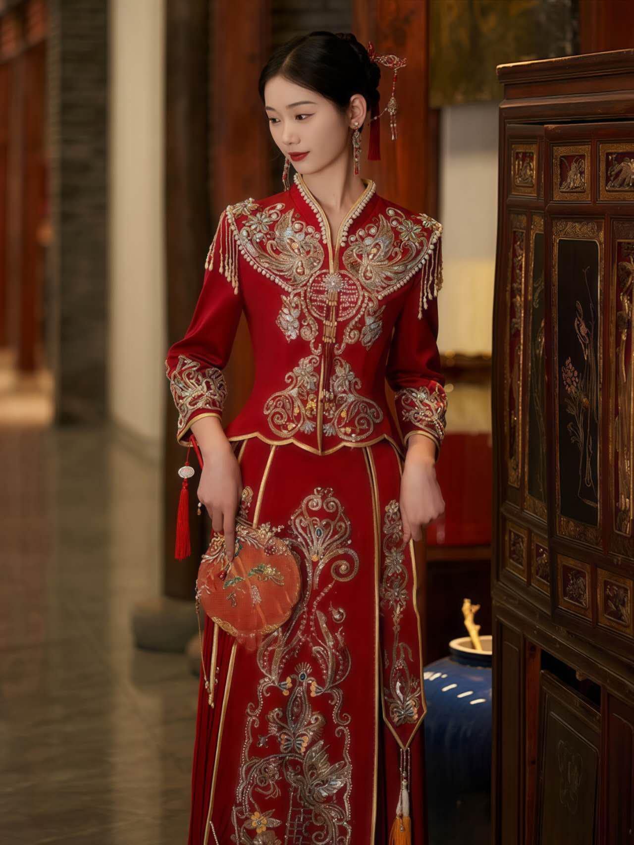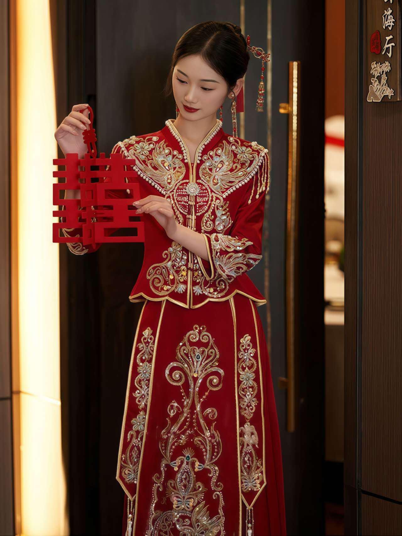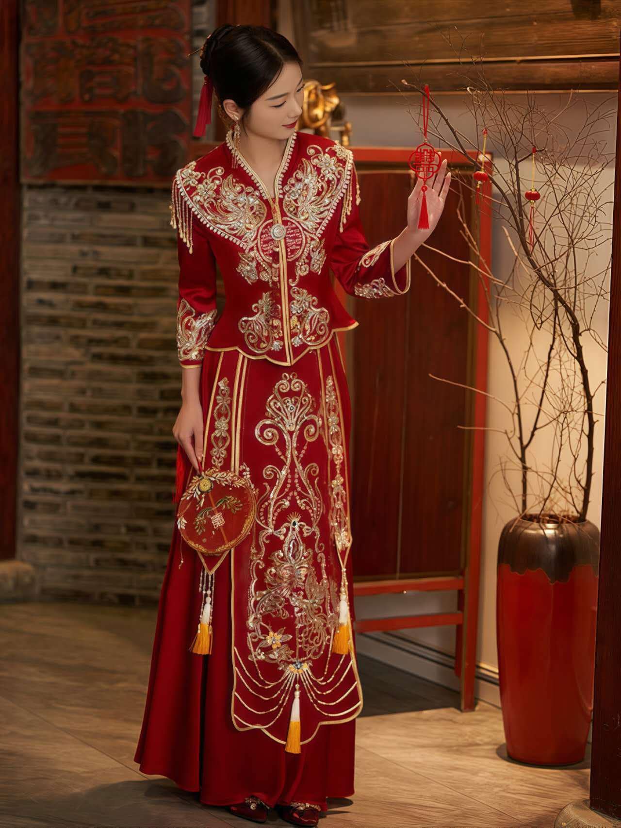 This elegant red two-piece set is a modern interpretation of the classic Chinese Qun Kwa wedding dress. Adorned with phoenix and floral embroidery and decorative tassel details, it represents eternal love, fortune, and family balance.