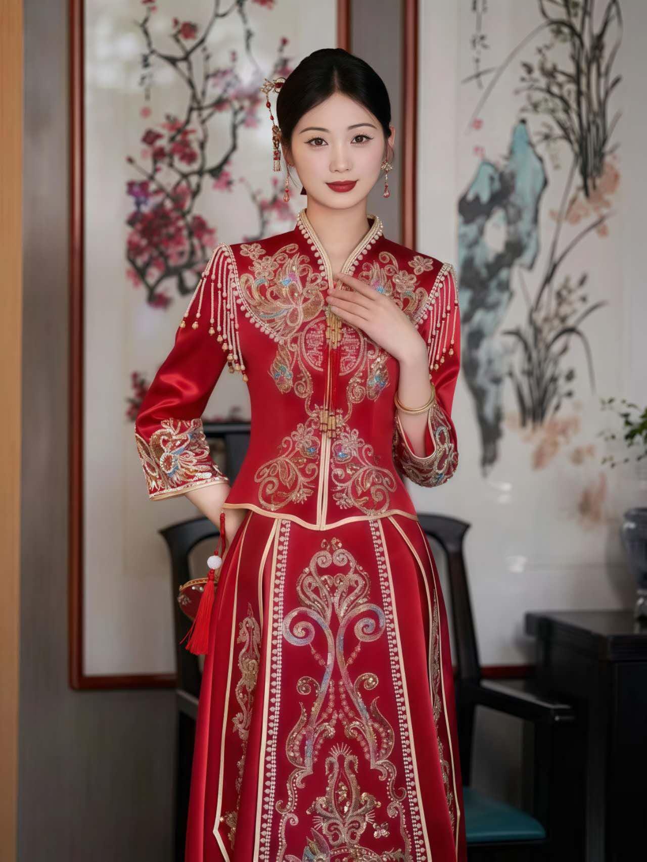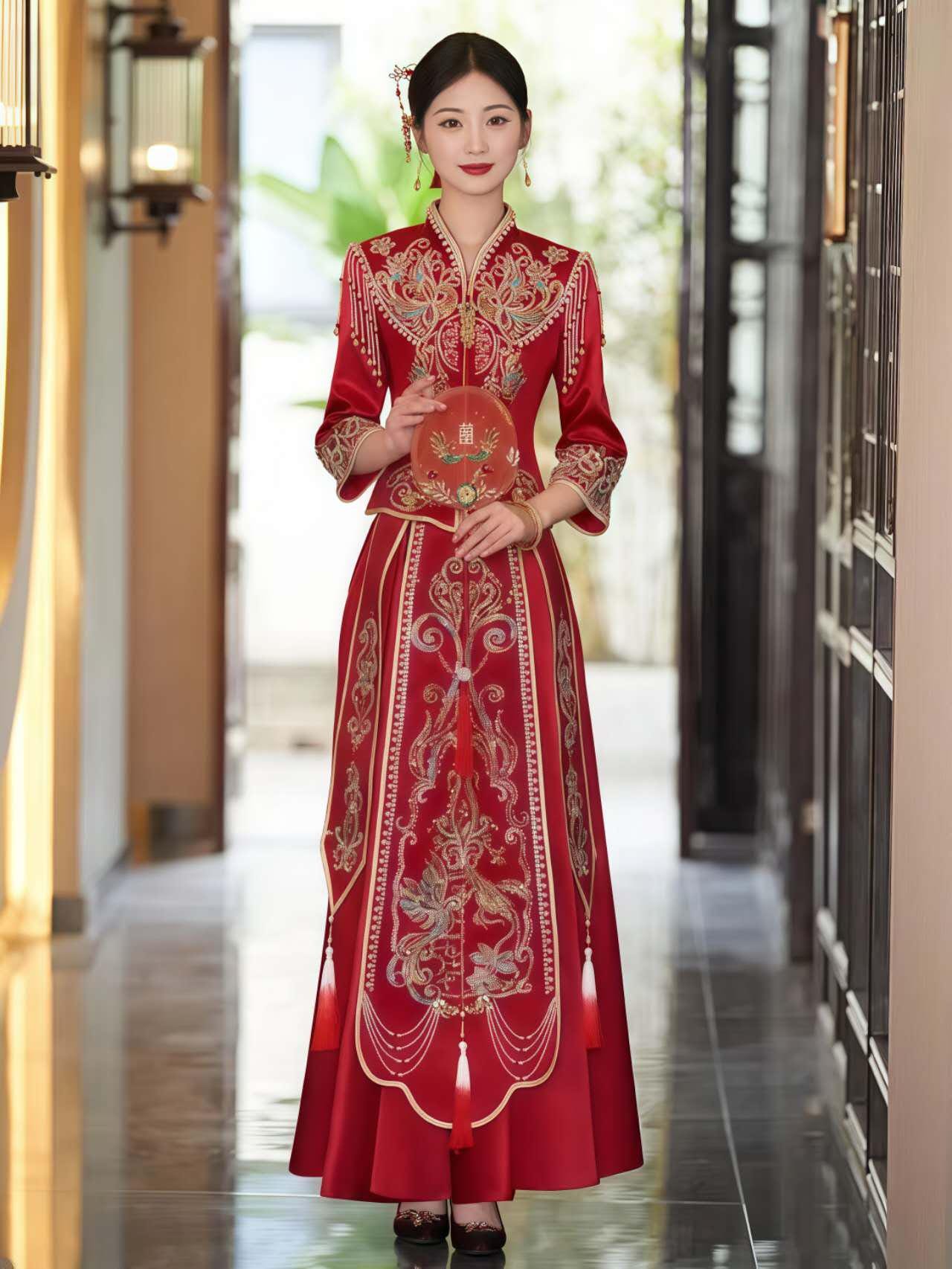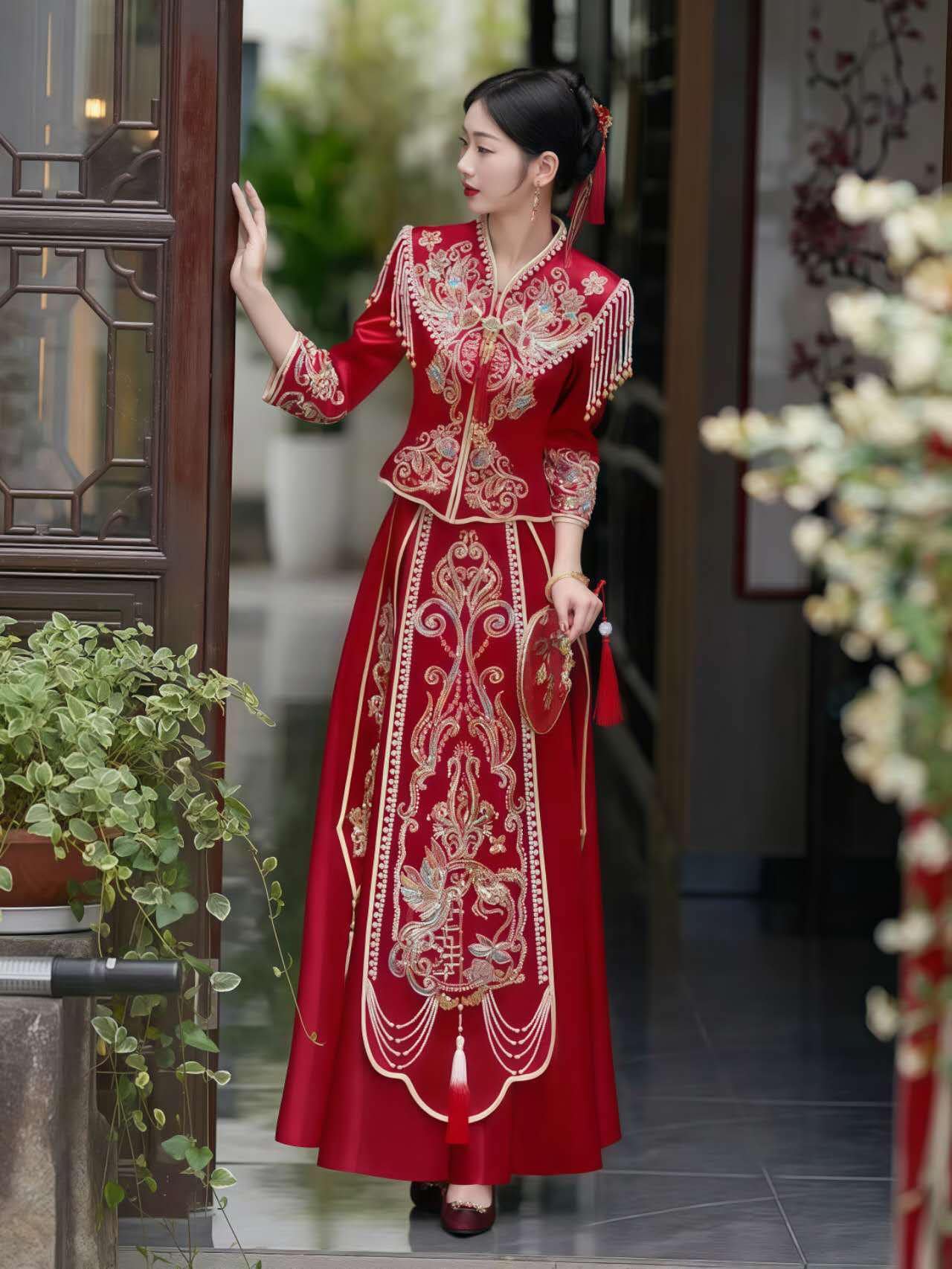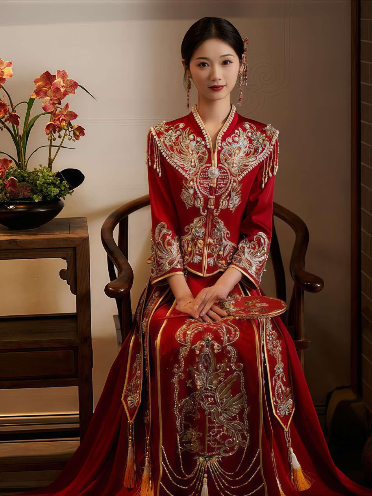 This elegant red two-piece set is a modern interpretation of the classic Chinese Qun Kwa wedding dress. Adorned with phoenix and floral embroidery and decorative tassel details, it represents eternal love, fortune, and family balance.