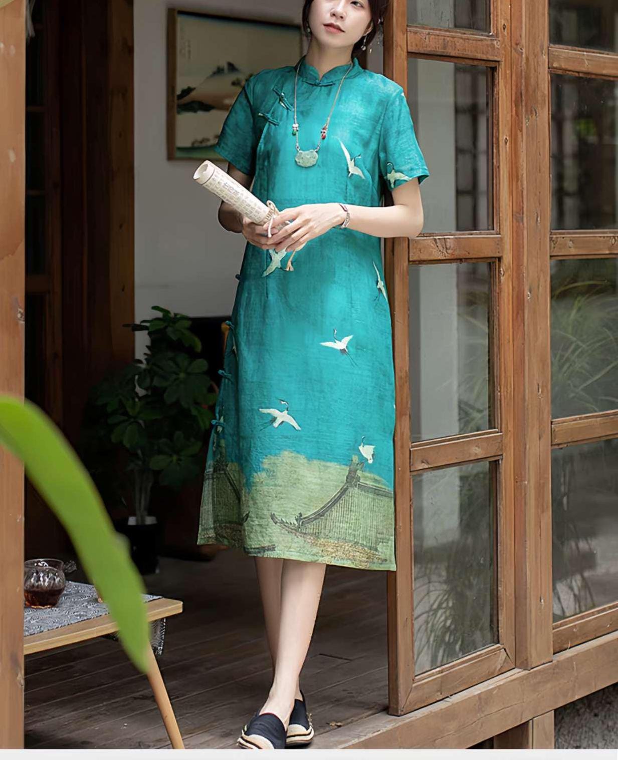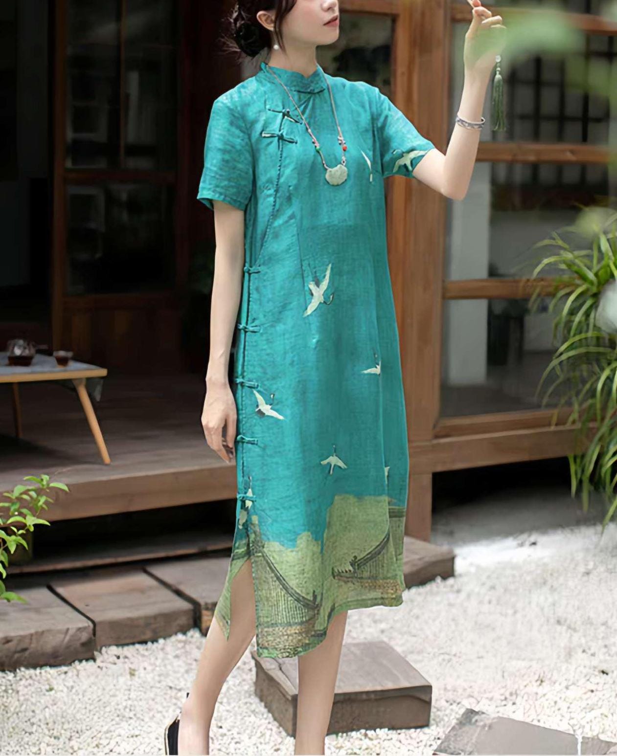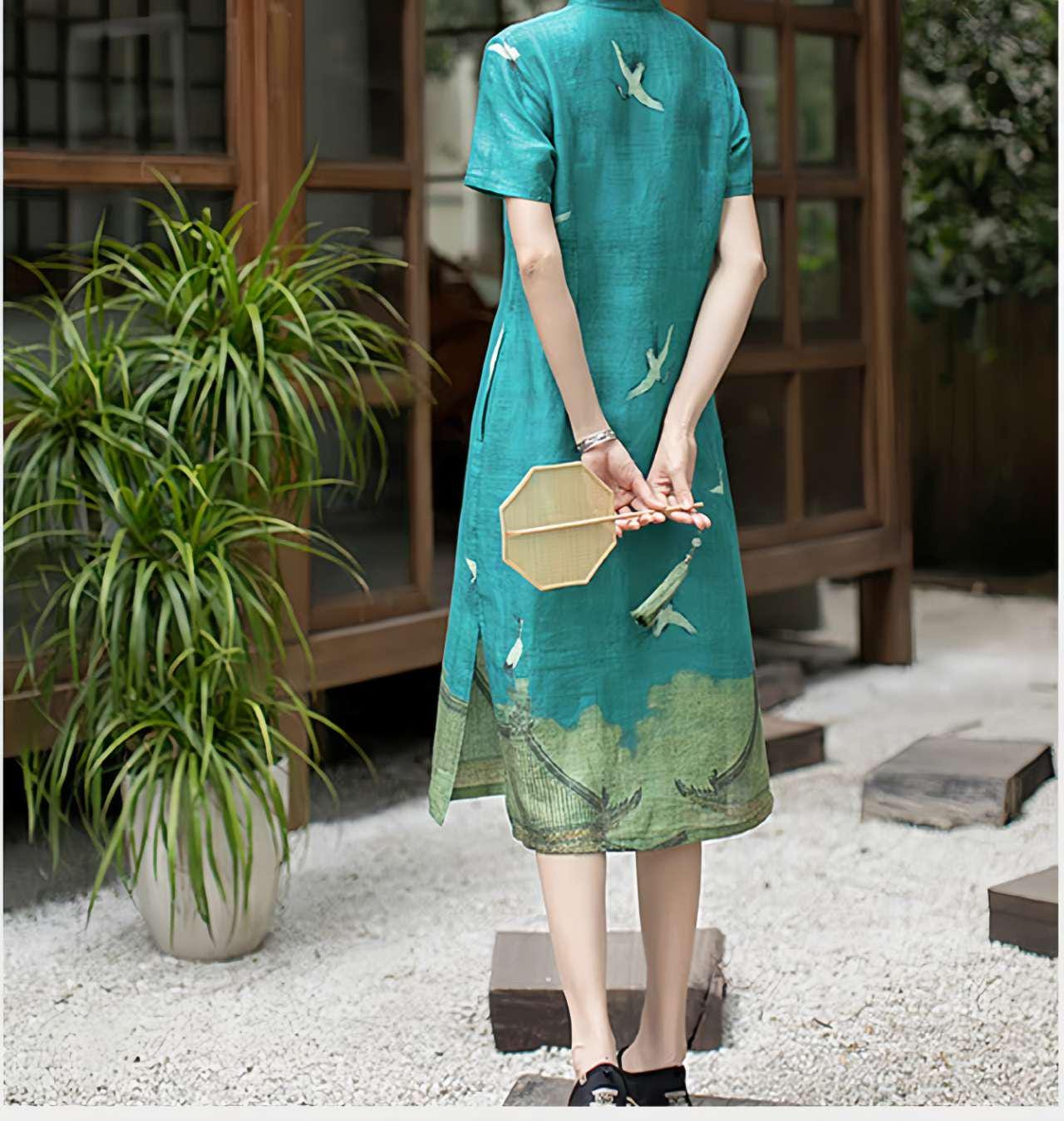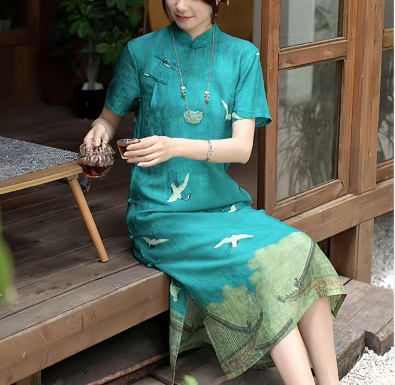 Chinese Linen Hanfu Dress, Zen Style Long Dress, Elegant Linen Crane Dress, Oriental Bohemian Dress, Gift for Mother,