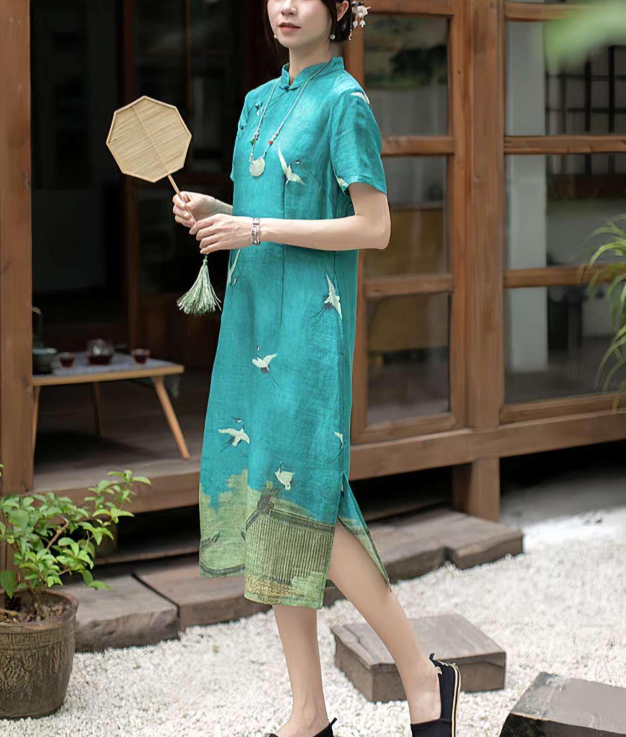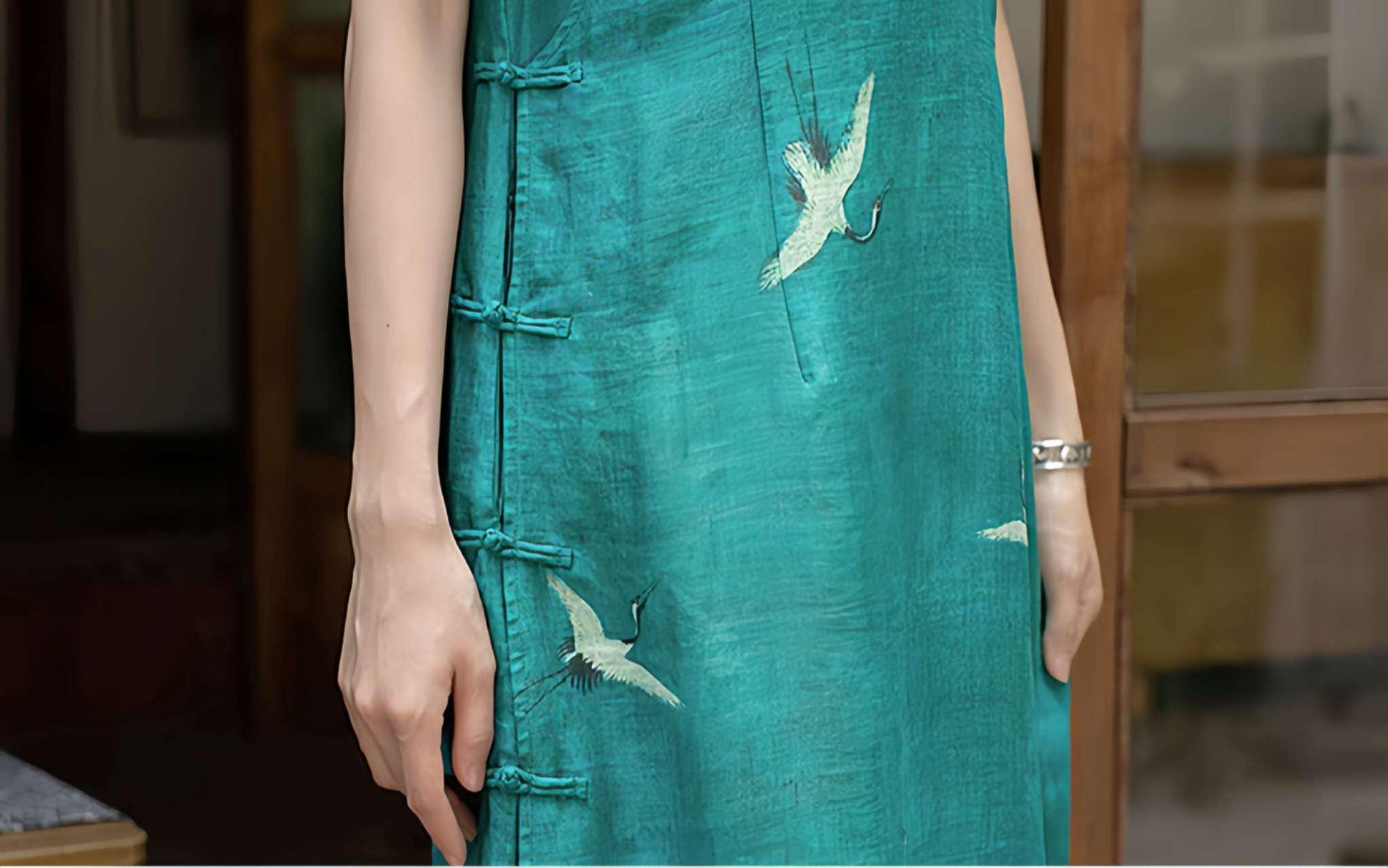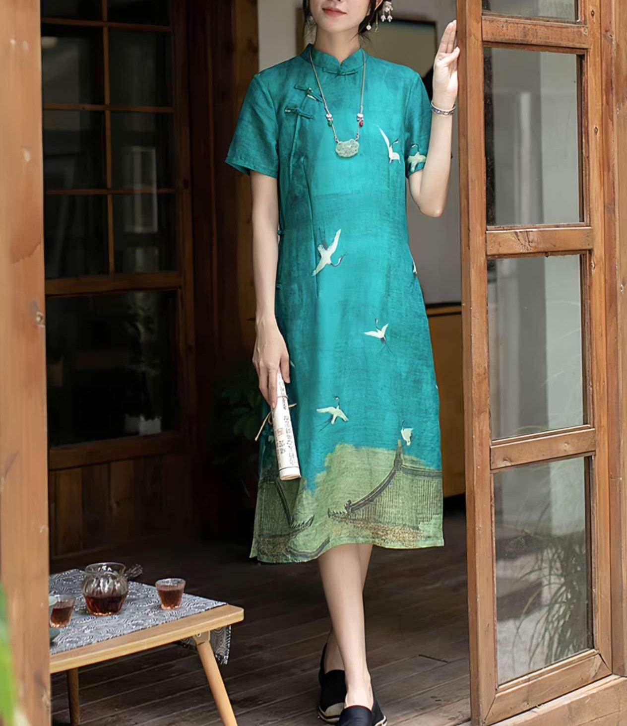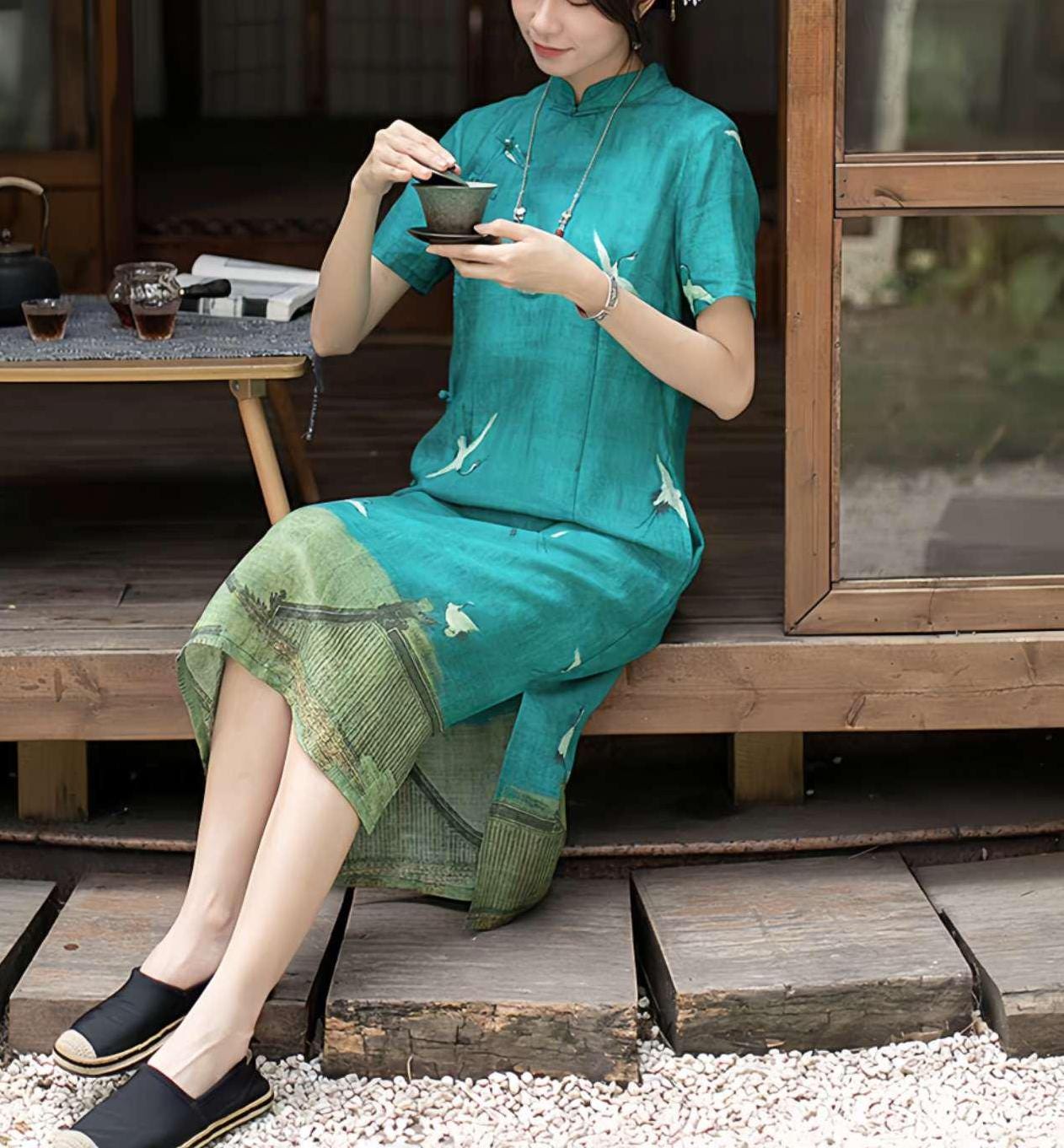 Chinese Linen Hanfu Dress, Zen Style Long Dress, Elegant Linen Crane Dress, Oriental Bohemian Dress, Gift for Mother,