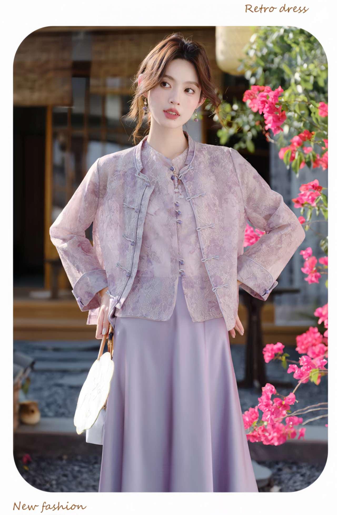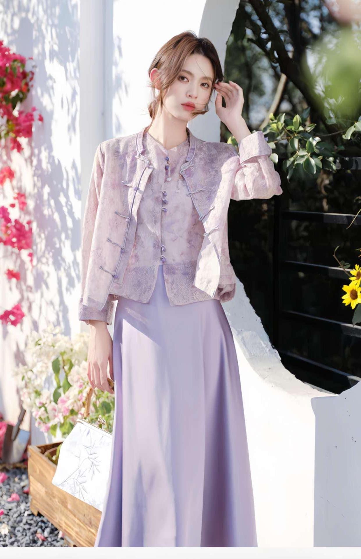 Elegance and serenity: This three-piece lavender chino set offers a charming blend of tradition and contemporary style. It includes a mandarin collar jacket with Chinese buttons (54 cm), a sleeveless vest (53 cm), and a full knee-length skirt (80 cm), all in soft, breathable fabrics.
