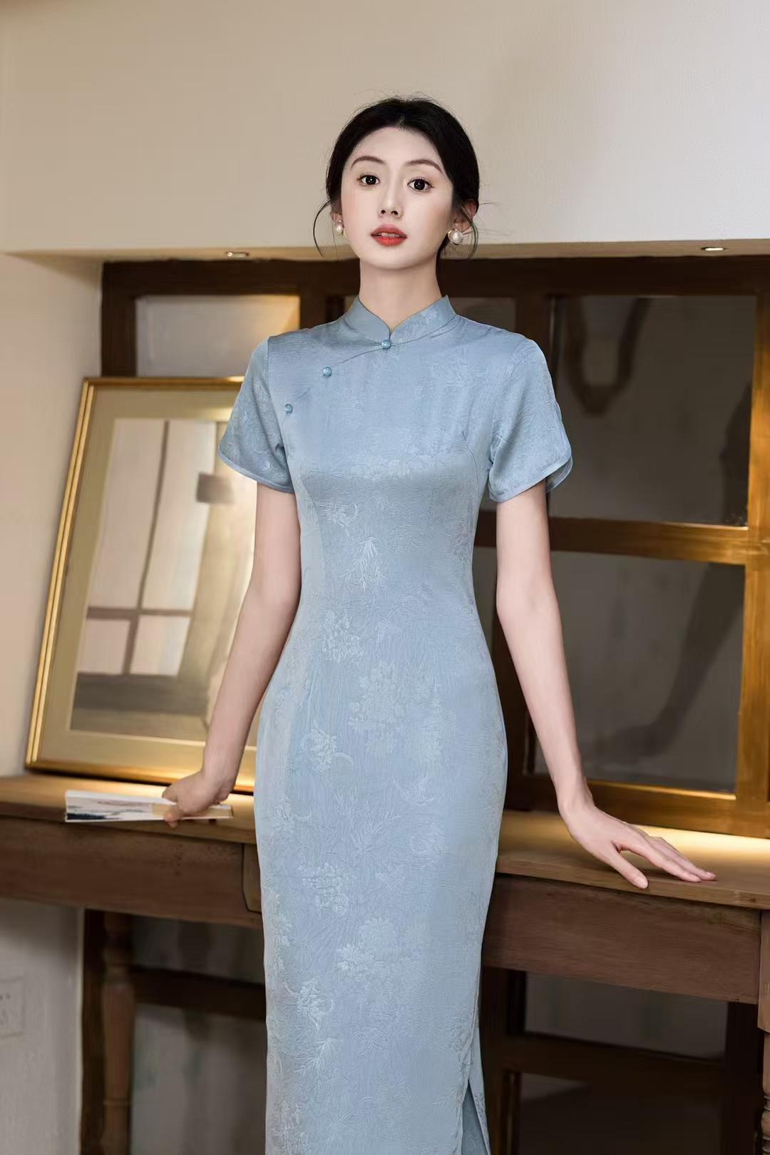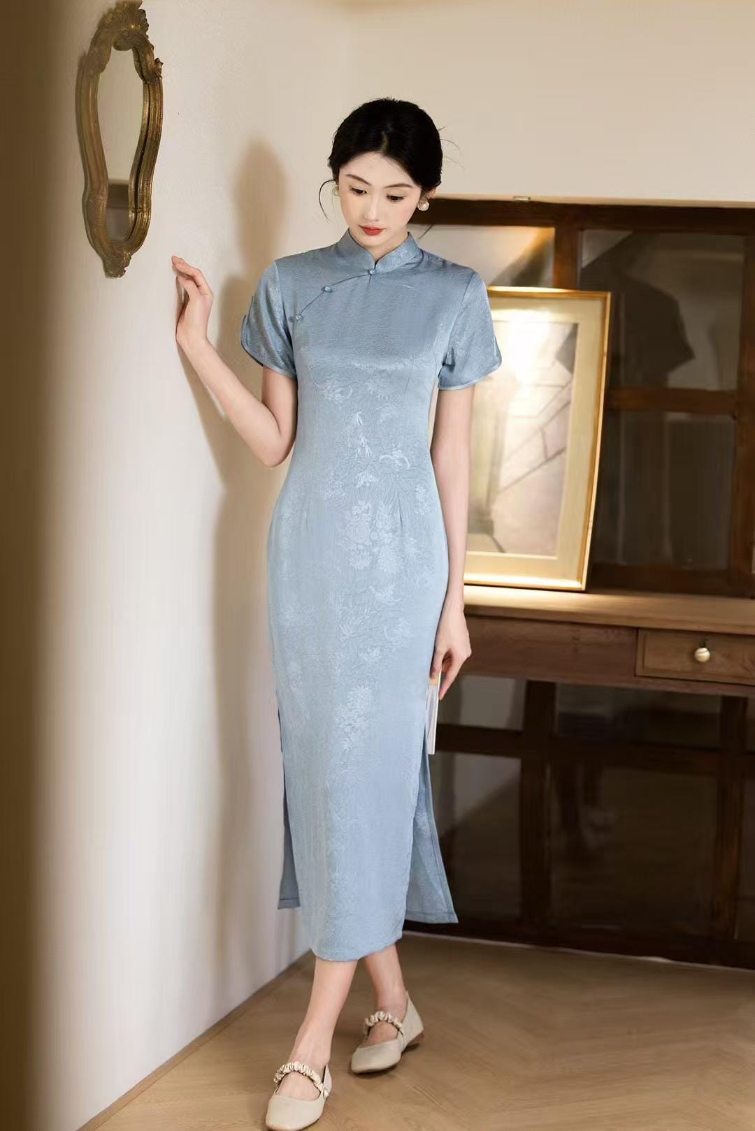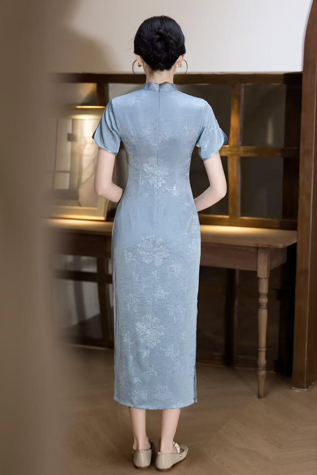 Discover timeless grace with this blue brocade silk qipao, crafted from a high-quality jacquard fabric with delicate embossed floral patterns. Its mandarin collar, short sleeves, and slim fit enhance feminine elegance without sacrificing comfort. The below-the-knee midi length offers a sophisticated silhouette, ideal for spring and summer weddings, cocktail parties, cultural events, and formal gatherings.