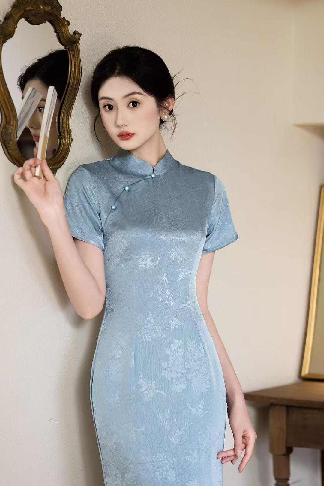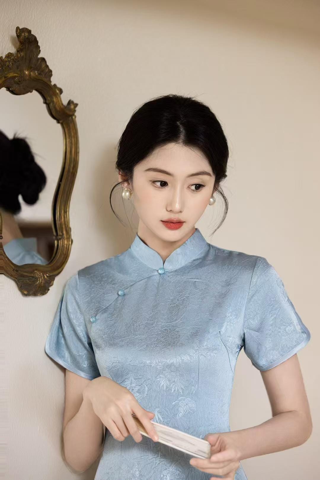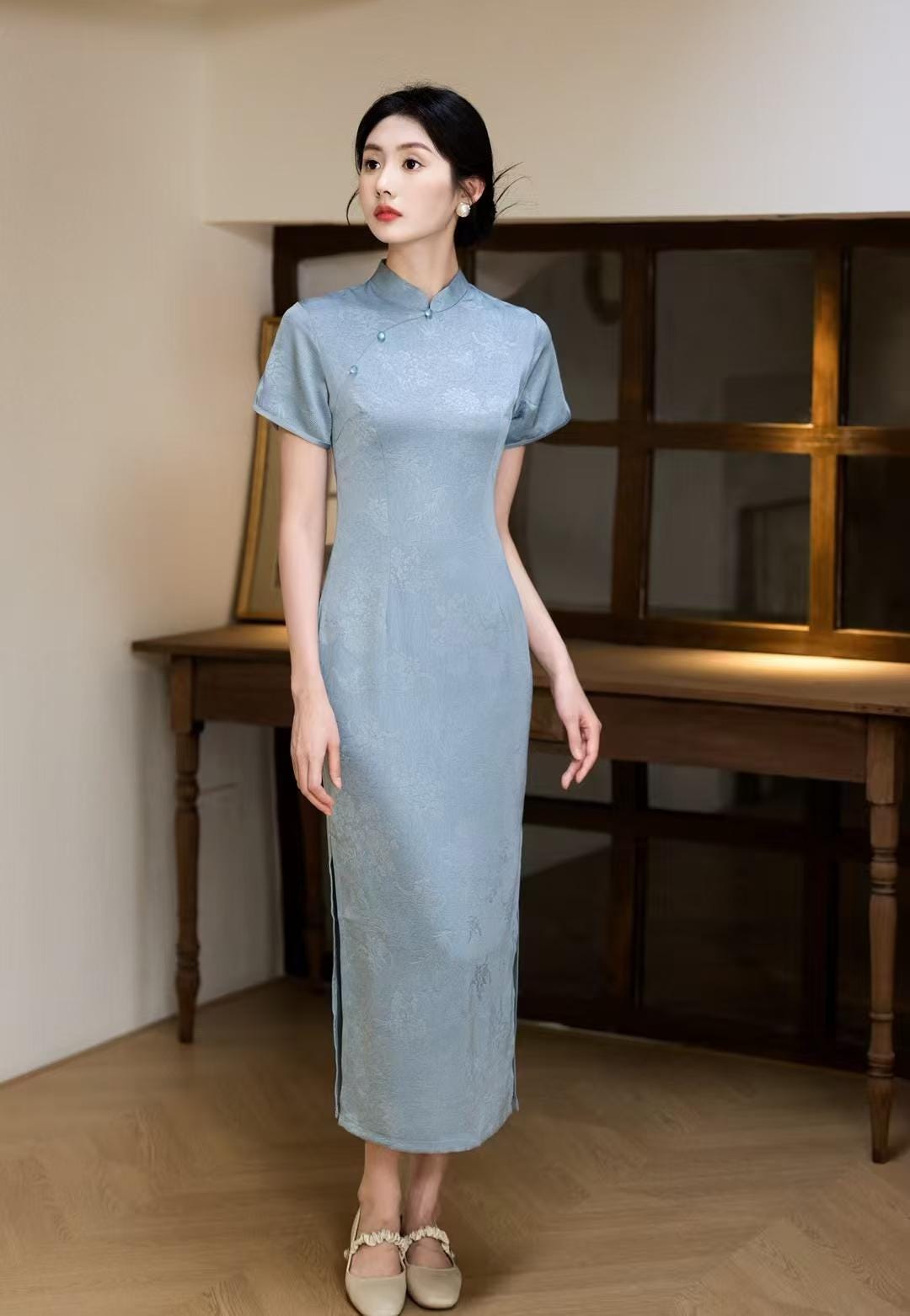 Discover timeless grace with this blue brocade silk qipao, crafted from a high-quality jacquard fabric with delicate embossed floral patterns. Its mandarin collar, short sleeves, and slim fit enhance feminine elegance without sacrificing comfort. The below-the-knee midi length offers a sophisticated silhouette, ideal for spring and summer weddings, cocktail parties, cultural events, and formal gatherings.