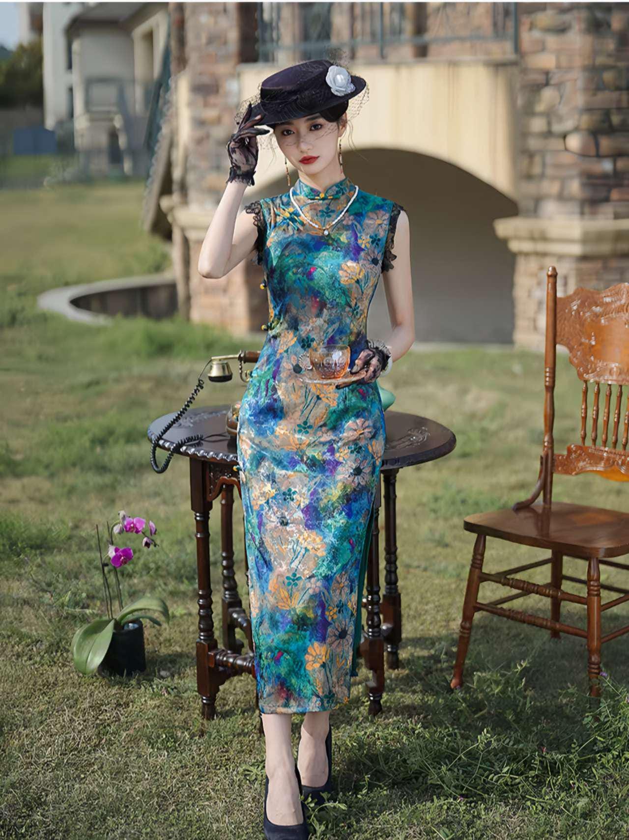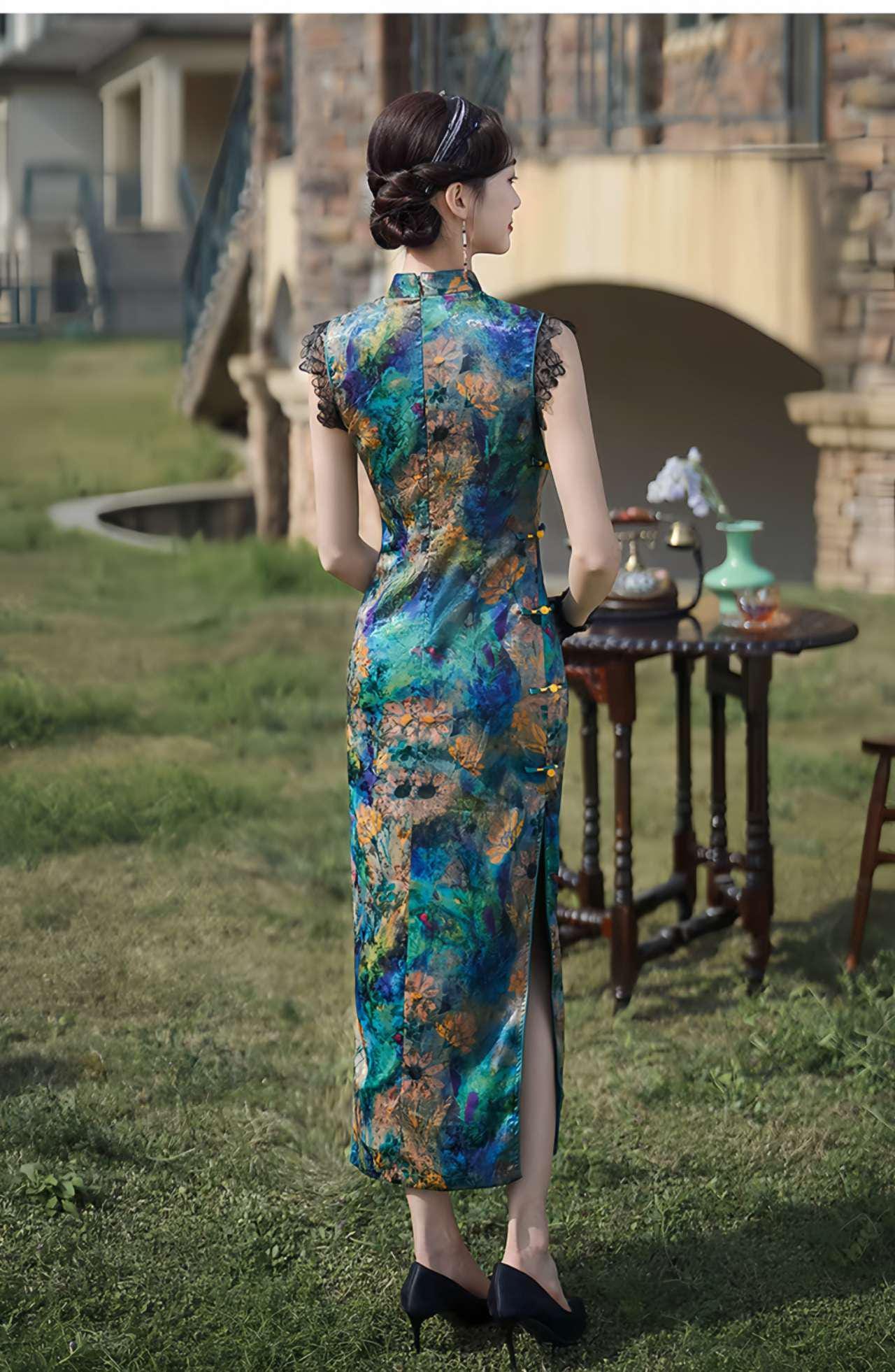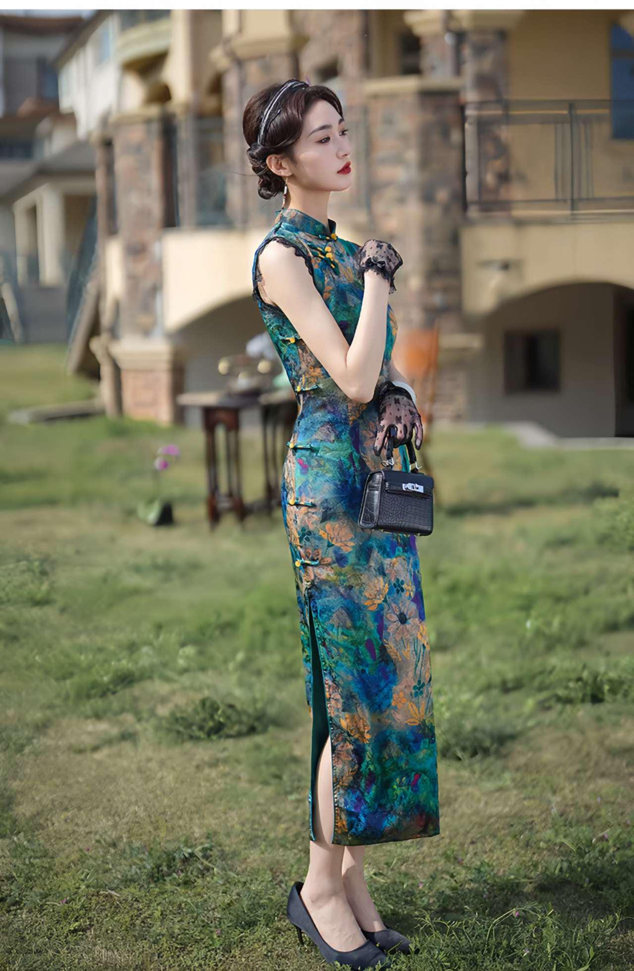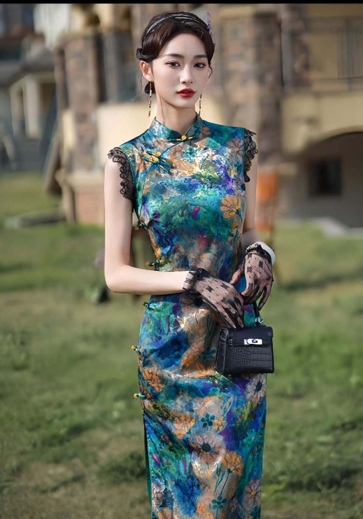 Discover timeless elegance with this exquisite vintage Chinese qipao. Crafted from luxurious satin fabric with an artistic print, this long dress enhances the silhouette with its fitted cut and traditional details, such as the Mandarin collar and Chinese knot closures. Perfect for weddings, parties, cultural events, or simply to stand out with sophisticated style.