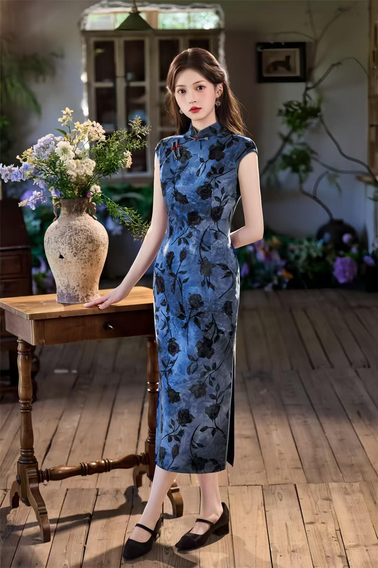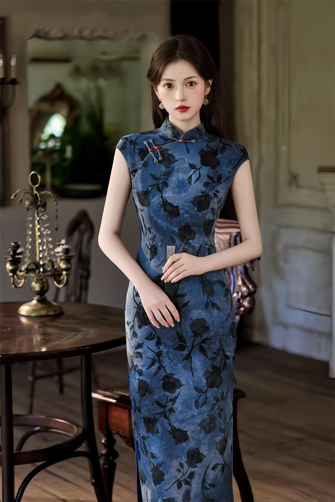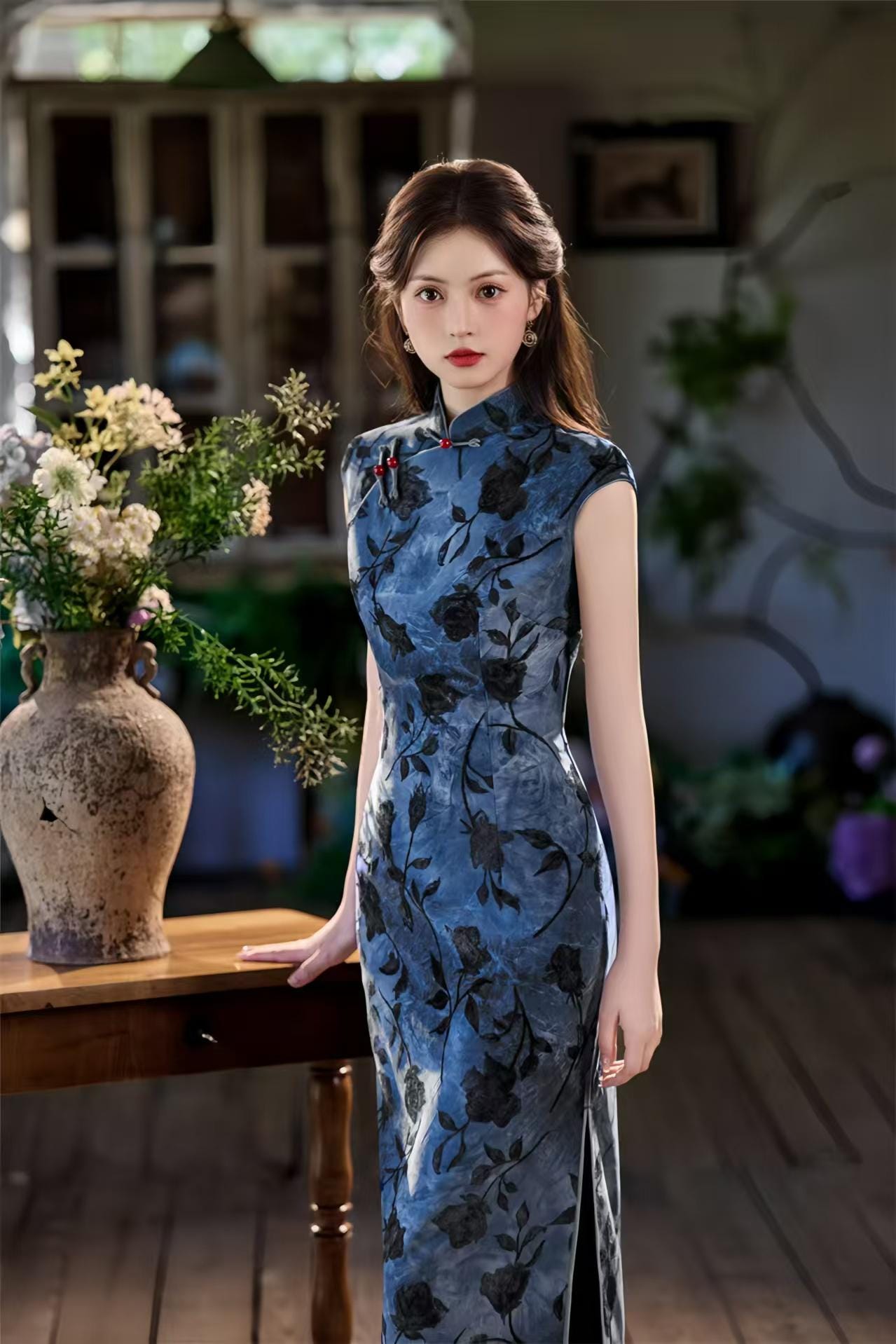 Add a touch of timeless elegance to your wardrobe with this vintage-style maxi-length qipao (cheongsam) dress, crafted from a tie-dye composite fabric and decorated with delicate floral motifs. A garment that combines oriental sophistication with a contemporary artistic touch.