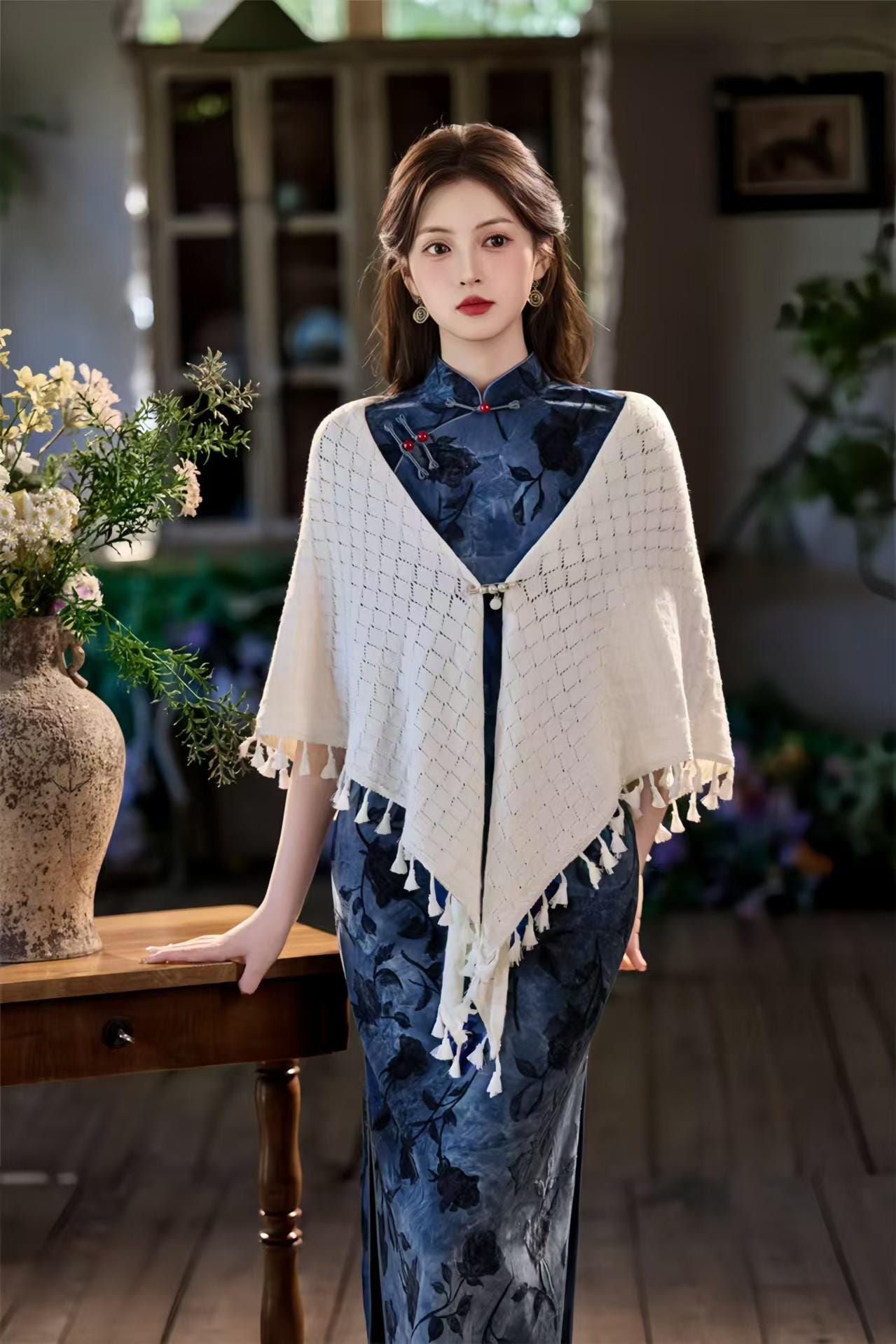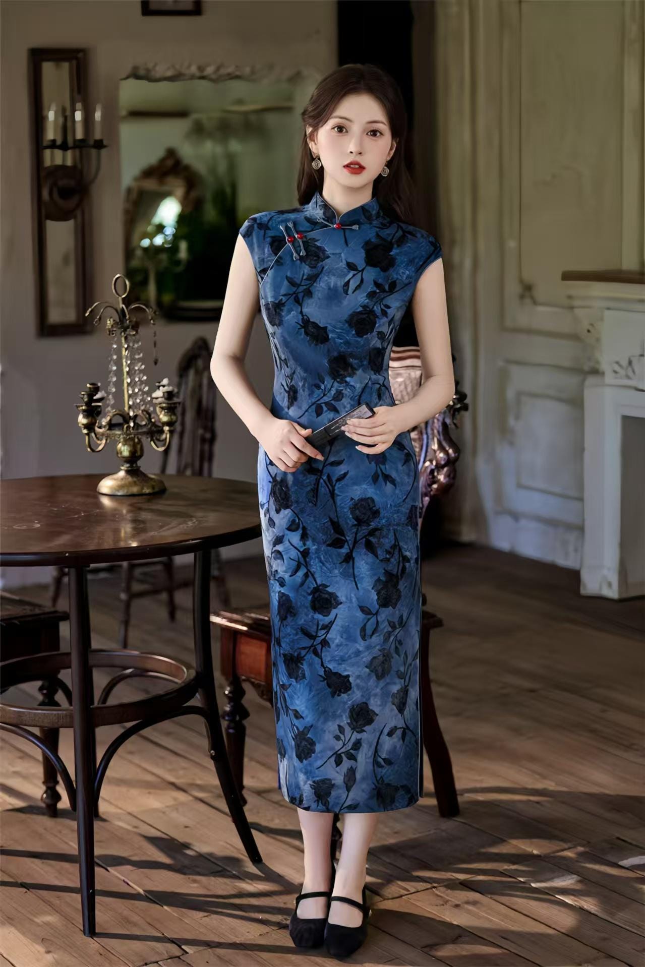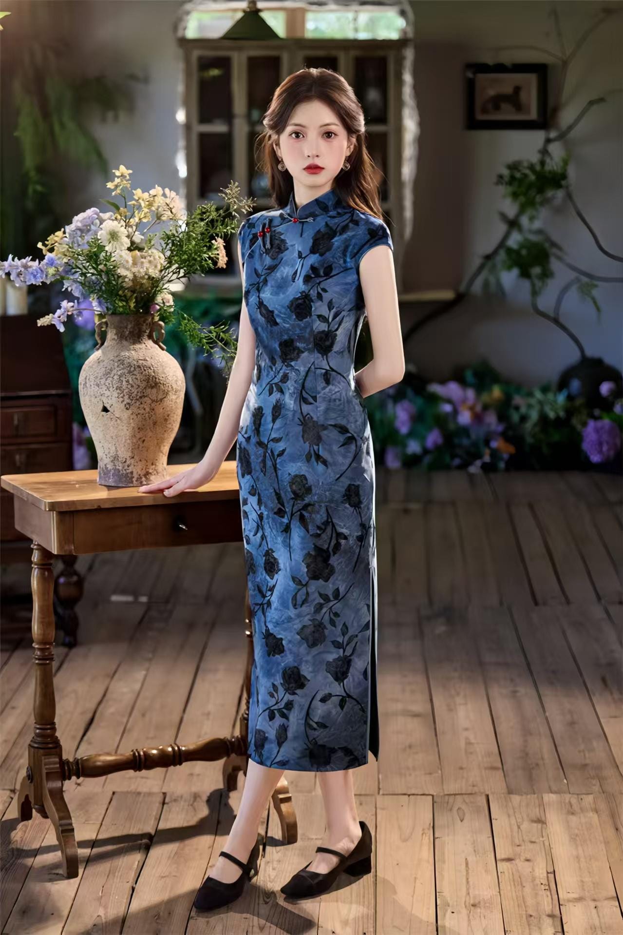 Add a touch of timeless elegance to your wardrobe with this vintage-style maxi-length qipao (cheongsam) dress, crafted from a tie-dye composite fabric and decorated with delicate floral motifs. A garment that combines oriental sophistication with a contemporary artistic touch.