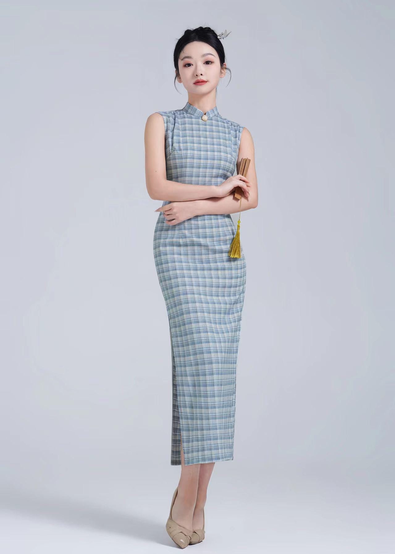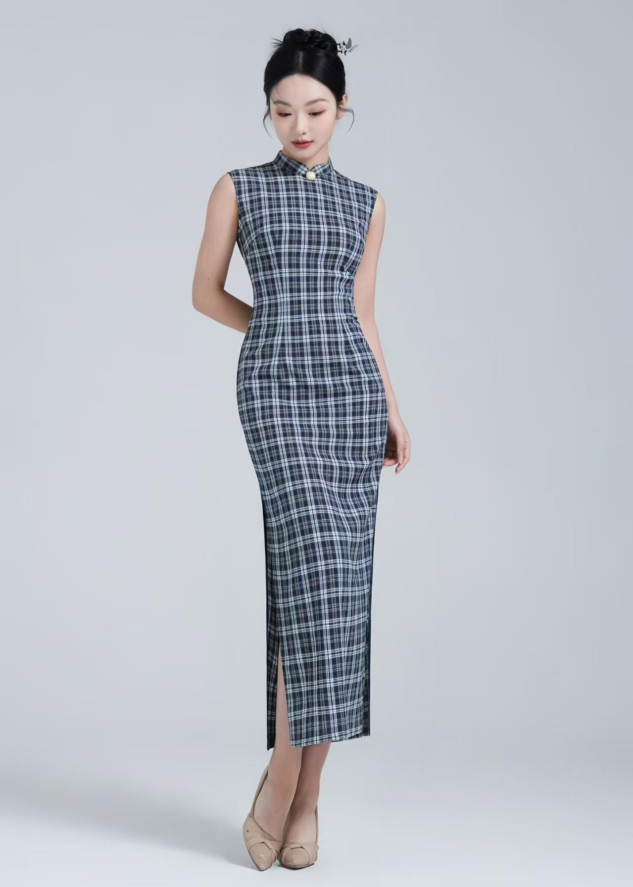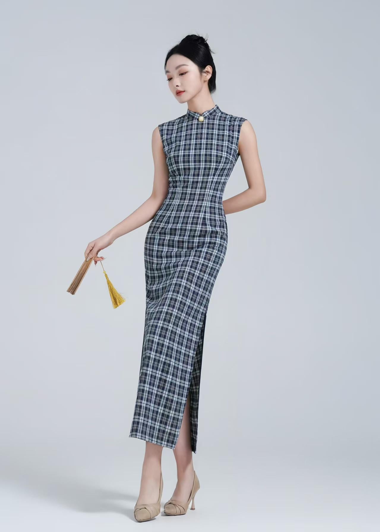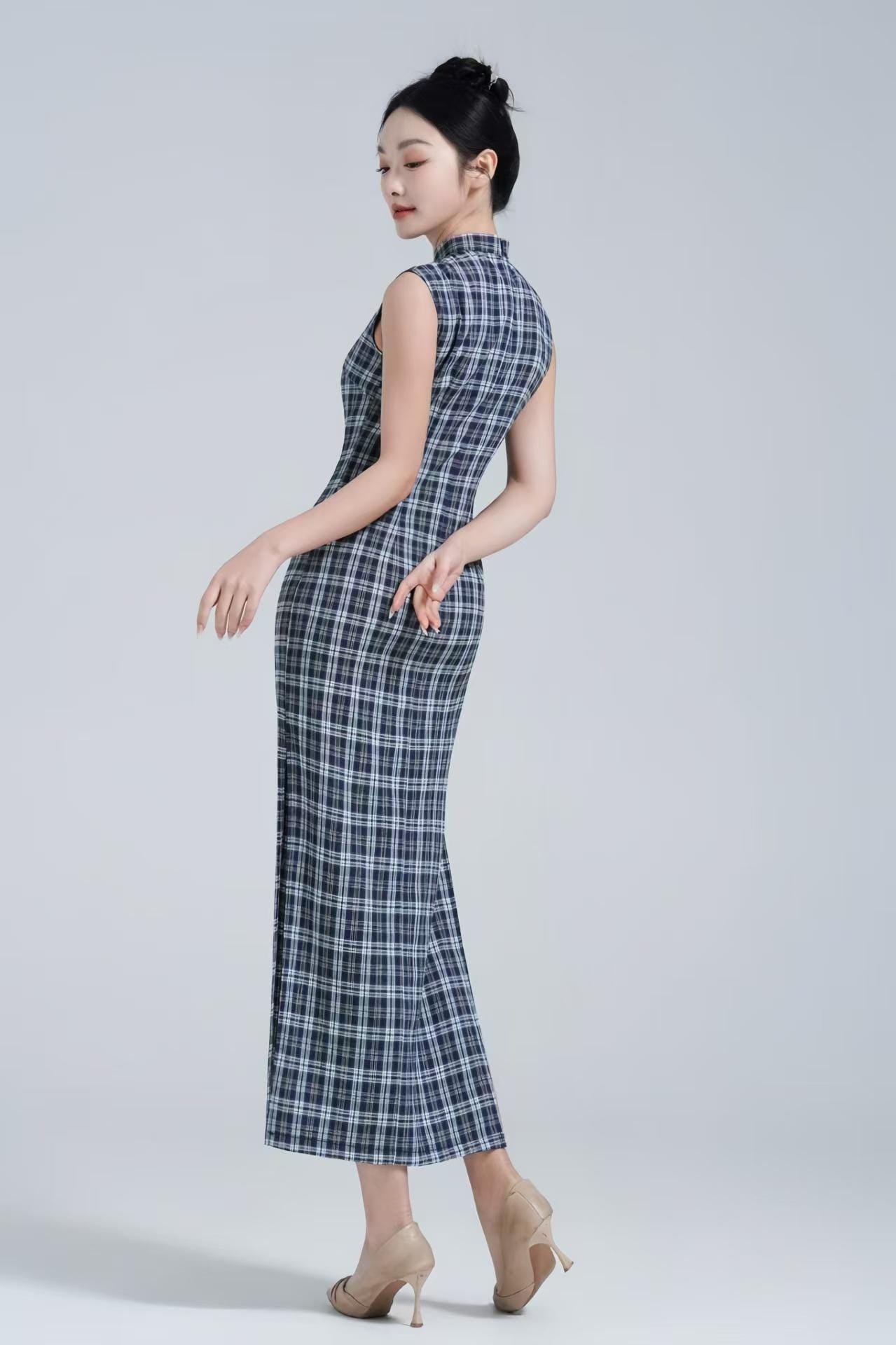 This striped and checked qipao (cheongsam) dress is crafted from breathable bamboo cotton, combining traditional Chinese elegance with modern comfort. Featuring a high Mandarin collar, a sleeveless design, and a long, fitted silhouette (approx. 125 cm, below the knee), it offers a versatile and elegant style. The classic side slit adds movement, making it both stylish and practical for everyday wear. Perfect for cultural events, casual gatherings, summer parties, or as a statement piece. Its lightweight cotton fabric makes it ideal for spring and summer.