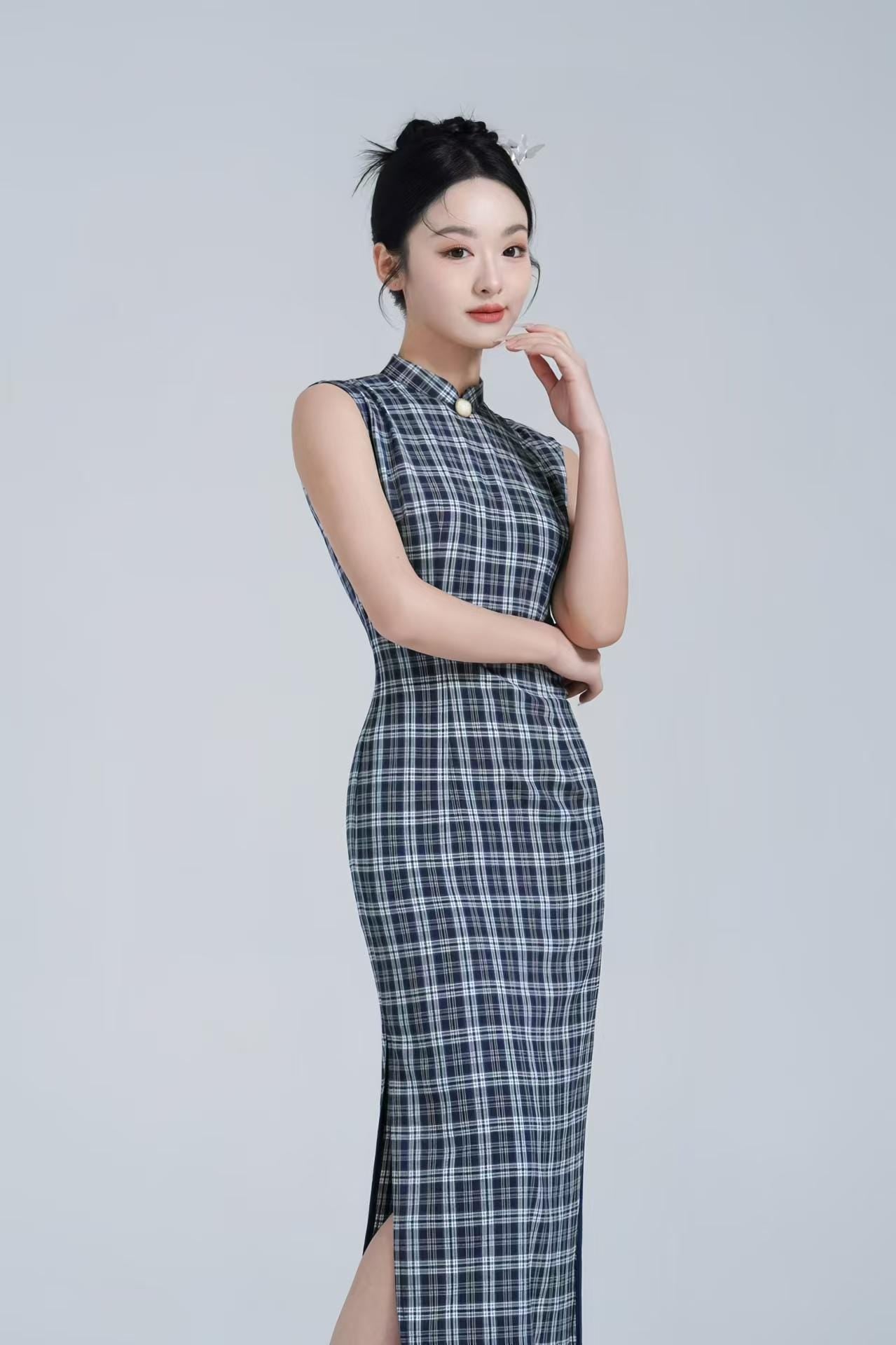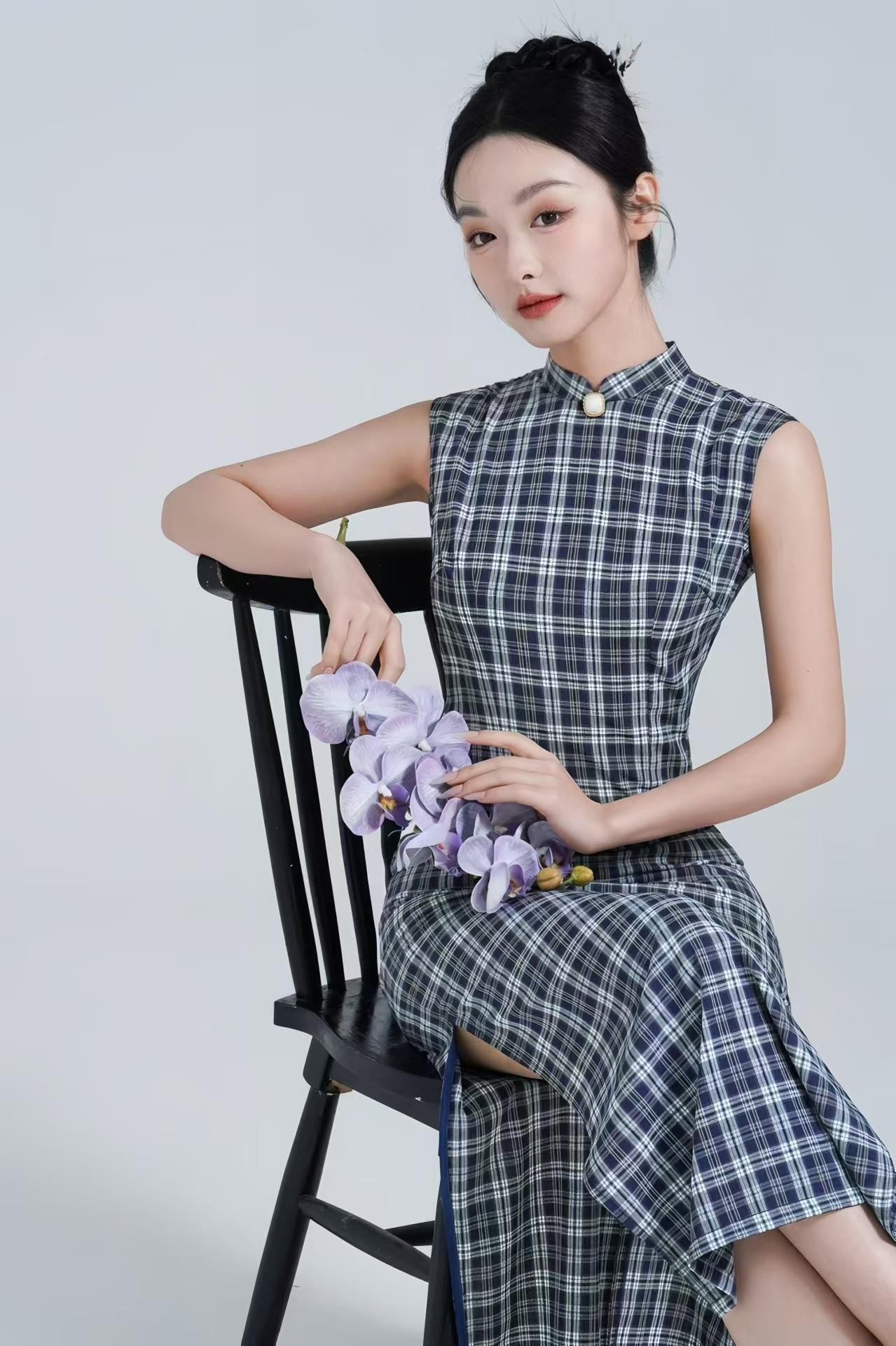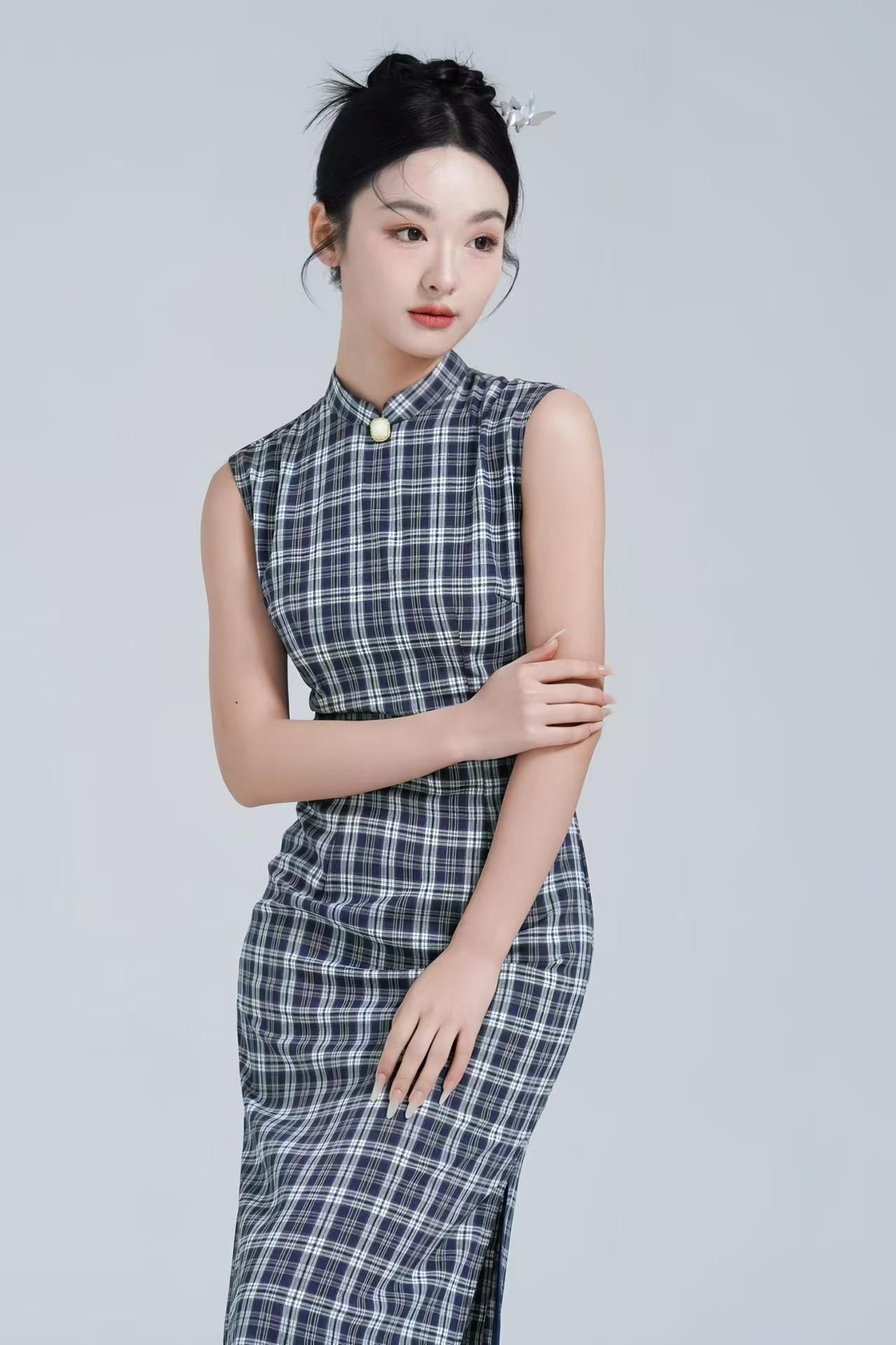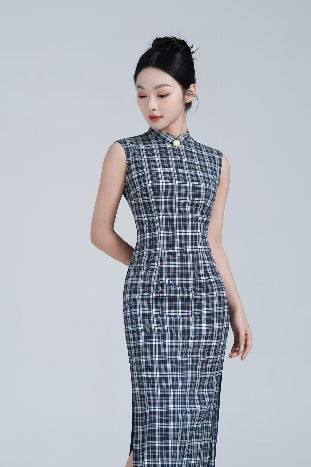 This striped and checked qipao (cheongsam) dress is crafted from breathable bamboo cotton, combining traditional Chinese elegance with modern comfort. Featuring a high Mandarin collar, a sleeveless design, and a long, fitted silhouette (approx. 125 cm, below the knee), it offers a versatile and elegant style. The classic side slit adds movement, making it both stylish and practical for everyday wear. Perfect for cultural events, casual gatherings, summer parties, or as a statement piece. Its lightweight cotton fabric makes it ideal for spring and summer.