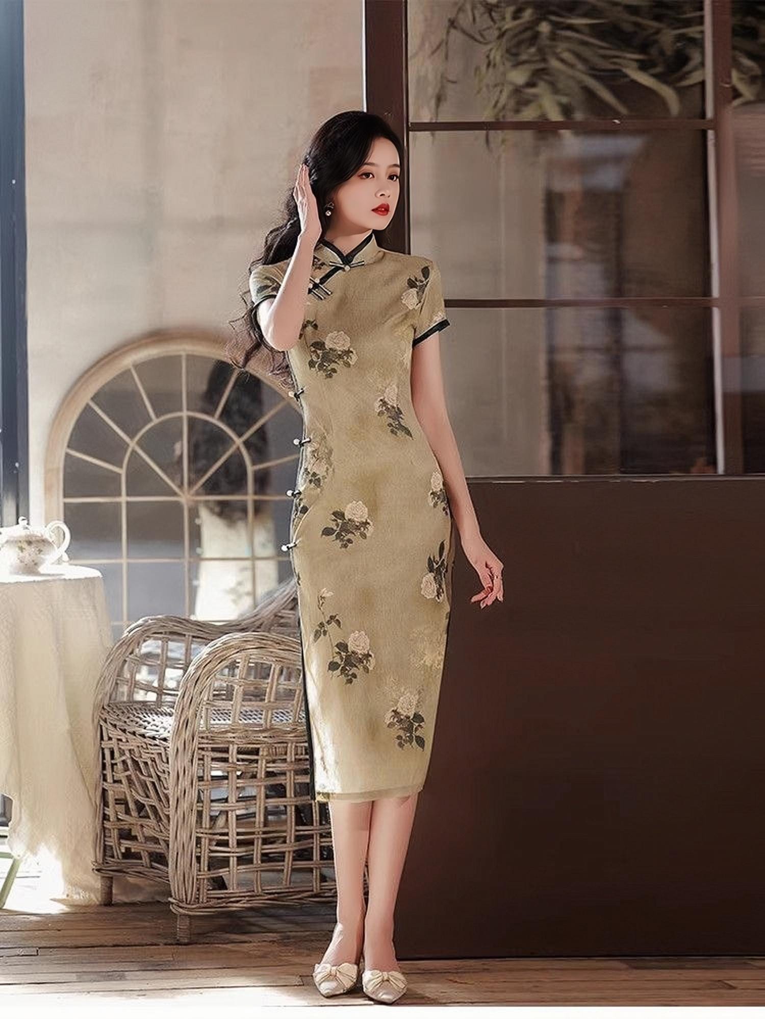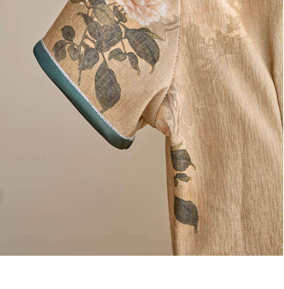 This vintage Chinese qipao is crafted from soft ramie linen, ideal for those who value timeless elegance and natural comfort. The light green background is decorated with delicate flowers, evoking a serene, botanical charm.