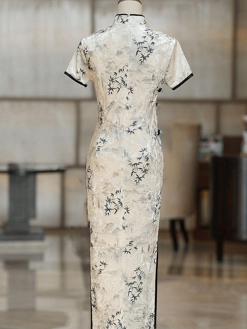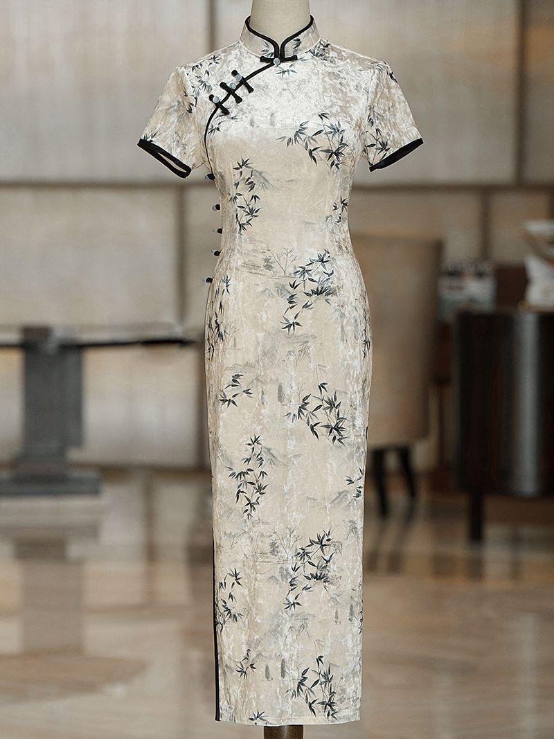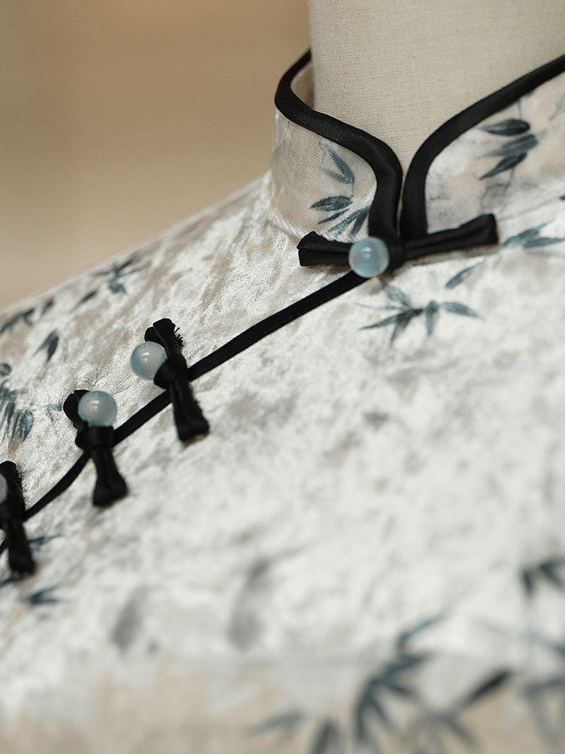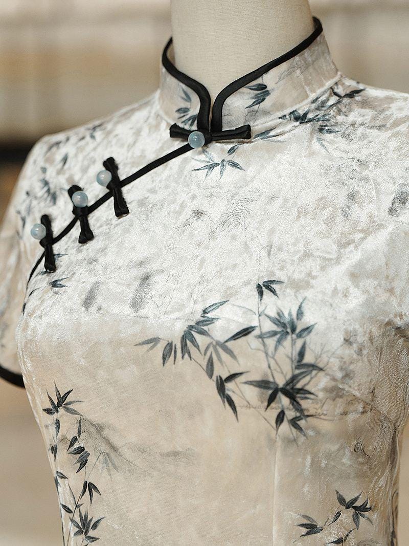 Discover timeless elegance with this bamboo-print velvet qipao dress. Crafted from soft and luxurious velvet, this dress features a fitted design with a high slit, short sleeves, and a classic Mandarin collar, combining vintage charm with sophisticated style. The delicate bamboo embroidery reflects oriental beauty and symbolizes resilience and grace.