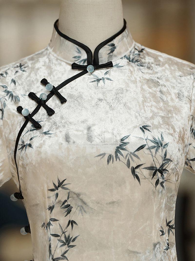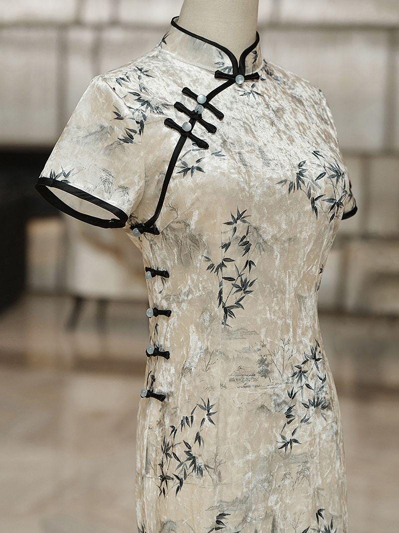 Bamboo Velvet Qipao Dress, Elegant Chinese Cheongsam, Traditional Oriental Dress, Short Sleeve, Gift for Girlfriend