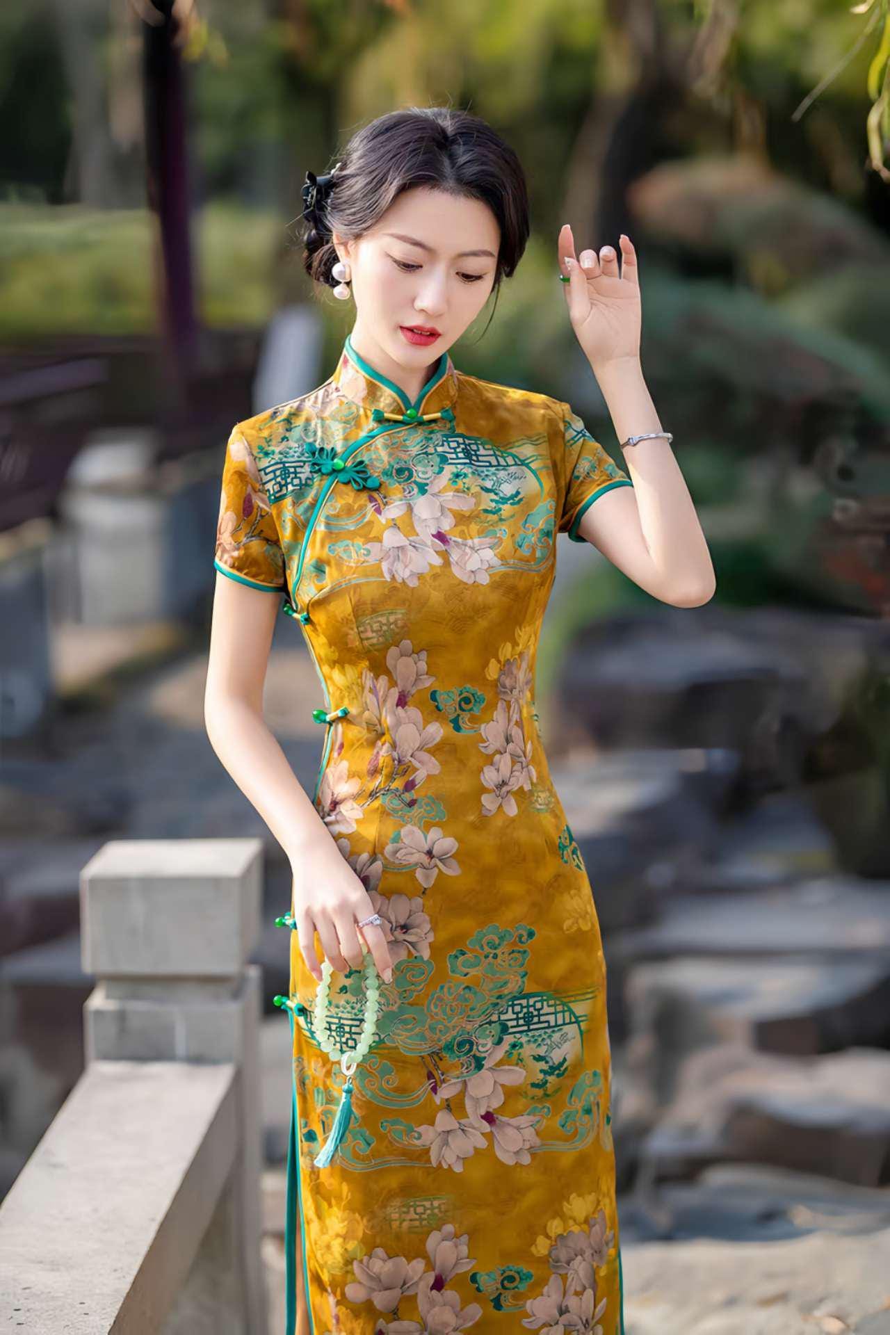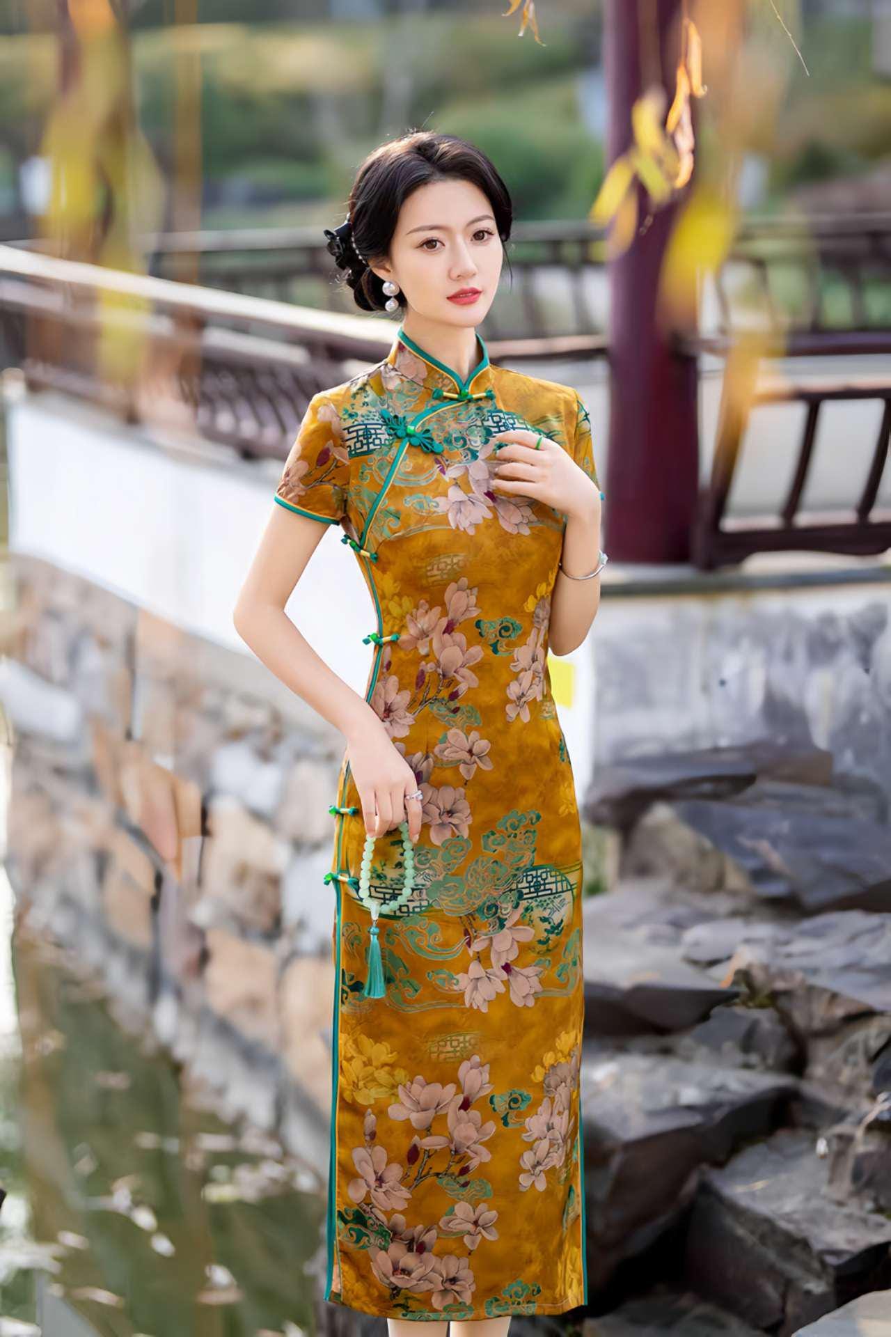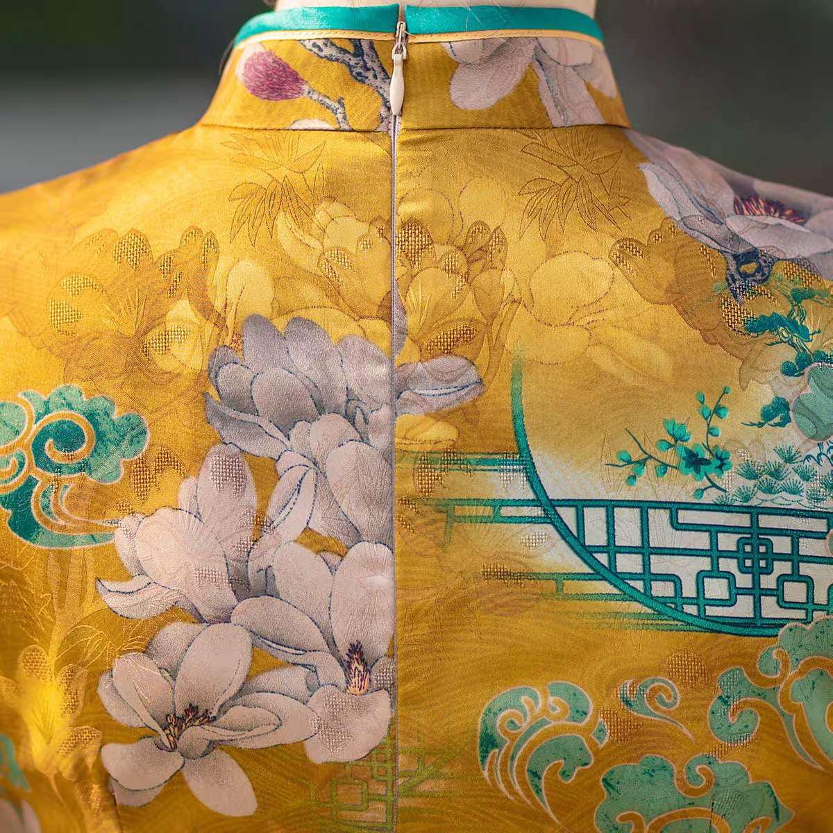 Immerse yourself in timeless elegance with this vintage gold qipao, crafted from luxurious Sujin brocade satin. Inspired by traditional Chinese aesthetics, this dress features an intricate design of magnolia blossoms and auspicious clouds, symbolizing purity, endurance, and good fortune.