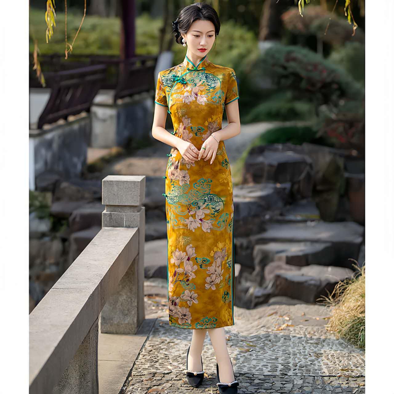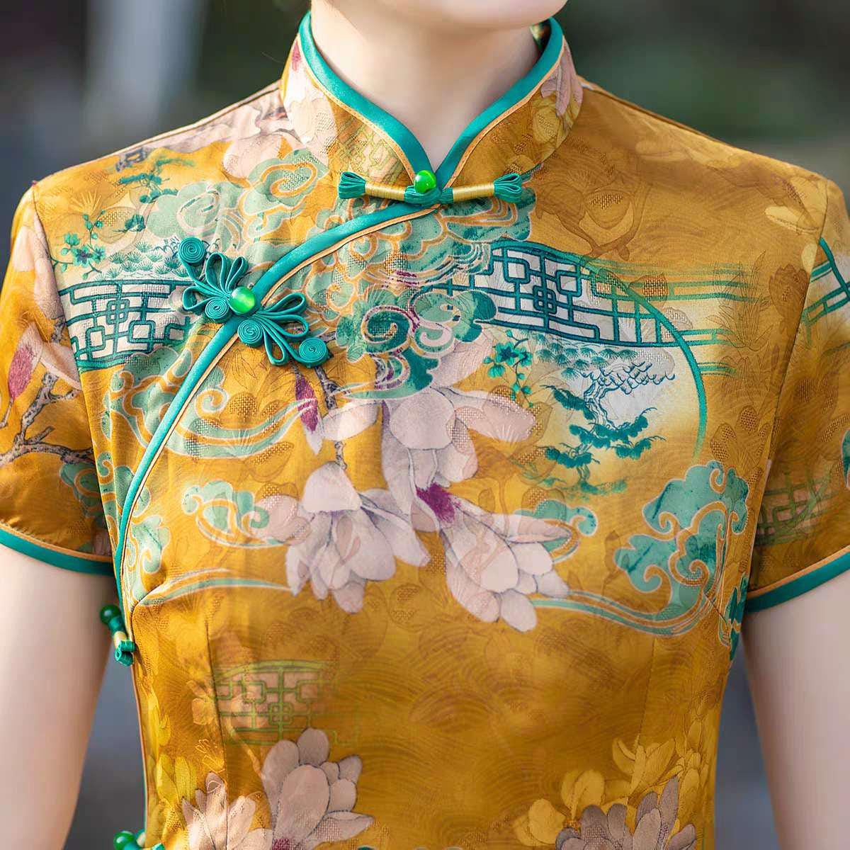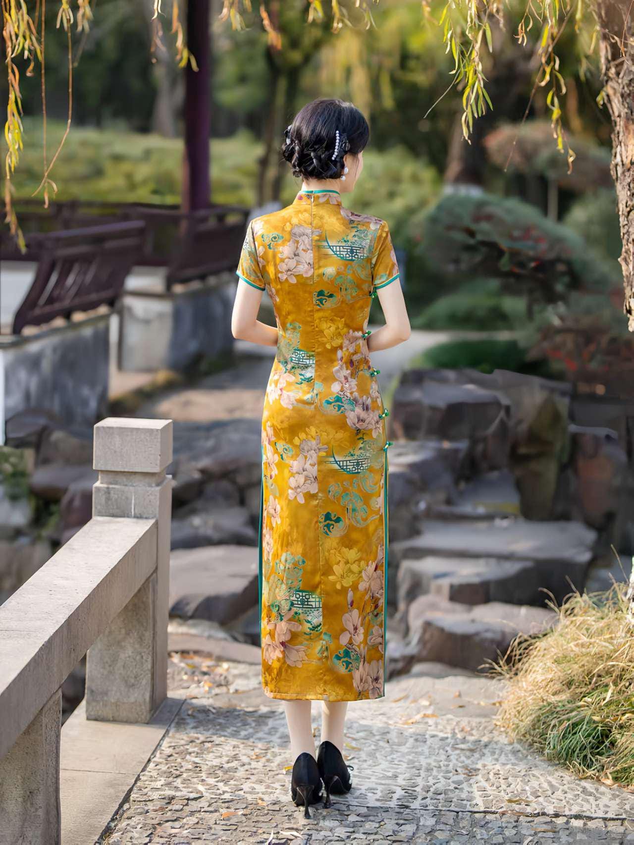 Immerse yourself in timeless elegance with this vintage gold qipao, crafted from luxurious Sujin brocade satin. Inspired by traditional Chinese aesthetics, this dress features an intricate design of magnolia blossoms and auspicious clouds, symbolizing purity, endurance, and good fortune.