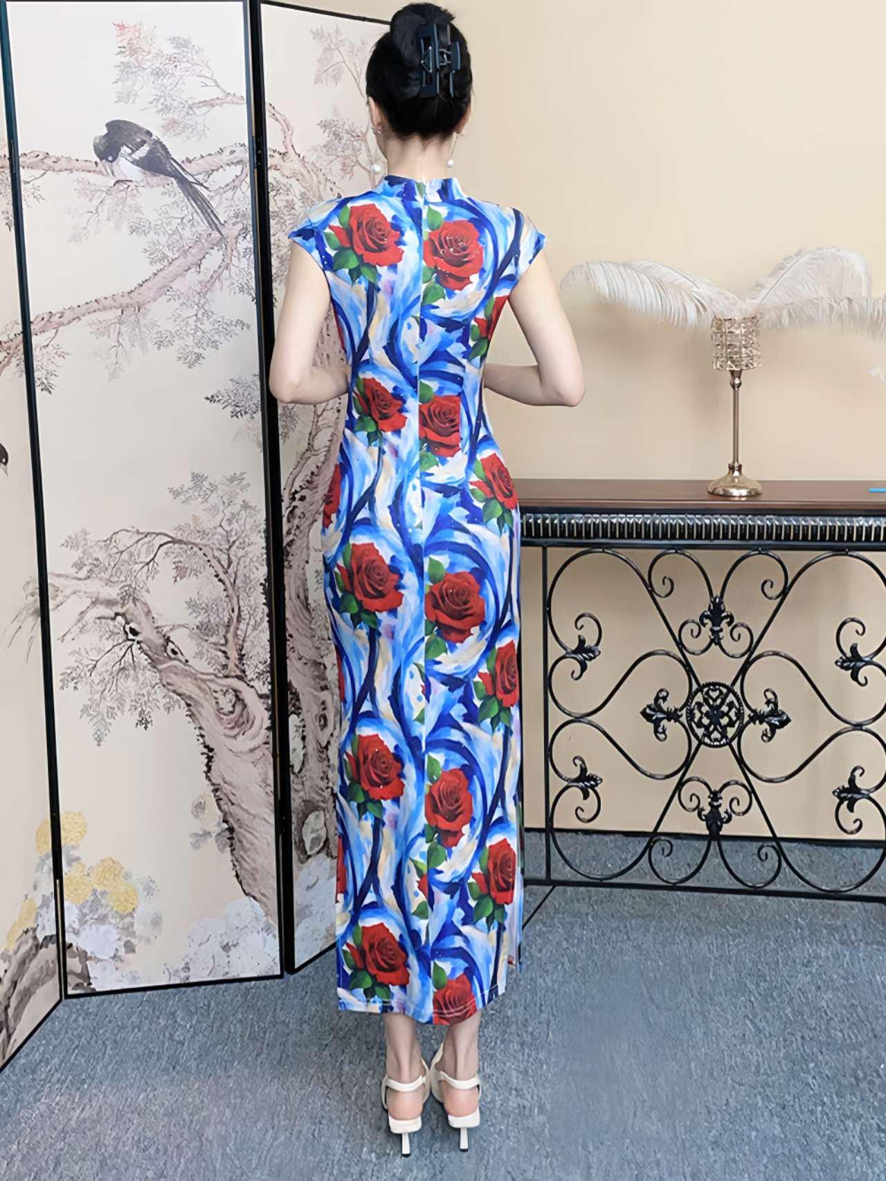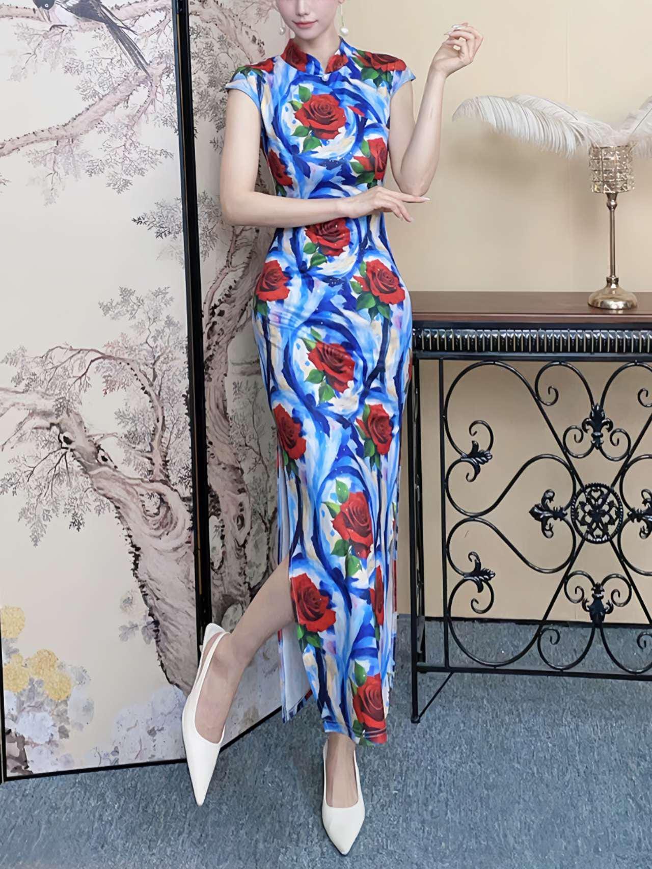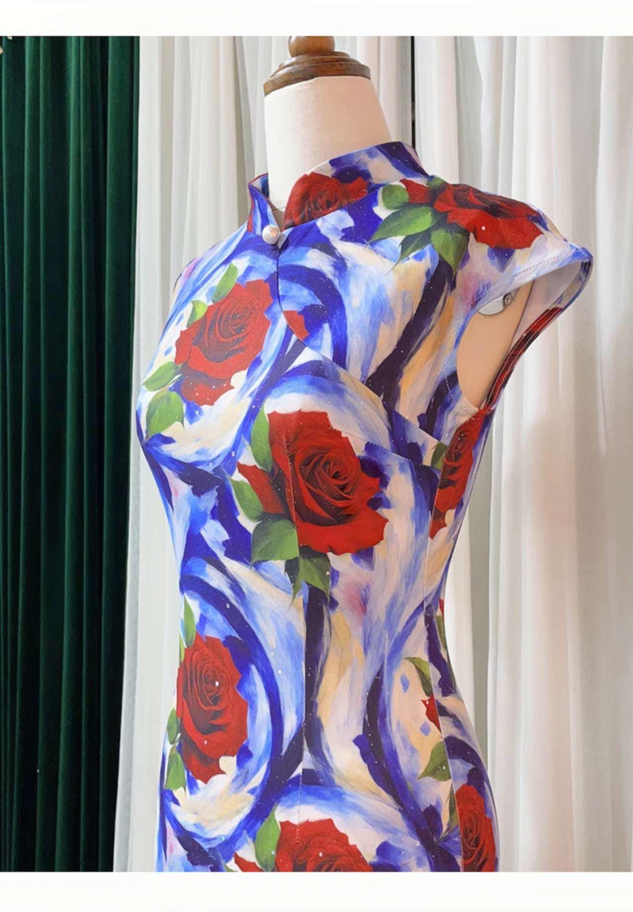 Stand out in this striking floral qipao, decorated with a bold abstract red rose design on a vibrant blue and white background. Crafted from a silhouette-enhancing stretch fabric, it combines traditional elegance with a contemporary aesthetic.