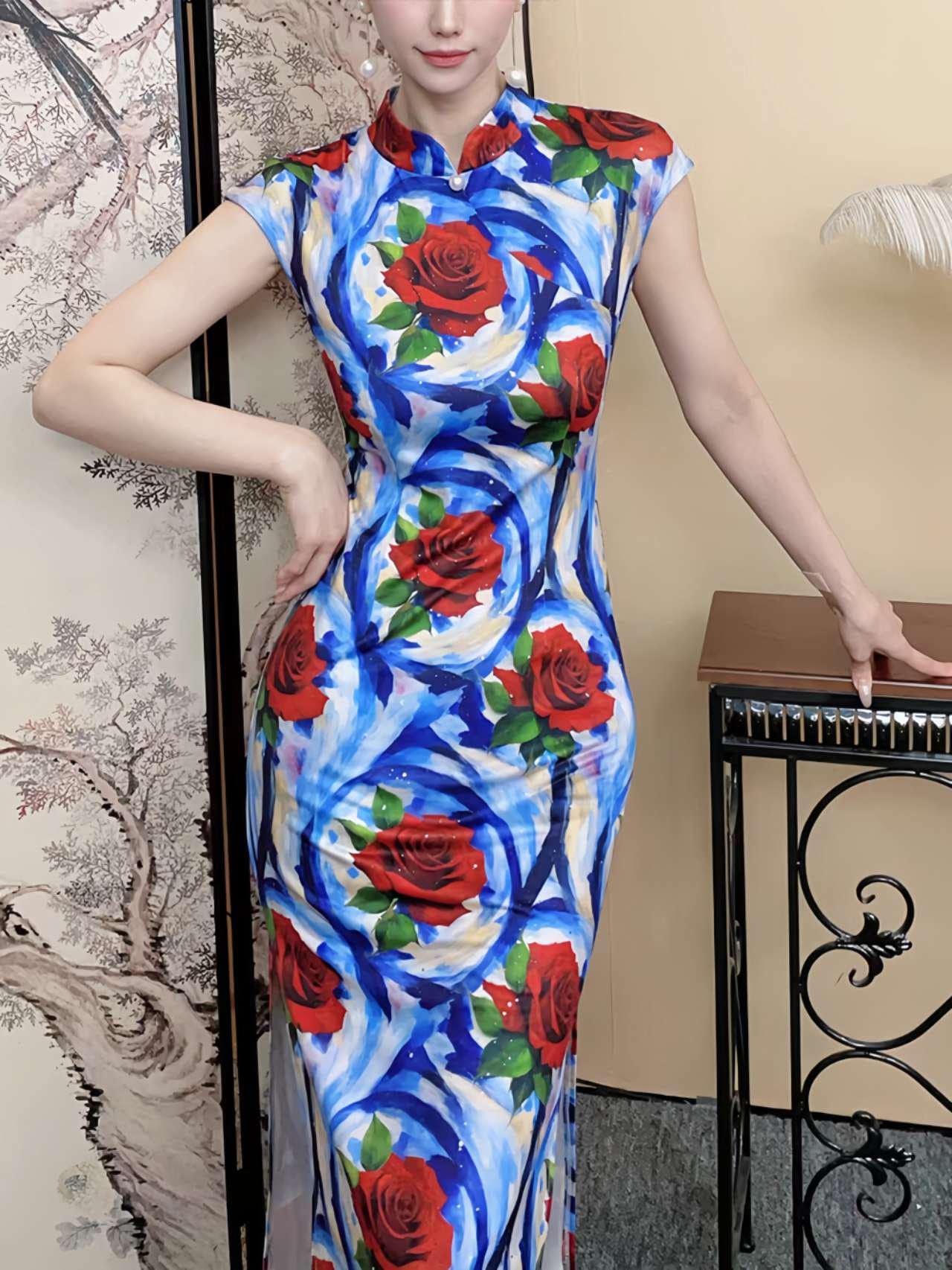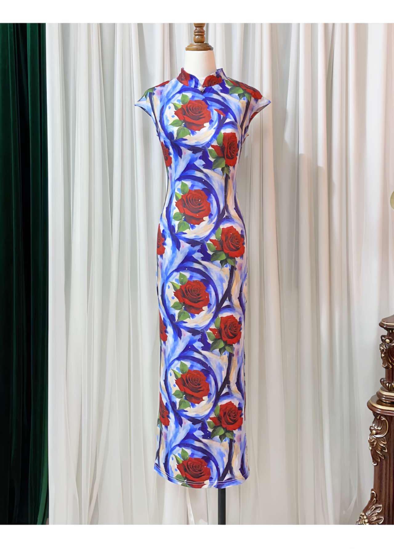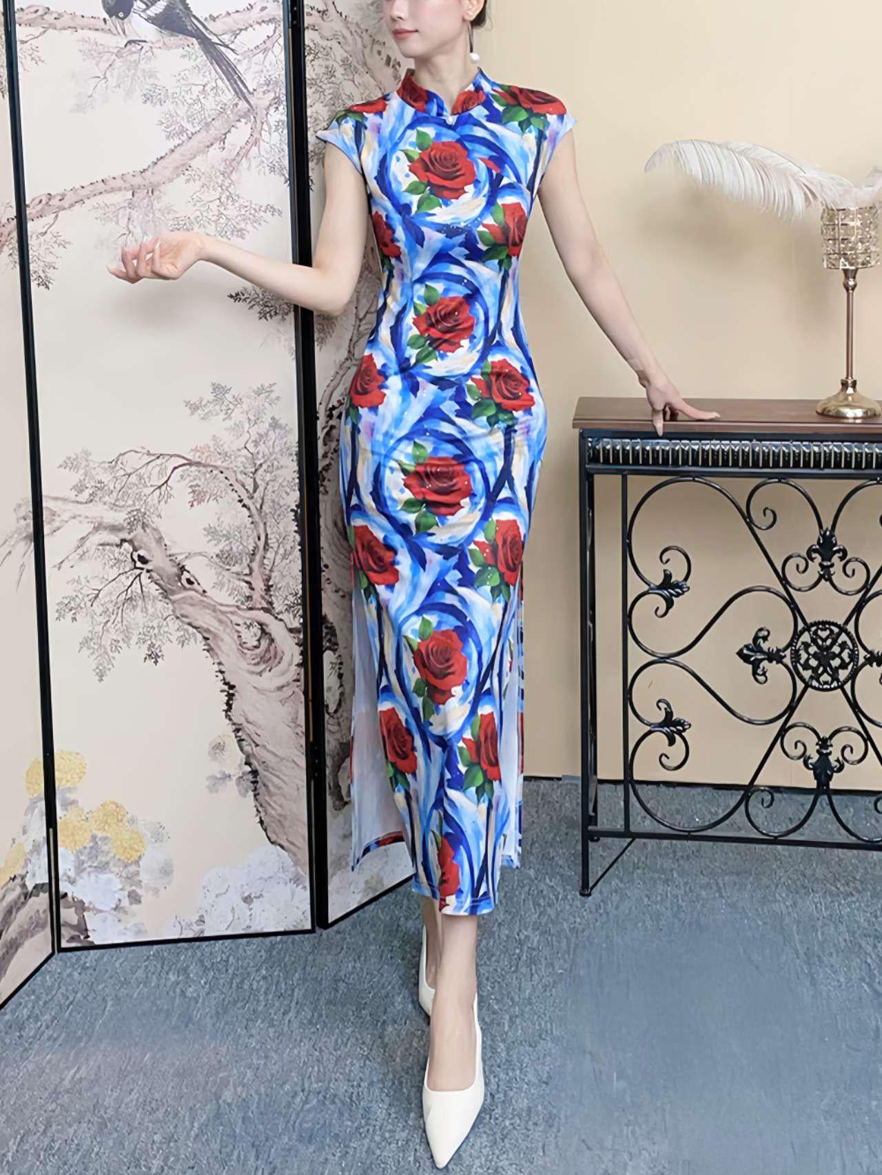 Stand out in this striking floral qipao, decorated with a bold abstract red rose design on a vibrant blue and white background. Crafted from a silhouette-enhancing stretch fabric, it combines traditional elegance with a contemporary aesthetic.