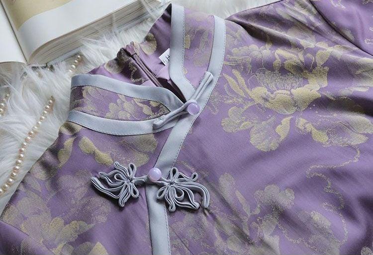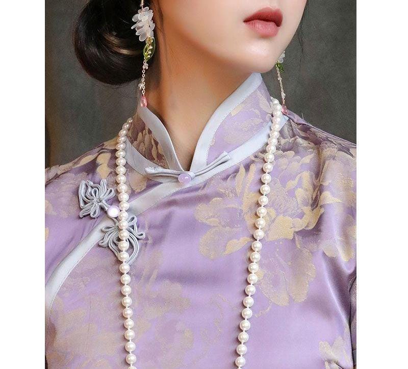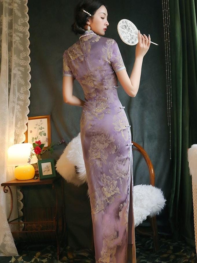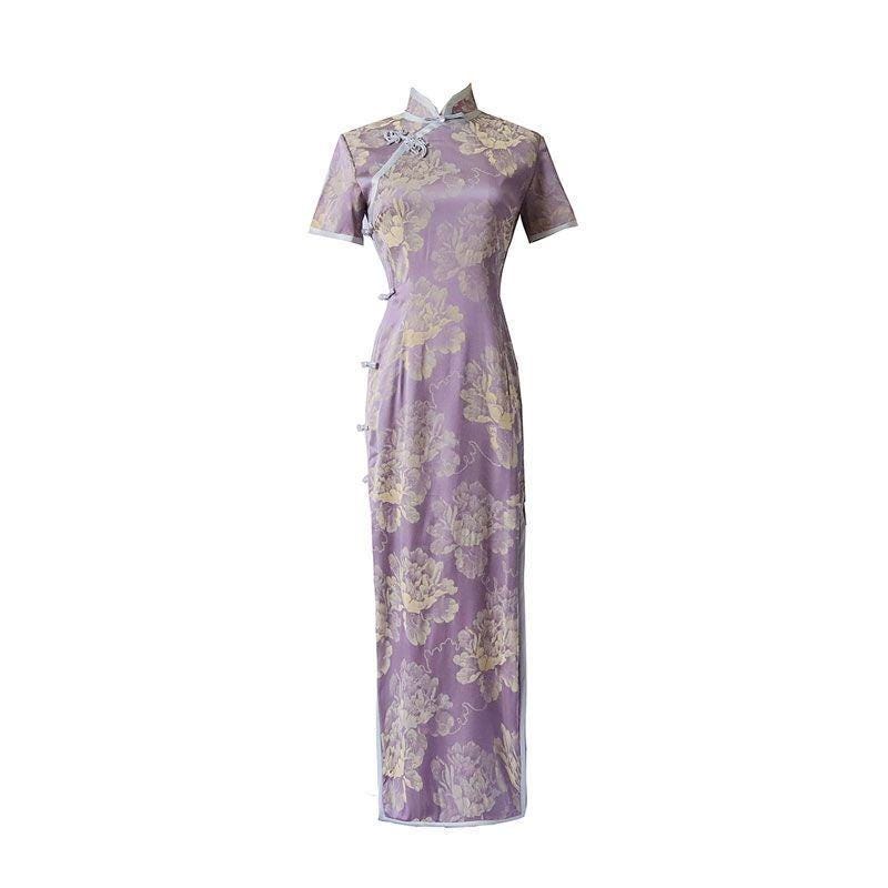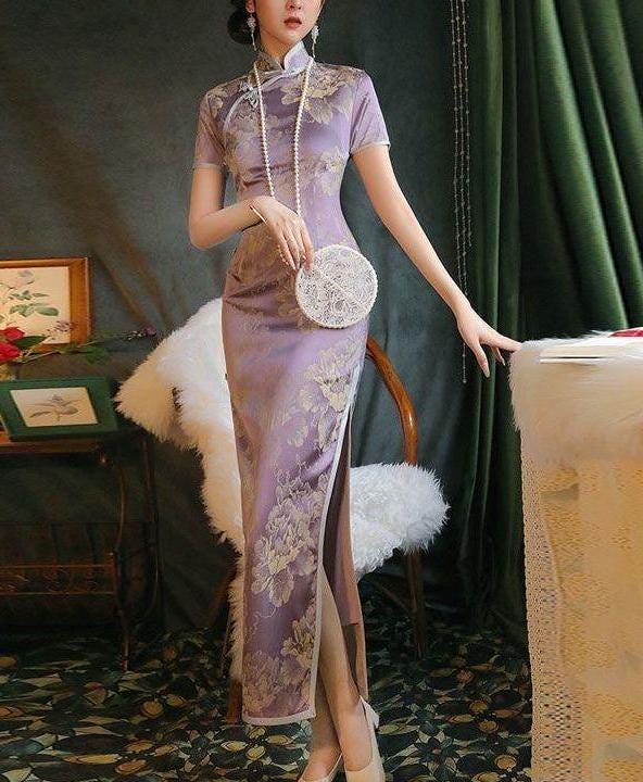 Lilac Acetate Jacquard Qipao Dress | Retro Purple Chinese Cheongsam | Elegant Oriental Party Dress | Women's Floral Cheongsam