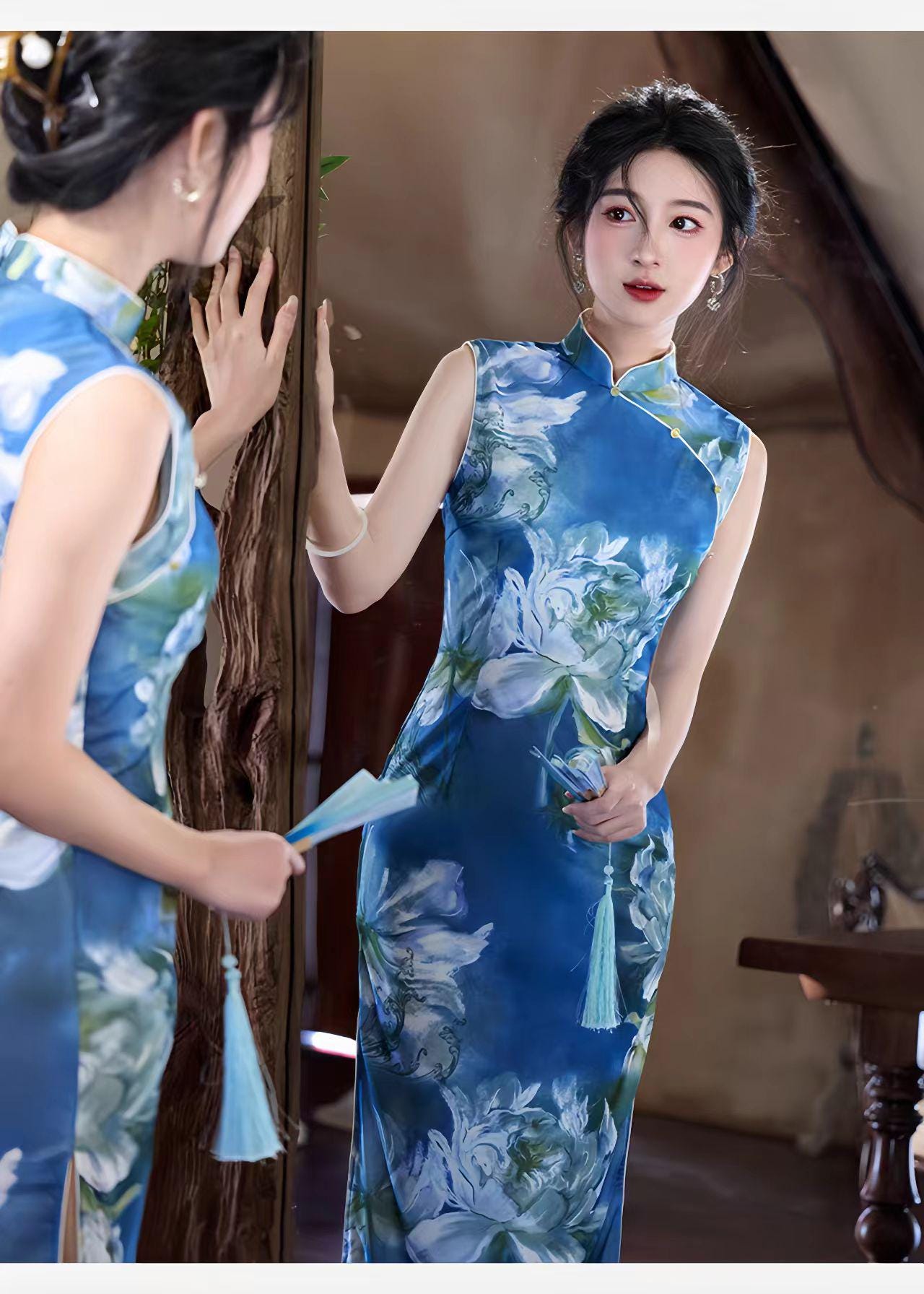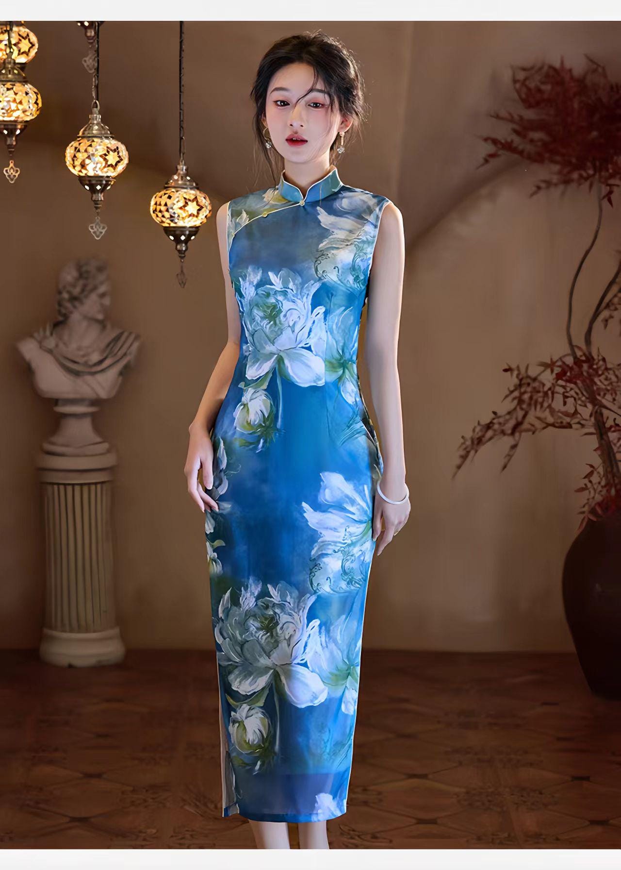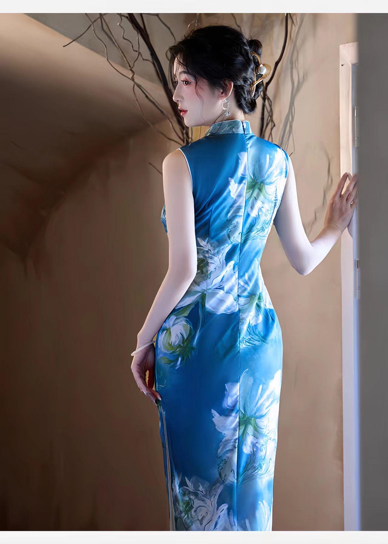 With its classic high Mandarin collar, side slits, and a fitted silhouette that ends below the knee (approx. 125 cm long), this cheongsam offers a perfect fusion of traditional charm and a modern, artistic feel.