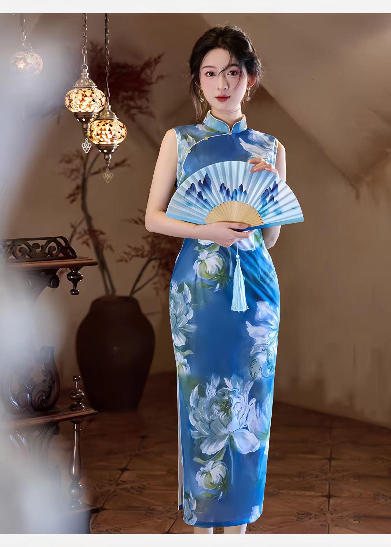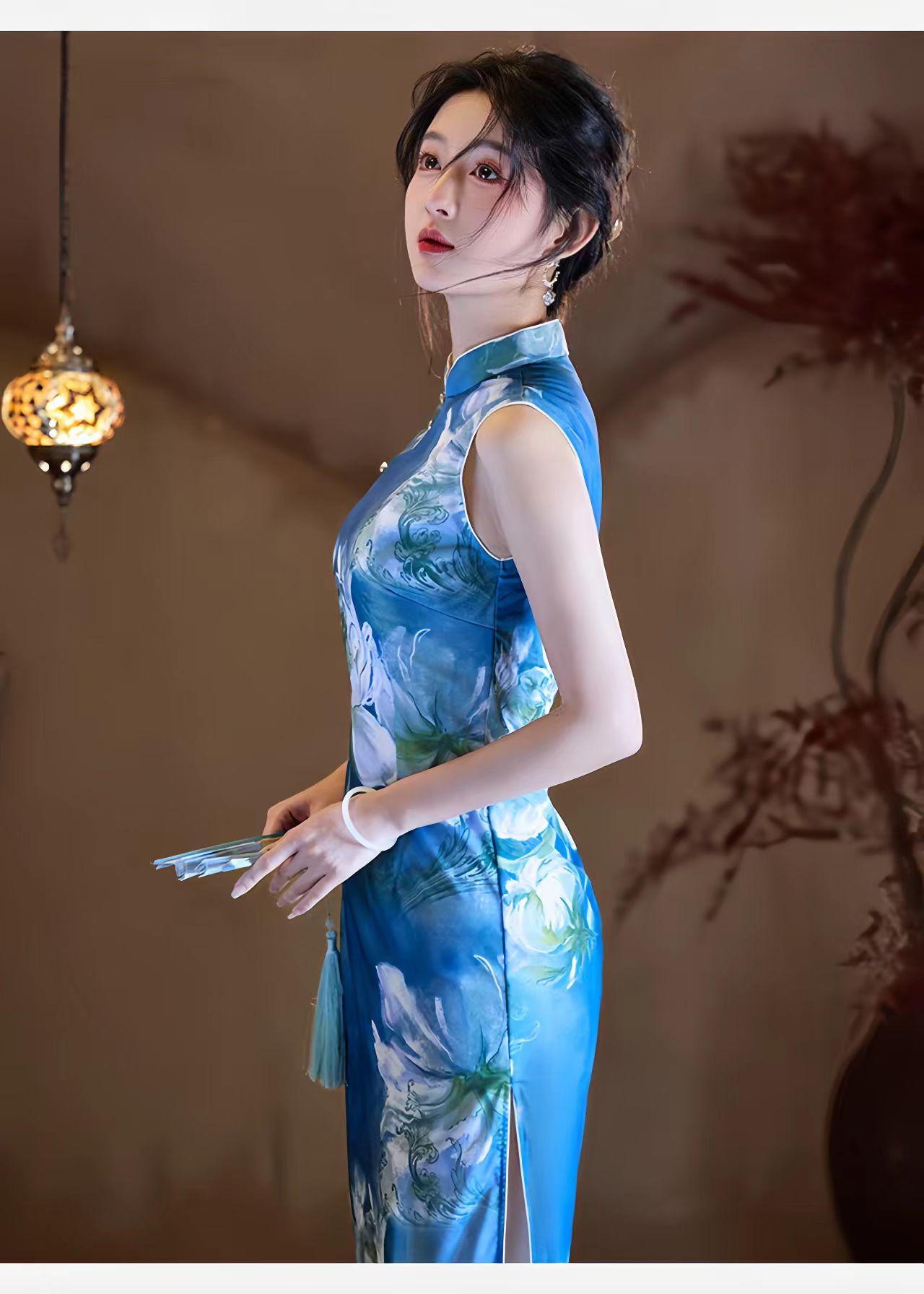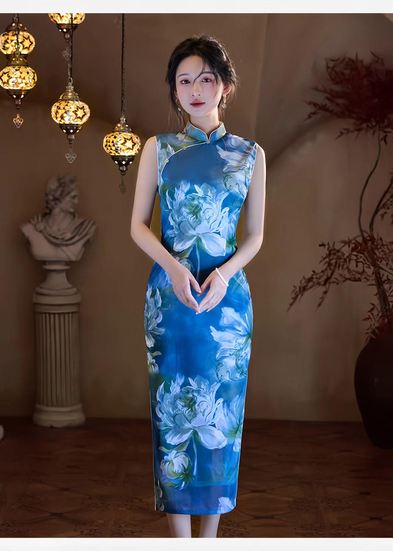 With its classic high Mandarin collar, side slits, and a fitted silhouette that ends below the knee (approx. 125 cm long), this cheongsam offers a perfect fusion of traditional charm and a modern, artistic feel.