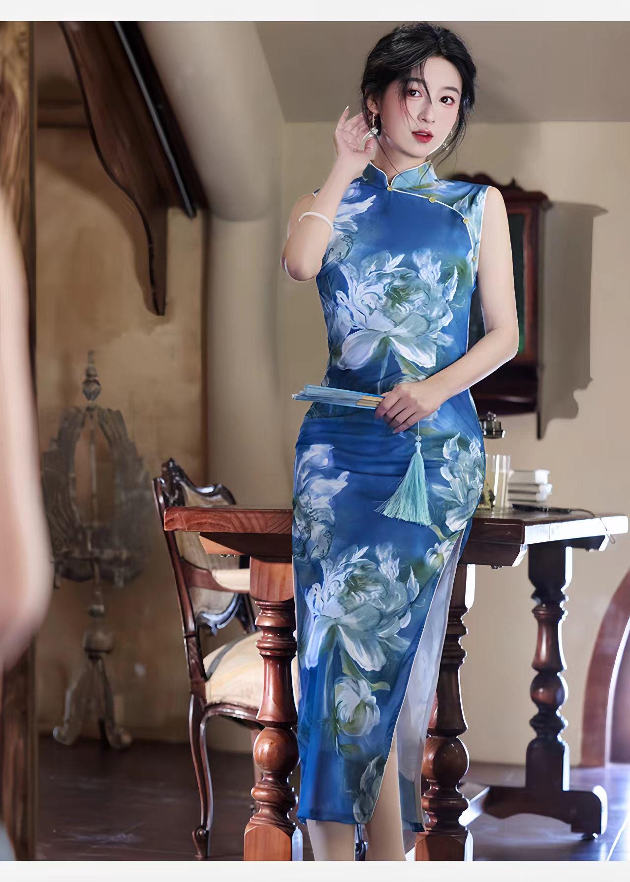 Blue Mesh Qipao Dress, Watercolor Floral Cheongsam, Modern Chinese Dress, Cultural Party Dress, Spring Summer Qipao, Gift for Her