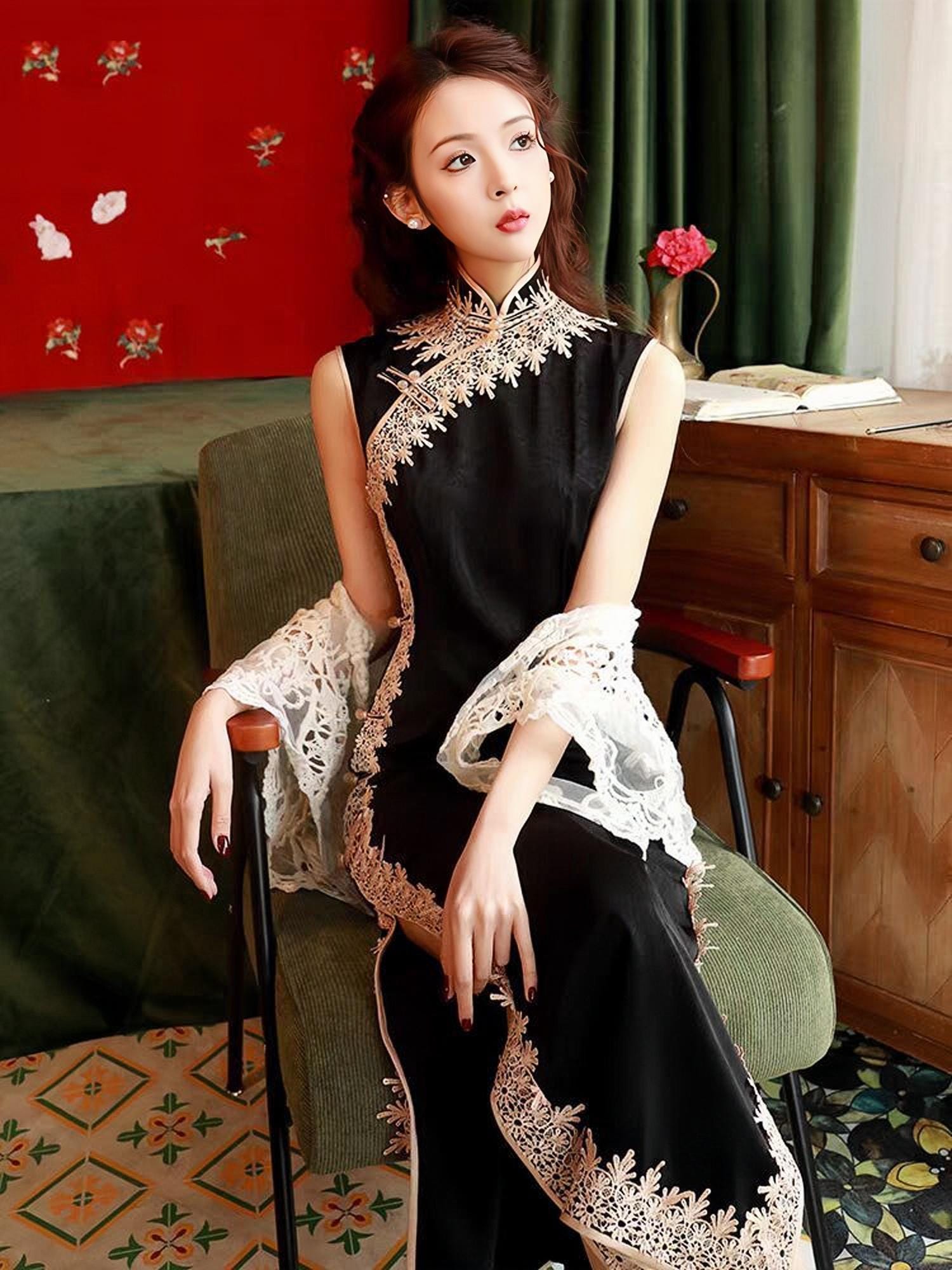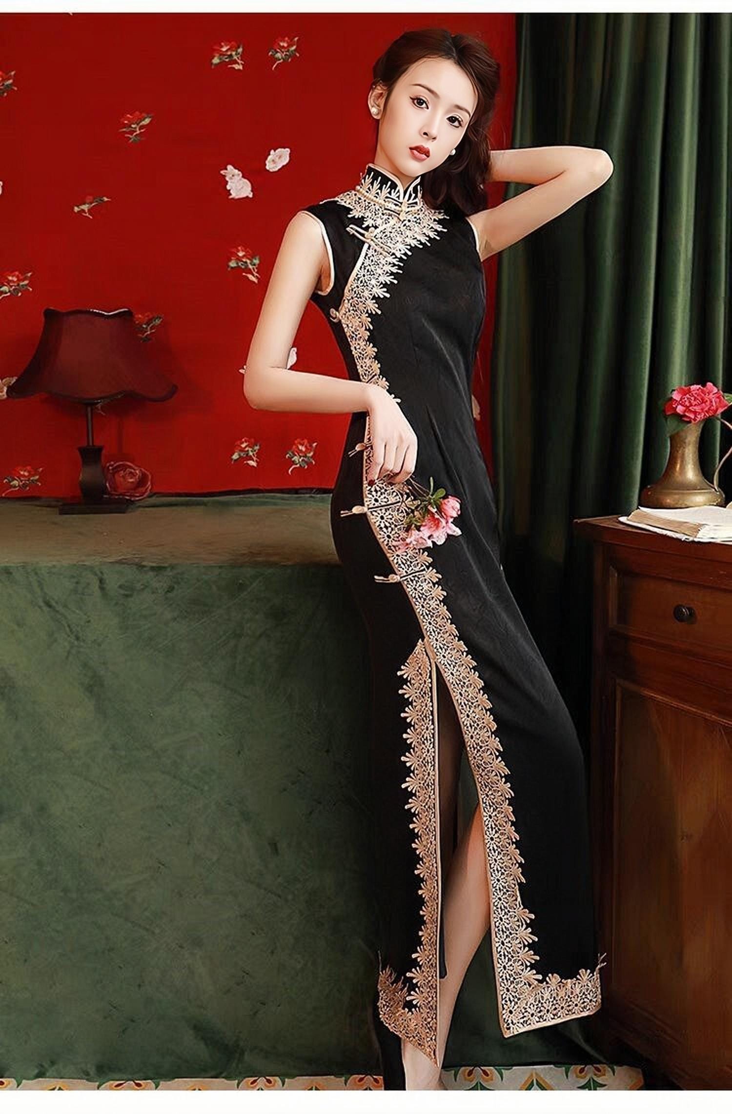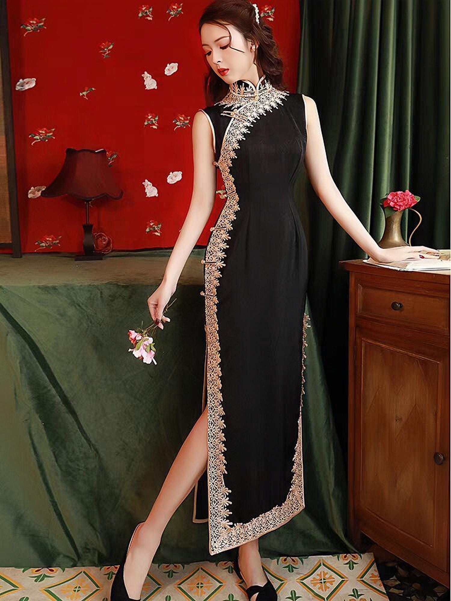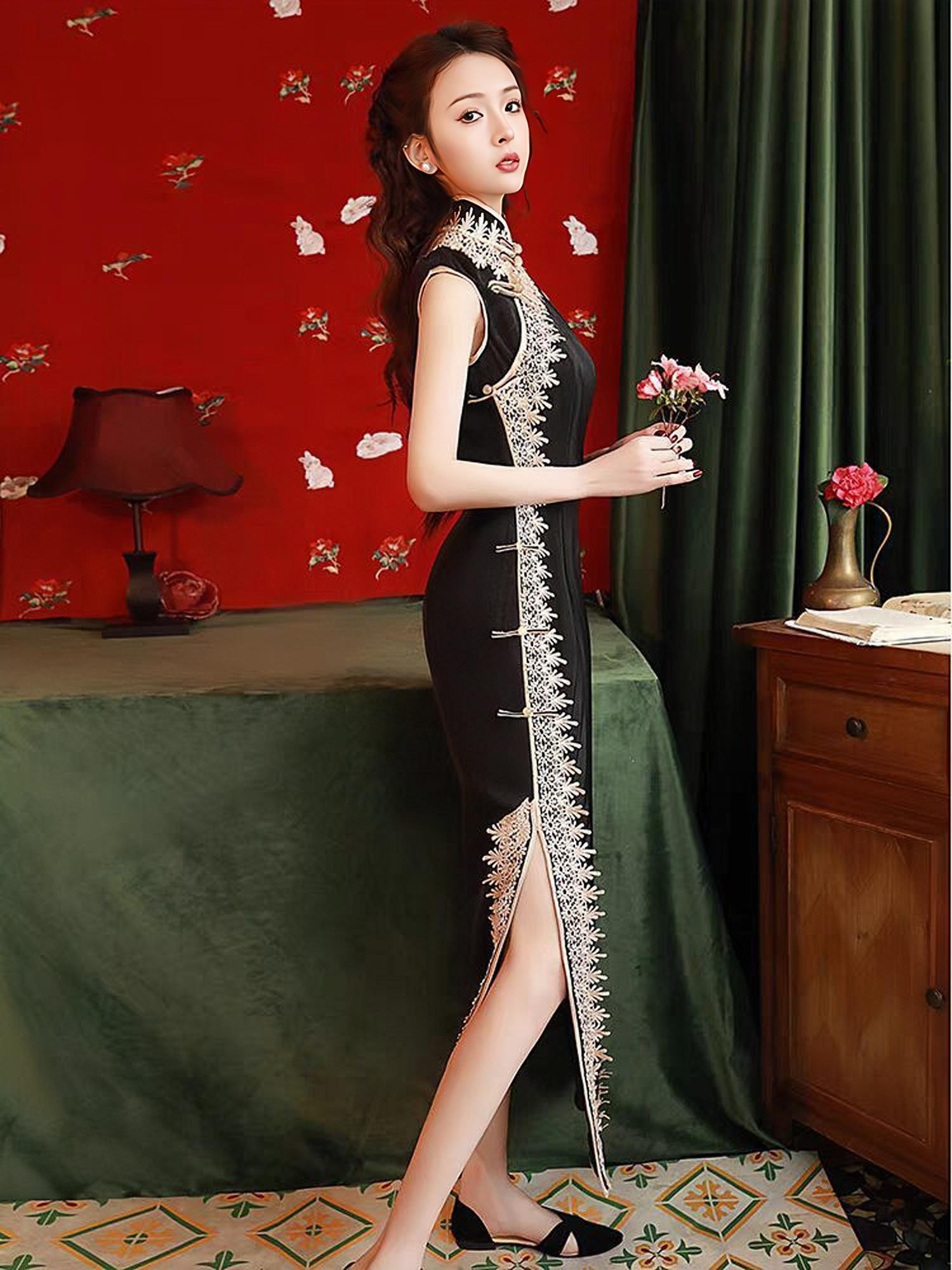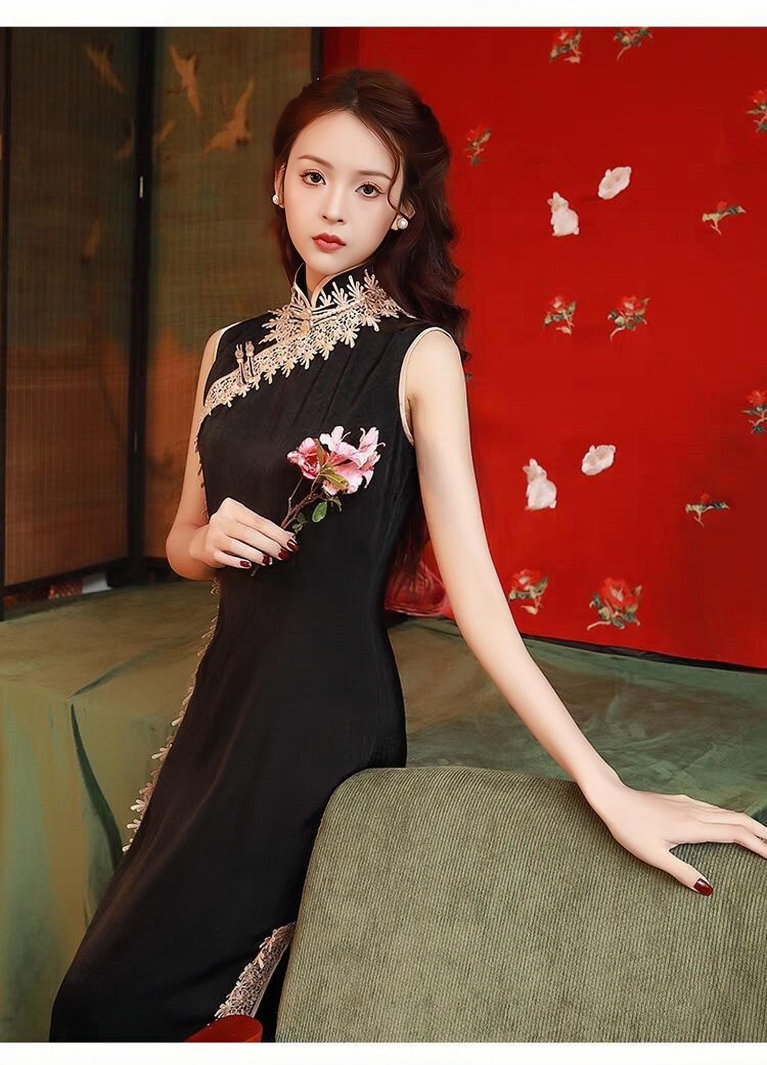 This black embroidered qipao dress combines retro Shanghainese glamour with modern sophistication. The fitted cut highlights the feminine silhouette, while the high slit design and artistic embroidery make it a stunning piece for parties, photoshoots, or special occasions.