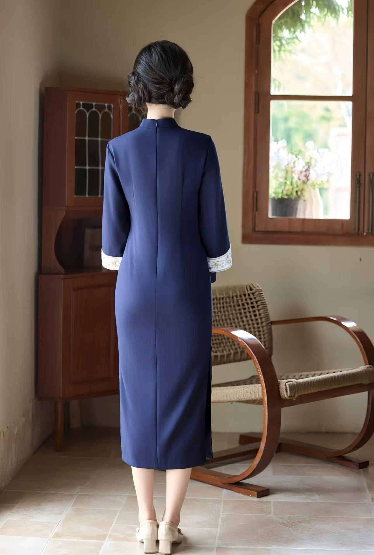 This elegant autumn qipao (cheongsam) is crafted from Tencel linen fabric, providing a fluid drape and comfort. Designed in a sophisticated navy blue with embroidered cuffs and delicate frog-style button closures, it perfectly blends traditional Chinese style with modern elegance. The high Mandarin collar, long sleeves, and 120 cm midi length (below the knee) create a refined silhouette ideal for cooler seasons. The side slit adds charm and mobility, making it a perfect dress for formal dinners, cultural events, autumn weddings, or elegant gatherings. A timeless oriental dress that exudes heritage and femininity.